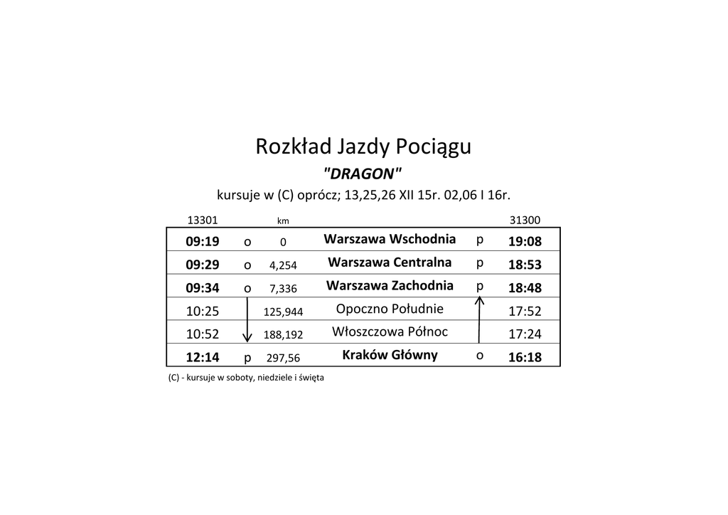 Rozkład Jazdy Pociągu "DRAGON" kursuje w (C) oprócz; 13,25,26 XII 15r. 02,06 I 16r. 13301 31300 km 09:19 o 0 Warszawa Wschodnia p 19:08 09:29 o 4,254 Warszawa Centralna p 18:53 09:34 o 7,336 Warszawa Zachodnia p 18:48 10:25 125,944 Opoczno Południe 17:52 10:52 188,192 Włoszczowa Północ 17:24 297,56 Kraków Główny 12:14 p (C) - kursuje w soboty, niedziele i święta o 16:18