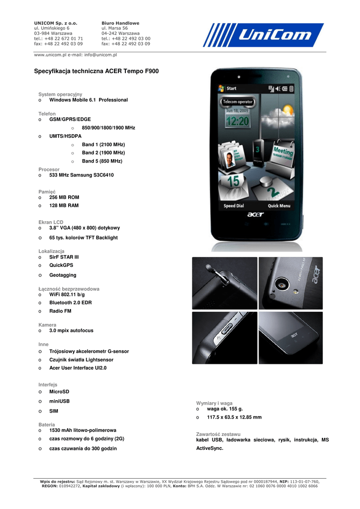 UNICOM Sp. z o.o. ul. Umińskiego 6 03-984 Warszawa tel.: +48 22 672 01 71 fax: +48 22 492 03 09 Biuro Handlowe ul. Marsa 56 04-242 Warszawa tel.: +48 22 492 03 00 fax: +48 22 492 03 09 www.unicom.pl e-mail: [email protected] Specyfikacja techniczna ACER Tempo F900 System operacyjny o Windows Mobile 6.1 Professional Telefon o GSM/GPRS/EDGE o o 850/900/1800/1900 MHz UMTS/HSDPA o Band 1 (2100 MHz) o Band 2 (1900 MHz) o Band 5 (850 MHz) Procesor o 533 MHz Samsung S3C6410 Pamięć o 256 MB ROM o 128 MB RAM Ekran LCD o 3.8” VGA (480 x 800) dotykowy o 65 tys. kolorów TFT Backlight Lokalizacja o SirF STAR III o QuickGPS o Geotagging Łączność bezprzewodowa o WiFi 802.11 b/g o Bluetooth 2.0 EDR o Radio FM Kamera o 3.0 mpix autofocus Inne o Trójosiowy akcelerometr G-sensor o Czujnik światła Lightsensor o Acer User Interface UI2.0 Interfejs o MicroSD o miniUSB o SIM Wymiary i waga o waga ok. 155 g. o Bateria o 1530 mAh litowo-polimerowa 117.5 x 63.5 x 12.85 mm o czas rozmowy do 6 godziny (2G) Zawartość zestawu kabel USB, ładowarka sieciowa, rysik, instrukcja, MS o czas czuwania do 300 godzin ActiveSync. Wpis do rejestru: Sąd Rejonowy m. st. Warszawy w Warszawie, XX Wydział Krajowego Rejestru Sądowego pod nr 0000187944, NIP: 113-01-07-760, REGON: 010942272, Kapitał zakładowy (i wpłacony): 100 000 PLN, Konto: BPH S.A. Oddz. W Warszawie nr: 02 1060 0076 0000 4010 1002 6066