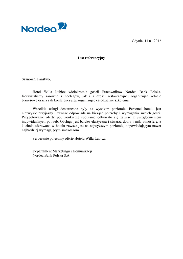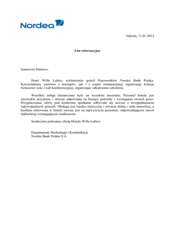 Gdynia, 11.01.2012 List referencyjny Szanowni Państwo, Hotel Willa Lubicz wielokrotnie gościł Pracowników Nordea Bank Polska. Korzystaliśmy zarówno z noclegów, jak i z części restauracyjnej organizując kolacje biznesowe oraz z sali konferencyjnej, organizując całodzienne szkolenia. Wszelkie usługi dostarczone były na wysokim poziomie. Personel hotelu jest niezwykle przyjazny i zawsze odpowiada na bieżące potrzeby i wymagania swoich gości. Przygotowanie oferty pod konkretne spotkanie odbywało się zawsze z uwzględnieniem indywidualnych potrzeb. Obsługa jest bardzo elastyczna i stwarza dobrą i miłą atmosferę, a kuchnia oferowana w hotelu zawsze jest na najwyższym poziomie, odpowiadającym nawet najbardziej wymagającym smakoszom. Serdecznie polecamy ofertę Hotelu Willa Lubicz. Departament Marketingu i Komunikacji Nordea Bank Polska S.A.