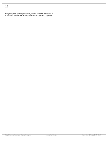 16 Biegnie pies przez pustynie, widzi drzewo i mówi: - Jeśli to znowu fatamorgana to mi pęcherz pęknie! http://humor.urbanski.org - Humor i rozrywka Powered by Mambo Generated: 2 March, 2017, 15:37