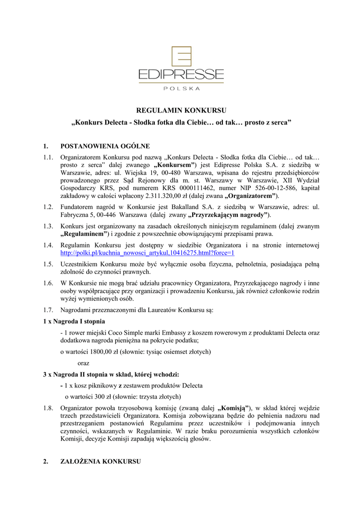 REGULAMIN KONKURSU „Konkurs Delecta - Słodka fotka dla Ciebie… od tak… prosto z serca” 1. POSTANOWIENIA OGÓLNE 1.1. Organizatorem Konkursu pod nazwą „Konkurs Delecta - Słodka fotka dla Ciebie… od tak… prosto z serca” dalej zwanego „Konkursem”) jest Edipresse Polska S.A. z siedzibą w Warszawie, adres: ul. Wiejska 19, 00-480 Warszawa, wpisana do rejestru przedsiębiorców prowadzonego przez Sąd Rejonowy dla m. st. Warszawy w Warszawie, XII Wydział Gospodarczy KRS, pod numerem KRS 0000111462, numer NIP 526-00-12-586, kapitał zakładowy w całości wpłacony 2.311.320,00 zł (dalej zwana „Organizatorem”). 1.2. Fundatorem nagród w Konkursie jest Bakalland S.A. z siedzibą w Warszawie, adres: ul. Fabryczna 5, 00-446 Warszawa (dalej zwany „Przyrzekającym nagrody”). 1.3. Konkurs jest organizowany na zasadach określonych niniejszym regulaminem (dalej zwanym „Regulaminem”) i zgodnie z powszechnie obowiązującymi przepisami prawa. 1.4. Regulamin Konkursu jest dostępny w siedzibie Organizatora i na stronie internetowej http://polki.pl/kuchnia_nowosci_artykul,10416275.html?force=1 1.5. Uczestnikiem Konkursu może być wyłącznie osoba fizyczna, pełnoletnia, posiadająca pełną zdolność do czynności prawnych. 1.6. W Konkursie nie mogą brać udziału pracownicy Organizatora, Przyrzekającego nagrody i inne osoby współpracujące przy organizacji i prowadzeniu Konkursu, jak również członkowie rodzin wyżej wymienionych osób. 1.7. Nagrodami przeznaczonymi dla Laureatów Konkursu są: 1 x Nagroda I stopnia - 1 rower miejski Coco Simple marki Embassy z koszem rowerowym z produktami Delecta oraz dodatkowa nagroda pieniężna na pokrycie podatku; o wartości 1800,00 zł (słownie: tysiąc osiemset złotych) oraz 3 x Nagroda II stopnia w skład, której wchodzi: - 1 x kosz piknikowy z zestawem produktów Delecta o wartości 300 zł (słownie: trzysta złotych) 1.8. Organizator powoła trzyosobową komisję (zwaną dalej „Komisją”), w skład której wejdzie trzech przedstawicieli Organizatora. Komisja zobowiązana będzie do pełnienia nadzoru nad przestrzeganiem postanowień Regulaminu przez uczestników i podejmowania innych czynności, wskazanych w Regulaminie. W razie braku porozumienia wszystkich członków Komisji, decyzje Komisji zapadają większością głosów. 2. ZAŁOŻENIA KONKURSU 2.1. Konkurs będzie przeprowadzony na stronach serwisu internetowego Polki.pl. Ogłoszenie o Konkursie ukaże się w dniu 07.04.2016 na stronie internetowej http://polki.pl/kuchnia_nowosci_artykul,10416275.html?force=1 2.2. Zbieranie zgłoszeń do Konkursu będzie trwało 07.04.2016 do 28.04.2016 r. i tylko w tym okresie można dokonywać zgłoszeń do Konkursu. 2.3 Rozwiązanie Konkursu, w tym lista Laureatów Konkursu, zostanie ogłoszone na stronie internetowej http://polki.pl/kuchnia_nowosci_artykul,10416275.html?force=1 w terminie nie później niż do dnia 06.05.2016 r. 3. ZASADY PROWADZENIA KONKURSU 3.1. W celu wzięcia udziału w Konkursie uczestnik powinien: 1) Udzielić odpowiedzi na zadanie konkursowe: Napisz w kilku zdaniach, komu, dlaczego, i w jakiej sytuacji podarowałaś/podarowałabyś swój słodki smakołyk? i wysłać odpowiedź za pomocą formularza zgłoszeniowego na stronie http://polki.pl/kuchnia_nowosci_artykul,10416275.html?force=1 oraz złożyć stosowne oświadczenia i udzielić stosownych zgód stanowiących integralną część formularza zgłoszeniowego; 2) Dodać zdjęcie „słodkiego co nieco”, które przygotowałaś/przygotowałabyś dla kogoś, kto jest dla Ciebie szczególnie ważny 3) Wypełnić formularz zgłoszeniowy i wysłać go do Organizatora za pomocą znajdującego się na dole formularza przycisku „Wyślij zgłoszenie” (zwanym dalej „Zgłoszeniem”) 3.2. Jeden uczestnik może wziąć udział w Konkursie tylko jeden raz i być Laureatem tylko jednej nagrody. 3.3. Spośród wszystkich poprawnie przesłanych Zgłoszeń, Komisja wybierze 4 najlepsze Zgłoszenia. Przy wyborze najlepszych Zgłoszeń Komisja będzie się kierować własnym uznaniem, biorąc pod uwagę walory artystyczne Zgłoszenia, w szczególności oryginalność i pomysłowość uczestnika – wykonawcy Zgłoszenia. Nie ma znaczenia kolejność zgłoszeń. 3.4. Laureatami Konkursu w liczbie 4 zostaną uczestnicy, których Zgłoszenia konkursowe zostaną uznane przez Komisję za najlepsze zgodnie z pkt 3.4 powyżej, zwani dalej „Laureatami”. Nagrody zostaną przyznane po spełnieniu warunków określonych w Regulaminie. 3.5. Uczestnik oświadcza, że Zgłoszenie jest unikalną treścią, stworzoną przez niego specjalnie w celu wzięcia udziału w Konkursie, jak również, że nie jest publikowane w innych serwisach internetowych. 3.6. Uczestnik niniejszym oświadcza, że: (i) jest jedynym autorem Zgłoszenia wysłanego przez niego do Konkursu; (ii) Zgłoszenie nie narusza praw osób trzecich; (iii) w przypadku, jeżeli Zgłoszenie stanowi utwór, w rozumieniu ustawy z dnia 4 lutego 1994 r. o prawie autorskim i prawach pokrewnych, przysługują mu autorskie prawa majątkowe do Zgłoszenia, w zakresie niezbędnym do udzielenia licencji, zgodnie z pkt 3.8 poniżej; (iv) Zgłoszenie nie stanowi opracowania w rozumieniu ustawy z dnia 4 lutego 1994 r. o prawie autorskim i prawach pokrewnych. 3.7. Najciekawsze zgłoszenia będą publikowane w podsumowaniu konkursu. 3.8. Zgłoszenia konkursowe nie spełniające wymogów Regulaminu będą wykluczane z Konkursu przez Organizatora. 3.9. Organizator oświadcza, że dane osobowe uczestnika w zakresie: imię i nazwisko, adres email, numer telefonu komórkowego i adres zamieszkania, będą przetwarzane przez Organizatora w celu realizacji umowy przystąpienia do Konkursu i jego prawidłowego przeprowadzenia lub marketingu bezpośredniego własnych produktów Organizatora. Organizator gwarantuje prawo wglądu uczestnika do jego danych osobowych i do ich poprawiania, jak również do żądania zaprzesta
