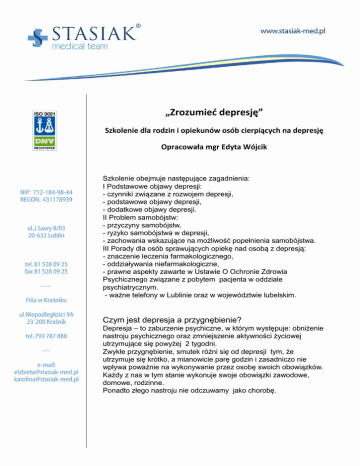 „Zrozumieć depresję” Szkolenie dla rodzin i opiekunów osób cierpiących na depresję Opracowała mgr Edyta Wójcik Szkolenie obejmuje następujące zagadnienia: I Podstawowe objawy depresji: - czynniki związane z rozwojem depresji, - podstawowe objawy depresji, - dodatkowe objawy depresji. II Problem samobójstw: - przyczyny samobójstw, - ryzyko samobójstwa w depresji, - zachowania wskazujące na możliwość popełnienia samobójstwa. III Porady dla osób sprawujących opiekę nad osobą z depresją: - znaczenie leczenia farmakologicznego, - oddziaływania niefarmakologiczne, - prawne aspekty zawarte w Ustawie O Ochronie Zdrowia Psychicznego związane z pobytem pacjenta w oddziale psychiatrycznym. - ważne telefony w Lublinie oraz w województwie lubelskim. Czym jest depresja a przygnębienie? Depresja – to zaburzenie psychiczne, w którym występuje: obniżenie nastroju psychicznego oraz zmniejszenie aktywności życiowej utrzymujące się powyżej 2 tygodni. Zwykłe przygnębienie, smutek różni się od depresji tym, że utrzymuje się krótko, a mianowicie parę godzin i zasadniczo nie wpływa poważnie na wykonywanie przez osobę swoich obowiązków. Każdy z nas w tym stanie wykonuje swoje obowiązki zawodowe, domowe, rodzinne. Ponadto złego nastroju nie odczuwamy jako chorobę. PODSTAWOWE OBJAWY DEPRESJI Czynniki związane z rozwojem depresji Psychologiczne: -strata osoby bliskiej (na skutek śmierci , odejście partnera), -niepowodzenia materialne (bankructwo, klęska żywiołowa), -zawody emocjonalne (zawód miłosny, konflikty rodzinne/osobiste), -zmiana środowiska (zmiana pracy, a czasami sukces, wyjazd za pracą do innego państwa lub województwa, zmiana szkoły). Biologiczne: -prawdopodobnie uwarunkowane genetyczne (depresja występuje kilka razy częściej u osób blisko spokrewnionych), -schorzenia somatyczne: nowotwory złośliwe, reumatoidalne zapalenie stawów, toczeń rumieniowaty, uszkodzenie nerek, wątroby, AIDS, zaburzenia hormonalne i przemiany materii (cukrzyca, nadczynność lub niedoczynność tarczycy, przytarczyc, okres porodu, przekwitania), -choroby i schorzenia układu nerwowego: choroba Alzheimera, Parkinsona, stwardnienie rozsiane, guzy mózgu, miażdżyca naczyń mózgowych, padaczka, urazy czaszki, Spowodowane zażywaniem leków i uzależnieniem: -stosowanie niektórych leków i substancji chemicznych: doustne środki antykoncepcyjne, leki p/nowotworowe, p/parkinsonowskie, p/gruźlicze, rezerpina, amfetamina, -różnego rodzaju uzależnienia: alkohol, leki, narkotyki. Społeczne: -niska pozycja społeczna, -wychowywanie dzieci przez dziadków, -separacja/rozwód rodziców, -ciężkie, wielokrotne nadużycia seksualne, -brak wsparcia społecznego/osamotnienie, -niekorzystne wydarzenia życiowe (śmierć współmałżonka, utrata pracy, stres w pracy), -patologiczna zależność od osoby nadużywającej alkohol, narkotyki. Obniżenie nastroju – odczuwane jako: stan smutku, przygnębienia i zobojętnienia, niemożność odczuwania radości, szczęścia, satysfakcji. Występuje poczucie winy, bezwartościowości, samooskarżanie się o różne niepowodzenia. Następuje zmniejszenie zainteresowania każdą dziedziną życia, brak energii, zwiększona męczliwość. Charakterystyczne jest nasilenie obniżenia nastroju tzw. ,, dołek” w godzinach rannych, a wieczorem lepsze samopoczucie. Czasami depresja przekształca się w agresję, skierowaną przeciwko sobie, bądź innym ludziom. Obniżenie aktywności życiowej, utrata zainteresowań- objawiająca się w: spowolniałym myśleniu, słabej koncentracji i osłabieniem pamięci, spowolnieniem poruszania się nawet do całkowitego zahamowania ruchowego. U niektórych chorych w miejsce zahamowania ruchowego pojawia się podniecenie ruchowe. Poza tym chorzy odczuwają utratę energii, siły. Objawy somatyczne – przejawiają się w: zaburzeniach snu i czuwania, bólach głowy, zaburzeniach miesiączkowania u kobiet, zaparciach, wysychaniu błon śluzowych w jamie ustnej, osłabieniu popędu płciowego. Jeśli chodzi o zaburzenia snu i czuwania można wyróżnić 2 warianty: - pierwszy charakteryzuje się zmniejszeniem ilości snu nocnego oraz jego spłyceniem, co przejawia się we wczesnym budzeniu, snem płytkim i przerywanym; - drugi cechuje się zwiększoną potrzebą snu w ciągu dnia, natomiast sen nocny nie ulega większym zaburzeniom. Objawy dodatkowe depresji Nieracjonalne poczucie oceny rzeczywistości- pacjent negatywnie ocenia własną osobę, zdrowie, pomyślność leczenia, przyszłość, przeszłość, ma poczucie winy, kary, grzeszności. Inaczej mówiąc pojawiają się urojenia: hipochondryczne, kary, klęski, winy. Urojenia są zaburzeniami myślenia, a osoba, która doznaje wspomnianych zaburzeń jest głęboko przekonana o ich prawdziwości. Może na przykład myśleć, że choruje na poważną chorobę, że jej narządy wewnętrzne uległy zdeformowaniu, bądź są w zaniku albo, że jest winna i musi ponieść karę, nie zasługuje na uwagę ze strony najbliższych. Treść urojeń jest zawsze niezgodna z otaczającą chorego rzeczywistością. Zaburzenia sprawności intelektualnej- przejawiają się w: osłabieniu koncentracji uwagi, łatwym rozpraszaniu się, spowolniałym tempie myślenia, pojawiają się kłopoty z pamięcią. Nawracające myśli rezygnacyjne- są to myśli o: odebraniu sobie życia, że nie warto żyć, o sposobie realizacji swoich zamierzeń, poczucie beznadziejności. Zaburzenia łaknienia-objawiają się: zmniejszonym apetytem, rzadko występuje zwiększenie ilości spożywanego jedzenia. Naturalnym skutkiem jest utrata masy ciała, sporadycznie tycie. Zaburzenia seksualne- przeważnie jest utrata zainteresowań sprawami seksu, obniżenie aktywności seksualnej. Lęk- lęk odczuwany jako poczucie zagrożenia, napięcia psychicznego, może ujawnić się w podnieceniu ruchowym. Lęk prawie zawsze towarzyszy depresji, jest objawem najtrudniejszy
