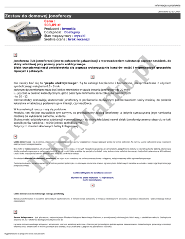 Informacje o produkcie Utworzono 02-03-2017 Zestaw do domowej Jonoforezy Cena : 503,09 zł Producent : Inventia Dostępność : Dostępny Stan magazynowy : wysoki Średnia ocena : brak recenzji .p l Jonoforeza (lub jontoforeza) jest to połączenie galwanizacji z wprowadzaniem substancji poprzez naskórek, do skóry właściwej przy pomocy prądu elektrycznego. Efekt transdermalności zwielokrotnia się poprzez wykorzystanie kanałów wejść i wyprowadzeń gruczołów łojowych i potowych. ar kt Nie należy bać się tu "prądu elektrycznego". Są to zabiegi bezpieczne i bezbolesne, przeprowadzane z użyciem symbolicznego natężenia 0.5 - 3 mA. Jedynym dyskomfortem może być lekkie mrowienie w czasie trwania jonoforezy (do 20 min) i... jej cena w salonie kosmetycznym, gdzie poza tym minimalna seria zabiegów skutecznych - to 10 - 12. Dermatolodzy zestawiają skuteczność jonoforezy w porównaniu ze zwykłym posmarowaniem skóry maścią, do podania lekarstwa w tabletce,a podaniem go w iniekcji, czy kroplówce. te r M W kosmetologii rzeczy mają sią podobnie. Produkt, ten nie jest oczywiście tym samym, co profesjonalny zabieg jonoforezy, a jedynie sympatyczną jego namiastką możliwą do wykonania samemu, w domu. Skuteczność oddziaływania substancji wprowadzanych do skóry właściwej nawet dzięki jonoforetycznemu otwarciu w taki sposób porów naskórka - rośnie jednak spektakularnie. Dotyczy to również składowych helisy kolagenowej. Listki elektryczne - są to cienkie, elastyczne i niezwykle proste w użyciu "urządzenia", mogące zastąpić wizytę na farmie piękności. Po zużyciu są one całkowicie (wraz z ogniwem elektrycznym) biodegradowalne. In Dwa listki w każdej saszetce, obejmujące anatomicznie okolice oczu, w których najszybciej pojawiają się zmarszczki, zaopatrzone zostały w niewielką płaską baterię, stanowiącą źródło prądu elektrycznego o małym natężeniu. W górnej części listka znajduje się specjalny hydrożel, który jednocześnie rozluźnia korneocyty i daje efekt galwaniczny. W środkowej części listka znajduje się bateria, a dolna część służy do zamknięcia obiegu. Po nałożeniu Listków do domowej jonoforezy, na rejon oczu - narażony na zmiany zmarszczkowe - osiągamy, natychmiastowy efekt ogniwa elektrycznego. Zamknięcie obwodu pozwala wytworzyć w skórze gradient potencjału, co niezwykle skutecznie otwiera ogromną ilość dodatkowych kanałów w naskórku, zwiększając kapitalnie jego przepuszczalność. Listki elektryczne to światowa nowość! Używane są przez najlepsze - z najlepszych, marki kosmetyczne. Listki elektryczne do domowego zabiegu jonoforezy Należy przechowywać w szczelnie zamkniętych opakowaniach, w temperaturze pokojowej, w miejscu niedostępnym dla dzieci. Zaprzestać stosowania - jeśli powodują reakcje niepożądane. Serum kolagenowe - jest pierwszym, najcenniejszym filtratem Kolagenu Naturalnego Platinum, o zmniejszonej sublimacyjnie ilości wody, z dodatkiem retinylu (biologicznie aktywna wit. A) i tokoferolu (biologicznie aktywna wit. E). Łączenie roztworu wodnego kolagenu z witaminami, nie było wcześniej wskazane. Obecnie jest już dostępna jednak wysoka, zaawansowana biotechnologia, pozwalająca zamknąć witaminy wraz z nośnikami w mikrokapsułkach (bio esferas), skąd uwalniane są dopiero na powierzchni naskórka. Wygenerowano w programie www.oscGold.com Laboratorium Inventii opracowało Serum Kolagenowe już w 2006 roku! Serum Kolagenowe zaskakuje koneserów Kolagenu Naturalnego Inventia swoim składem. W znanym i podbijającym świat, żelu Kolagenowym Platinum (o odwodnionej strukturze i pochodzącym z "pierwszego tłoczenia") pływają intrygujące, niebieskie mikrokapsułki. Zawierają najlepsze formuły czynnych biologicznie witamin: E (estry alfa-tokoferolu) i A (retinyl palmitate) oraz najlepszej jakości nośniki. Ich powłoka skomponowana ze związków celulozy (błonnika) i barwiona ultramaryną, nie daje się rozkładać kwasowi mlekowemu, obecnemu w kolagenowym hydracie. Niemożliwe jest to z uwagi na ochronę potrójnej helisy kolagenowej - emulgowanie z Kolagenem Naturalnym: estrów, retinoidów, enzymów, alkoholi i większości kwasów, wynalezienie mikrokapsułek, które uwalniają swoją zawartość dopiero na powierzchni epidermy - otwiera również dla polskiego kolagenu rybiego - nowe możliwości. Nie jest wykluczone, że ta technologia pozwoli stworzyć na bazie uznanej już rewelacji - kolagenu z ryb - nowej generacji kosmetyki. Serum Kolagenowe jest preparatem o silnie zwiększonej efektywności działania przeciwzmarszczkowego w stosunku do Kolagenu Naturalnego Inventia. Pozostałość suchej masy tego preparatu jest istotnie większa. W uproszczeniu mówiąc, Serum zawiera też więcej "kolagenu w kolagenie", plus dodatkowe substancje aktywne i dodatkowe nośniki. Pełna, efektywna transepidermalność tego produktu - następuje dopiero, przy aplikacji na skórę - po jonoforezie lub bezpośrednio po peelingu. I tylko wtedy zaleca się Serum aplikować. .p l Już sam 20 minutowy zabieg domowej jonoforezy wygładza optycznie zmarszczki w okolicach oczu. Zwiększona w Serum Kolagenowym dawka peptydów powoduje uaktywnienie fibroblastów do syntezy kolagenu, nawilżenie, odżywienie i napięcie skóry. Efekt ten utrzymuje się przez kilka godzin. Powtórzenie domowego zabiegu jonoforezy pięciokrotnie - pozwala utrwalić go nawet do kilku miesięcy. W trakcie prac nad wdrożeniem produktu z Zestawu do domowej jonoforezy, po raz pierwszy - korzystaliśmy z tak zaawansowanych testów i badań na neutralnej grupie probantów. Bezspornie, kwalifikują one te produkty, do sektora Kosmetologii Elitarnej. ar kt Testy zlecone przez Inventię wykazały, że sama aplikacja Serum Kolagenowego, spłyca zmarszczki o 14,2%. Z kolei nakładanie Serum Kolagenowego bezpośrednio po domowej jonoforezie spłyca zmarszczki w okolicach oczu o 55,3%. Pięciokrotne tego po