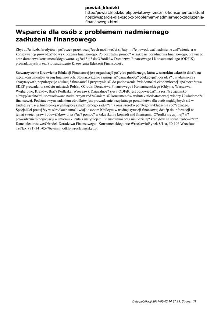 powiat_klodzki http://powiat.klodzko.pl/powiatowy-rzecznik-konsumenta/aktual nosci/wsparcie-dla-osob-z-problemem-nadmiernego-zadluzeniafinansowego.html Wsparcie dla osób z problemem nadmiernego zadłużenia finansowego Zbyt du?a liczba kredytów i po?yczek przekraczaj?cych mo?liwo?ci sp?aty mo?e powodowa? nadmierne zad?u?enie, a w konsekwencji prowadzi? do wykluczenia finansowego. Po bezp?atn? pomoc? w zakresie poradnictwa finansowego, prawnego oraz doradztwa konsumenckiego warto zg?osi? si? do O?rodków Doradztwa Finansowego i Konsumenckiego (ODFiK) prowadzonych przez Stowarzyszenie Krzewienia Edukacji Finansowej . Stowarzyszenie Krzewienia Edukacji Finansowej jest organizacj? po?ytku publicznego, która w szerokim zakresie dzia?a na rzecz konsumentów us?ug finansowych. Stowarzyszenie zajmuje si? dzia?alno?ci? edukacyjn?, doradcz? , wydawnicz? i charytatywn?, popularyzuje edukacj? finansow? i przyczynia si? do podnoszenia ?wiadomo?ci ekonomicznej spo?ecze?stwa. SKEF prowadzi w sze?ciu miastach Polski, O?rodki Doradztwa Finansowego i Konsumenckiego (Gdynia, Warszawa, Wejherowo, Kraków, Bia?a Podlaska, Wroc?aw). Dzia?alno?? sieci ODFiK jest odpowiedzi? na rosn?ce zjawisko niewyp?acalno?ci, spowodowane nadmiernym zad?u?aniem si? konsumentów wskutek niedostatecznej wiedzy i ?wiadomo?ci finansowej. Podstawowym zadaniem o?rodków jest prowadzenie bezp?atnego poradnictwa dla osób znajduj?cych si? w trudnej sytuacji finansowej wynikaj?cej z nadmiernego zad?u?enia oraz szeroko poj?tego wykluczenia spo?ecznego. Specjali?ci pracuj?cy w o?rodkach umo?liwiaj? osobom b?d?cym w trudnej sytuacji finansowej dost?p do informacji na temat swoich praw i obowi?zków oraz s?u?? pomoc? w odzyskaniu kontroli nad finansami. O?rodki nie zajmuj? si? prowadzeniem negocjacji w imieniu klienta z instytucjami finansowymi oraz nie udzielaj? kredytów na sp?at? zobowi?za?. Dane teleadresowe:O?rodek Doradztwa Finansowego i Konsumenckiego we Wroc?awiu Rynek 8/1 a, 50-106 Wroc?aw Tel/fax. (71) 341-05-76e-mail: [email protected] Data publikacji 2017-03-02 14:37:19, Strona: 1/1