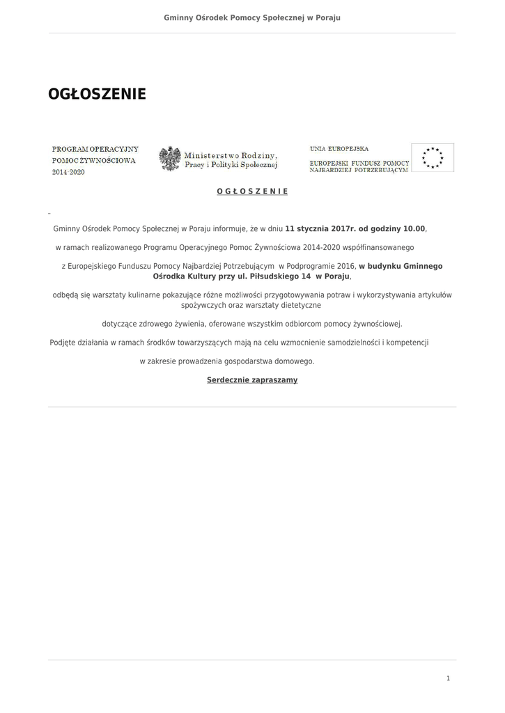 Gminny Ośrodek Pomocy Społecznej w Poraju OGŁOSZENIE OGŁOSZENIE Gminny Ośrodek Pomocy Społecznej w Poraju informuje, że w dniu 11 stycznia 2017r. od godziny 10.00, w ramach realizowanego Programu Operacyjnego Pomoc Żywnościowa 2014-2020 współfinansowanego z Europejskiego Funduszu Pomocy Najbardziej Potrzebującym w Podprogramie 2016, w budynku Gminnego Ośrodka Kultury przy ul. Piłsudskiego 14 w Poraju, odbędą się warsztaty kulinarne pokazujące różne możliwości przygotowywania potraw i wykorzystywania artykułów spożywczych oraz warsztaty dietetyczne dotyczące zdrowego żywienia, oferowane wszystkim odbiorcom pomocy żywnościowej. Podjęte działania w ramach środków towarzyszących mają na celu wzmocnienie samodzielności i kompetencji w zakresie prowadzenia gospodarstwa domowego. Serdecznie zapraszamy 1