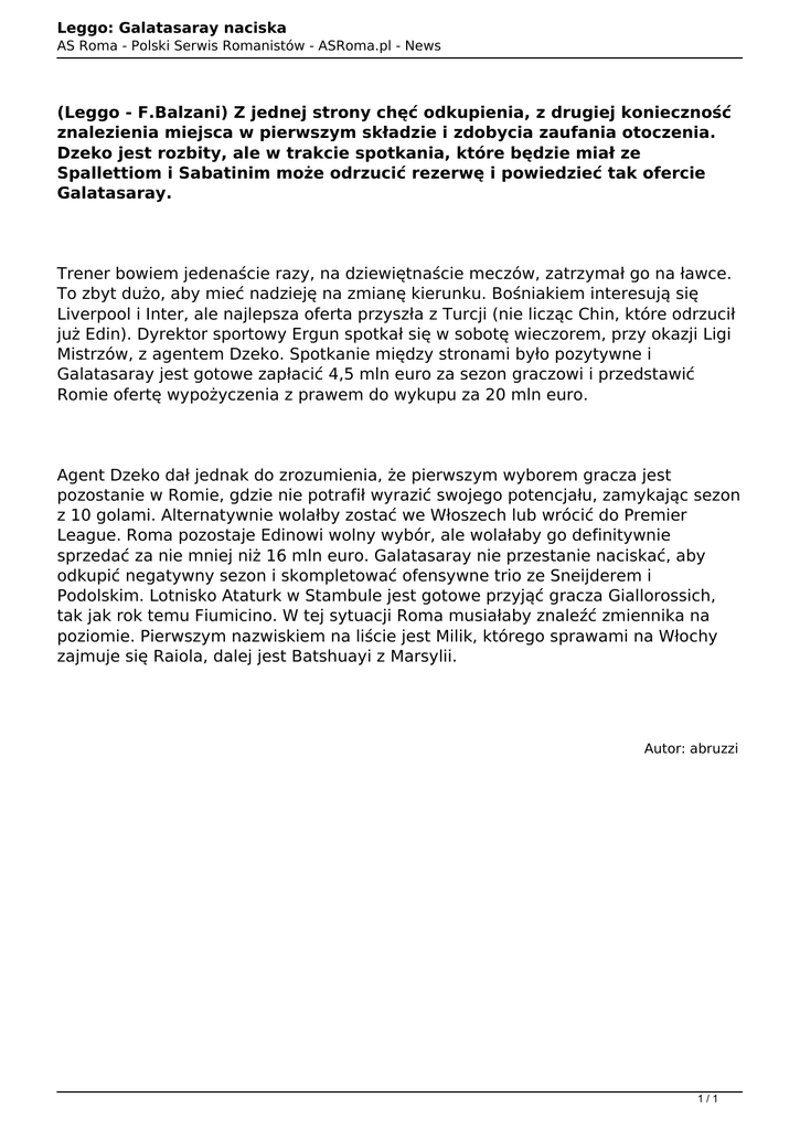 Leggo: Galatasaray naciska AS Roma - Polski Serwis Romanistów - ASRoma.pl - News (Leggo - F.Balzani) Z jednej strony chęć odkupienia, z drugiej konieczność znalezienia miejsca w pierwszym składzie i zdobycia zaufania otoczenia. Dzeko jest rozbity, ale w trakcie spotkania, które będzie miał ze Spallettiom i Sabatinim może odrzucić rezerwę i powiedzieć tak ofercie Galatasaray. Trener bowiem jedenaście razy, na dziewiętnaście meczów, zatrzymał go na ławce. To zbyt dużo, aby mieć nadzieję na zmianę kierunku. Bośniakiem interesują się Liverpool i Inter, ale najlepsza oferta przyszła z Turcji (nie licząc Chin, które odrzucił już Edin). Dyrektor sportowy Ergun spotkał się w sobotę wieczorem, przy okazji Ligi Mistrzów, z agentem Dzeko. Spotkanie między stronami było pozytywne i Galatasaray jest gotowe zapłacić 4,5 mln euro za sezon graczowi i przedstawić Romie ofertę wypożyczenia z prawem do wykupu za 20 mln euro. Agent Dzeko dał jednak do zrozumienia, że pierwszym wyborem gracza jest pozostanie w Romie, gdzie nie potrafił wyrazić swojego potencjału, zamykając sezon z 10 golami. Alternatywnie wolałby zostać we Włoszech lub wrócić do Premier League. Roma pozostaje Edinowi wolny wybór, ale wolałaby go definitywnie sprzedać za nie mniej niż 16 mln euro. Galatasaray nie przestanie naciskać, aby odkupić negatywny sezon i skompletować ofensywne trio ze Sneijderem i Podolskim. Lotnisko Ataturk w Stambule jest gotowe przyjąć gracza Giallorossich, tak jak rok temu Fiumicino. W tej sytuacji Roma musiałaby znaleźć zmiennika na poziomie. Pierwszym nazwiskiem na liście jest Milik, którego sprawami na Włochy zajmuje się Raiola, dalej jest Batshuayi z Marsylii. Autor: abruzzi 1/1 Powered by TCPDF (www.tcpdf.org)