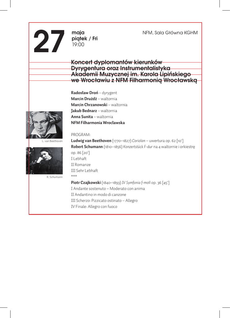27 maja piątek / Fri 19:00 NFM, Sala Główna KGHM Koncert dyplomantów kierunków Dyrygentura oraz Instrumentalistyka Akademii Muzycznej im. Karola Lipińskiego we Wrocławiu z NFM Filharmonią Wrocławską Radosław Droń – dyrygent Marcin Drużdż – waltornia Marcin Chrzanowski – waltornia Jakub Bednarz – waltornia Anna Sunita – waltornia NFM Filharmonia Wrocławska L. van Beethoven R. Schumann PROGRAM: Ludwig van Beethoven (1770–1827) Coriolan – uwertura op. 62 [10'] Robert Schumann (1810–1856) Konzertstück F-dur na 4 waltornie i orkiestrę op. 86 [20'] I Lebhaft II Romanze III Sehr Lebhaft *** Piotr Czajkowski (1840–1893) IV Symfonia f-moll op. 36 [45'] I Andante sostenuto – Moderato con anima II Andantino in modo di canzone III Scherzo: Pizzicato ostinato – Allegro IV Finale: Allegro con fuoco Omówienie Piotr Matwiejczuk (Program 2 Polskiego Radia) Konzertstück F-dur na cztery waltornie i orkiestrę op. 86 to dzieło powstałe w „najbardziej owocnym okresie życia” Roberta Schumanna według jego własnych słów. Trudno powiedzieć, dlaczego kompozytor nie nazwał tego utworu po prostu „koncertem”, gdyż Konzertstück spełnia wszystkie wymogi tego gatunku. Mimo wielkiej urody i oryginalności kompozycja była przez lata traktowana lekceważąco – jak zresztą większość twórczości orkiestrowej Schumanna. Autor Mirtów przez współczesnych uważany był przede wszystkim za autora genialnych pieśni oraz miniatur fortepianowych, sądzono, że jego symfonika czy koncerty nie dorównują gigantom na tym polu: Beethovenowi, Brahmsowi, Schubertowi czy Mendelssohnowi. Tymczasem twórca „Symfonii wiosennej", którego życie naznaczone chorobą, ale i miłością oraz szczęściem rodzinnym, o wyjątkowo smutnym, przedwczesnym finale, należy do najbardziej poruszających biografii epoki romantyzmu, zasługuje na własne miejsce w panteonie muzycznym nie tylko jako miniaturzysta czy znakomity krytyk, ale również jako symfonik, posługujący się swoją własną paletą barw orkiestrowych, może istotnie nie tak spektakularną, jak u jego mistrzów, a jednak subtelną i charakterystyczną. Cztery rogi, instrumenty tradycyjnie kojarzone z tajemniczą, leśną scenerią, mające odegrać tak wielką rolę w późnoromantycznych muzycznych pejzażach Wagnera i Brucknera (pamiętne sceny myśliwskie z IV Symfonii „Romantycznej”!), u Schumanna ukazują swoje niepowtarzalne, triumfalne, a zarazem tęskne brzmienie w pełnym blasku. Luis Buñuel w swoim poetycko-ironicznym dziełku Instrumentacja tak charakteryzował waltornie: „Wstąpienie na szczyt. Wschód słońca. Zwiastowanie. Och! Dzień, w którym rozwiną się jak diabelskie języki!”. Co ciekawe, w partyturze partia czterech instrumentów solowych przypadła waltorniom wyposażonym w klapy, które były w owym czasie nowością, w partii orkiestrowej występują natomiast rogi naturalne. Już ekspozycja utworu pokazuje, że celem Schumanna było odejście od formy klasycznego koncertu z tematem wykony- wanym najpierw przez orkiestrę. W części drugiej śpiewny, liryczny temat przeplata się z dostojnym, chorałowym, finał zaś przynosi wirtuozowskie, radosne arpeggia, czyniąc z Konzertstück prawdziwą perłę romantycznej melodyki, nie tylko dla wielbicieli „leśnego” brzmienia waltorni. „Biedny Schumann” krytykowany był w swojej epoce nie tylko jako symfonik, ale i jako pozbawiony stanowczości dyrygent. Tak jednak mówił o nim jeden z członków drezdeńskiego chóru męskiego, którego Robert został kierownikiem w 1847 roku: „To prawda, nie miał ani władczego głosu, ani władczego wzroku, który zmuszałby do natychmiastowego posłuszeństwa. Miał miękki, przyjemny w brzmieniu, tenorowy głos. Jego ruchy były łagodne. Jednak całą swoją osobą wyrażał szlachetną duszę wielkiego artysty”. Łagodny, nieprzebojowy, a jednak pełen jakiegoś wewnętrznego światła i uroku, szlachetności i autentyzmu – takim pozostanie już chyba na zawsze w świadomości melomanów Robert Schumann. Cóż, nie każdy może – i nie każdy musi – być muzycznym wichrzycielem jak Beethoven. W zestawieniu z Schumannowską leśną idyllą uwertura koncertowa Coriolan Beethovena wydaje się burzą z piorunami. Kiedy jednak Beethoven sięga po historię prawdziwie Szekspirowskiego bohatera, nikt chyba nie spodziewa się popołudniowej herbatki! W klasycznej formie sonatowej zaklął mistrz z Bonn prawdziwie romantyczne emocje. Siła rażenia uwertury, napisanej do dramatu Heinricha Josepha von Collina, przewyższa pierwowzór literacki i wynika z zawarcia w niej samej istoty dramatu: tytułowy bohater, patrycjusz rzymski skazany na banicję przez plebejuszy, zamierza powrócić do Rzymu, podbijając go na czele wrogiego plemienia Wolsków. Koriolan, targany z jednej strony uczuciem zranionej dumy (temat pierwszy), z drugiej – miłością do ojczyzny (temat drugi), ostatecznie podąża za patriotycznym głosem sumienia, zostaje jednak zabity rękoma oszukanych przez siebie sprzymierzeńców. W tym niewielkim (rozmiarami), a tak wyrazistym emocjonalnie dziele po raz kolejny potwierdza się diagnoza postawiona przez Charlesa Rosena: „Beethoven był największym mistrzem czasu mu- zycznego. U żadnego innego kompozytora relacja pomiędzy intensywnością i trwaniem nie jest tak pilnie przestrzegana; żaden inny, nawet Händel czy Strawiński, nie rozumiał tak dobrze efektu prostych powtórzeń, siły, którą można wyzwolić z repetycji, napięcia, które może powstać z opóźnienia”. Nie każdemu jednak smakuje burzliwa Beethovenowska emocjonalność: „Tak więc, jakim jest dla mnie Beethoven? Uwielbiam wielkość niektórych jego utworów, ale Beethovena nie lubię. Mój stosunek do niego przypomina mi to, co w dzieciństwie odczuwałem w związku z bogiem Sabaothem [kompozytor ma tu chyba na myśli jeden z „militarnych” przydomków Jahwe, Boga Ojca, „sab