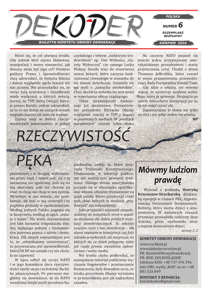 POLSKA NUMER 6 EGZEMPLARZ BEZPŁATNY BIULETYN KOMITETU OBRONY DEMOKRACJI SIERPIEŃ 2016 Mówi się, że cel uświęca środki. Gdy jednak ktoś używa kłamstwa, manipulacji i mowy nienawiści, jak słuszny może być jego cel? Ostatnio politycy Prawa i Sprawiedliwości chcą udowodnić, że historia bliższa i dalsza wyglądała zgoła inaczej niż nas uczono. Nie przeszkadza im, że wciąż żyją uczestnicy i świadkowie wielu wydarzeń, o których mówią. Gorzej, że TVP, którą (wciąż) kieruje prezes Kurski, usiłuje udowodnić, że to co się dzieje na naszych oczach wygląda inaczej niż nam się wydaje. Żyjemy więc w dwóch rzeczywistościach jednocześnie: w jednej czyńskiego i wbrew „niektórym środowiskom” np. Unii Wolności, „Gazety Wyborczej” czy samego Lecha Wałęsy. Doszło więc do stworzenia nowej historii, która zaczyna funkcjonować równolegle w stosunku do tej znanej dotychczas. Ujawniła się też myśl o „zamachu smoleńskim”. Choć akurat ta melodia nie jest nowa w repertuarze obozu rządzącego. Także teraźniejszość funkcjonuje już dwutorowo. Przemówienie prezydenta Barracka Obamy wyglądało inaczej w TVP i inaczej w pozostałych mediach. W „mediach narodowych” zostały tylko słowa Na szczycie NATO pojawił się jeszcze jeden, przypisywany amerykańskiemu prezydentowi i warty przytoczenia, cytat. Chodzi o słowa Thomasa Jeffersona, które zawarł w swym przemówieniu przewodniczący Rady Europejskiej Donald Tusk: Gdy idzie o władzę, nie mówmy więcej, że wystarczy zaufanie wobec tego, który ją sprawuje. Skrępujcie go zatem łańcuchami konstytucji po to, by nie mógł czynić zła. Zapamiętajmy te słowa nie tylko na dziś i nie tylko wobec tej władzy. MP prawdziwej i w drugiej, wykreowanej przez rząd. I nawet jeśli się z tą narzucaną nie zgadzamy, jeśli się na nią oburzamy, jeśli nie chcemy jej znać, to chcąc nie chcąc w niej żyjemy. Wywołuje w nas emocje, nie przekonuje, ale inni w nią uwierzyli i to pogłębia podziały w społeczeństwie. Według jednych Polska pogrąża się w bezprawiu, według drugich „wstaje z kolan”. Dla wielu najważniejszy jest fakt burzenia trójpodziału władzy, będącego jednym z fundamentów państwa prawa, a zatem i demokracji. Dla innych najważniejsze jest to, że „odzyskujemy suwerenność”, że przywracana jest sprawiedliwość, której III RP nie umiała czy nie chciała im zapewnić. W lipcu odbył się szczyt NATO i w jego kontekście dwie rzeczywistości starły się po raz kolejny. Na kilku płaszczyznach. Po pierwsze mogliśmy się dowiedzieć, że do NATO weszliśmy dzięki myśli Jarosława Ka- pochwalne, znikły te, które dotyczyły Trybunału Konstytucyjnego. Tłumaczenie w telewizji publicznej też nastręczyło pewnych trudności. Dlatego strona amerykańska poczuła się w obowiązku opublikować własne, oficjalne tłumaczenie na język polski. Warto przytoczyć część tych słów, których w mediach „rządowych” nie usłyszeliśmy: Jako przyjaciel i sojusznik zaapelowaliśmy do wszystkich stron o wspólne działania dla dobra polskich instytucji demokratycznych. To właśnie bowiem czyni z nas demokracje – nie słowa zapisane w konstytucji czy fakt udziału w wyborach, ale instytucje, na których na co dzień polegamy, takie jak rządy prawa, niezależne sądownictwo i wolne media. Nie trzeba chyba podkreślać, że manipulacje telewizji publicznej: wycinanie fragmentów i przeinaczanie tłumaczenia, były dowodem na to, że troska prezydenta Obamy wyrażona w przemówieniu jest jak najbardziej zasadna. Mówmy ludziom prawdę RZECZYWISTOŚĆ PĘKA Wywiad z posłanką Henryką Krzywonos-Strycharską, działaczką opozycji w czasach PRL, sygnatariuszką Porozumień Sierpniowych. Kobietą, która kocha dzieci z wzajemnością. W niełatwych czasach przemian prowadziła rodzinny dom dziecka, gdzie wychowała wraz z mężem dwanaścioro dzieci. strony 2-3 KOMITET OBRONY DEMOKRACJI www.ruchkod.pl www.dekoder.wroclaw.pl FB: KomitetObronyDemokracji, FB: KOD_DOLNOŚLĄSKIE Infolinia KOD: +48 737 476 396 Info SMS, wyślij „KOD” na nr: +48 881 526 849 KONTAKT Z REDAKCJĄ: [email protected] 2 Numer 6 | sierpień 2016 Mówmy ludziom prawdę wywiad z Henryką Krzywonos-Strycharską DEKODER: Jakie błędy popełnił poprzedni rząd, że ludzie oddali władzę takiej partii jak PiS? Henryka Krzywonos-Strycharska: Uważam, że zrobili jeden podstawowy błąd: nie pokazali co zrobili przez te osiem lat, nie pokazali jak się Polakom poprawiło życie. Nie zrobili wielu rzeczy, a przede wszystkim powinni podnieść ludziom stawki za godzinę. 500+ pokazało nam, że ludzie zrobią wszystko dla pieniędzy. Wygrało PiS, które w tej chwili nas niszczy, doprowadza do bankructwa i wcale się nie zdziwię, jeśli się okaże za rok, że jesteśmy drugą Grecją. Co musiałoby się wydarzyć, aby większość społeczeństwa powiedziała zdecydowane STOP? Aby obywatele zatrzymali tramwaj tej władzy? Myślę, że ludzie już niedługo będą wiedzieli, że coś się dzieje – zabraknie pieniędzy na 500+. Jeśli okaże się że nie mamy już z czego im zapłacić, bo już w tym roku są gminy, które nie mają pieniędzy na dalszą realizację Programu. Okaże się wtedy, że jeśli ludziom się coś odbiera, wtedy się buntują. Jarosław Kaczyński podczas promocji swojej autobiografii powiedział …zastępcą Lecha Wałęsy w Solidarności, potężną postacią faktycznie kierującą związkiem był mój brat. Jak skomentuje Pani te słowa? Nieprawda – pierwszym zastępcą Lecha Wałęsy był Andrzej Kołodziej, a drugim Bogdan Lis. I tego się nie da zmienić. Andrzej Kołodziej nie przeciwstawia się tym słowom, a powinien powiedzieć – przepraszam, to byłem ja. Ale tego nie robi. Dlaczego? Być może chodzi o to, że bardziej jest zwrócony w prawą stronę. Jak to się dzieje, że PIS tak łatwo przeinacza fakty, choć żyją wciąż świadk