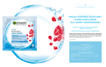 MASKA KOMPRES MOISTURE+ SUPER NAWILŻENIE DLA SKÓRY ODWODNIONEJ EKSTRAKT Z GRANATU + KWAS HIALURONOWY + SERUM NAWILŻAJĄCE BOMBA SKUTECZNOŚCI DLA SKÓRY ODWODNIONEJ Maska Kompres Moisture+ Super Nawilżenie dla skóry odwodnionej jest wzbogacona ekstraktem z granatu. Nawilża skórę i odpowiada na jej potrzeby, oferując efekt skutecznego nawodnienia, dodaje blasku, a drobne zmarszczki wydają się zredukowane.* *Po 3 zastosowaniach. SKUTECZNOŚĆ • Poprawa promienności cery według 70%* kobiet • Większa świeżość skóry według 85%* kobiet •M aska dająca wrażenie otulenia, wywołując efekt „opatrunku” według 80%* kobiet PRZYJEMNOŚĆ UŻYWANIA •P rzyjemność konsystencji produktu doświadczona przez 87%** kobiet •B rak uczucia tłustej skóry po zastosowaniu według 94%** kobiet *Bezpośrednio po pierwszym zastosowaniu w grupie 54 kobiet. **Po 1 tygodniu stosowania w grupie 54 kobiet. MASKA KOMPRES MOISTURE+ SUPER NAWILŻENIE PRZYWRACAJĄCA RÓWNOWAGĘ EKSTRAKT Z ZIELONEJ HERBATY + KWAS HIALURONOWY + SERUM NAWILŻAJĄCE BOMBA SKUTECZNOŚCI DLA SKÓRY NORMALNEJ I MIESZANEJ Maska Kompres Moisture+ Super Nawilżenie dla skóry normalnej i mieszanej jest wzbogacona ekstraktem z zielonej herbaty, znanej ze swoich właściwości matujących. Przywraca skórze równowagę, dla efektu matowej, oczyszczonej skóry ze zwężonymi porami. SKUTECZNOŚĆ • Skóra wyglądająca na oczyszczoną według 76%* kobiet PRZYJEMNOŚĆ UŻYWANIA •U czucie świeżości po zastosowaniu produktu według 94,9%** kobiet • Brak poczucia tłustej konsystencji produktu według 90%** kobiet *Bezpośrednio po pierwszym zastosowaniu w grupie 59 kobiet. **Po 1 tygodniu stosowania w grupie 59 kobiet. MASKA KOMPRES MOISTURE+ SUPER NAWILŻENIE PRZYNOSZĄCA UKOJENIE EKSTRAKT Z RUMIANKU + KWAS HIALURONOWY + SERUM NAWILŻAJĄCE BOMBA SKUTECZNOŚCI DLA SKÓRY SUCHEJ I WRAŻLIWEJ Maska Kompres Moisture+ Super Nawilżenie dla skóry suchej i wrażliwej jest nasączona ekstraktem z rumianku, rośliną znaną ze swojego kojącego działania na skórę. Formuła łagodzi uczucie ściągnięcia skóry*, długotrwale nawilża i daje uczucie bardziej ukojonej skóry. *Po 3 zastosowaniach. SKUTECZNOŚĆ • Odczuwalnie mniej sucha skóra według 87%** kobiet • Uczucie ukojenia skóry według 76%* kobiet • Skóra wydaje się bardziej miękka według 80,6%* kobiet PRZYJEMNOŚĆ UŻYWANIA •P ostrzeganie produktu jako łagodnego dla skóry przez 94%** kobiet •D oświadczenie lekkiej konsystencji produktu, która pozwala skórze oddychać według 81%** kobiet *Bezpośrednio po pierwszym zastosowaniu w grupie 62 kobiet. **Po 1 tygodniu stosowania w grupie 62 kobiet.