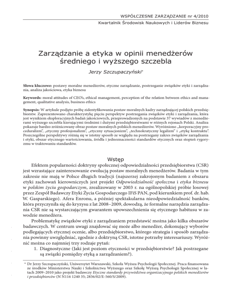 WSPÓàCZESNE ZARZĄDZANIE nr 4/2010 Kwartalnik ĝrodowisk Naukowych i Liderów Biznesu Zarządzanie a etyka w opinii menedĪerów Ğredniego i wyĪszego szczebla Jerzy SzczupaczyĔski* Słowa kluczowe: postawy moralne menedżerów, etyczne zarządzanie, postrzeganie związków etyki i zarządzania, analiza jakościowa, etyka biznesu Keywords: moral attitudes of CEO’s, ethical management, perception of the relation between ethics and management, qualitative analysis, business ethics - - - - - Synopsis: W artykule podjęto próbę zidentyfikowania postaw moralnych kadry zarządzającej polskich przedsiębiorstw. Zaprezentowano charakterystykę pięciu perspektyw postrzegania związków etyki i zarządzania, która jest wynikiem eksploracyjnych badań jakościowych, przeprowadzonych na podstawie 37 wywiadów z menedżerami wyższego szczebla kierującymi średnimi i dużymi przedsiębiorstwami w różnych rejonach Polski. Analiza pokazuje bardzo zróżnicowany obraz postaw moralnych polskich menedżerów. Wyróżniono „korporacyjny proceduralizm”, „etyczny profesjonalizm”, „etyczny sytuacjonizm”, „technokratyczny legalizm” i „etykę kontraktu”. Poszczególne perspektywy różnią się w istotny sposób ze względu na postrzegany zakres związków zarządzania i etyki, obszar etycznego wartościowania, źródła i jednoznaczności standardów etycznych oraz stopień rygoryzmu w traktowaniu standardów. WstĊp Efektem popularności doktryny społecznej odpowiedzialności przedsiębiorstwa (CSR) jest wzrastające zainteresowanie ewolucją postaw moralnych menedżerów. Badania w tym zakresie nie mają w Polsce długich tradycji (najszerzej zakrojonym badaniem z obszaru etyki zachowań kierowniczych jest projekt Odpowiedzialność społeczna i etyka biznesu w polskim życiu gospodarczym, zrealizowany w 2003 r. na ogólnopolskiej próbie losowej przez Zespół Badawczy Etyki Życia Gospodarczego IFiS PAN, pod kierunkiem prof. dr. hab. W. Gasparskiego). Afera Enronu, a później spektakularna nieodpowiedzialność banków, która przyczyniła się do kryzysu z lat 2008–2009, dowodzą, że formalne narzędzia zarządzania CSR nie są wystarczającym gwarantem upowszechnienia się etycznego habitusu w zawodzie menedżera. Problematykę związków etyki z zarządzaniem przedstawić można jako kilka obszarów badawczych. W centrum uwagi znajdować się może albo menedżer, dokonujący wyborów podlegających etycznej ocenie, albo przedsiębiorstwo, którego strategia i sposób zarządzania powinny uwzględniać, zgodnie z doktryną CSR, istotne potrzeby interesariuszy. Wyróżnić można co najmniej trzy rodzaje pytań: 1. Diagnostyczne (Jaki jest poziom etyczności w przedsiębiorstwie? Jak postrzegane są związki pomiędzy etyką a zarządzaniem?). * Dr Jerzy Szczupaczyński, Uniwersytet Warszawski, Szkoła Wyższa Psychologii Społecznej. Praca finansowana ze środków Ministerstwa Nauki i Szkolnictwa Wyższego oraz Szkołę Wyższą Psychologii Społecznej w latach 2009–2010 jako projekt badawczy Etyczne standardy przywództwa organizacyjnego polskich menedżerów i przedsiębiorców (N N116 1240 35; 2836/02/E-560/S/2009). - - - - - 64 I. PROBLEMY WSPÓàCZESNEGO ZARZĄDZANIA 2. Normatywne (Jakimi standardami etycznymi powinno się kierować przedsiębiorstwo i jego kadra kierownicza?). 3. Instrumentalne (W jaki sposób skutecznie zarządzać CSR? Jak zbudować proetyczną kulturę organizacyjną?). Wszystkie z wymienionych typów pytań są równie ważne. Aby znaleźć skuteczne narzędzia zarządzania CSR, należy poszukać odpowiedzi na pytanie „jak jest” i „jak powinno być”, zarówno w odniesieniu do zarządczego systemu przedsiębiorstwa, jak też zachowań kadry kierowniczej. To powoduje, że dyskusje i badania w tym zakresie muszą mieć charakter interdyscyplinarny. Celem artykułu jest prezentacja wyników eksploracyjnych badań postaw moralnych menedżerów średniego i wyższego szczebla. Badania przeprowadzone zostały w latach 2009–2010 w ramach projektu Etyczne standardy przywództwa organizacyjnego polskich menedżerów i przedsiębiorców, finansowanego przez Ministerstwo Nauki i Szkolnictwa Wyższego oraz Szkołę Wyższą Psychologii Społecznej (N N116 1240 35; 2836/02/E-560/S/2009). Analizę wykonano na podstawie 37 wywiadów z menedżerami, którzy kierują średnimi i dużymi przedsiębiorstwami w różnych rejonach Polski. Podstawowym celem badawczym była rekonstrukcja rozumienia etyczności oraz postrzegania związków etyki i zarządzania. Próba celowa została skonstruowana z wykorzystaniem czterech metod doboru uczestników badań: – rekrutacji telefonicznej (na podstawie danych zamieszczanych przez firmy na stronach internetowych), – za pośrednictwem Agencji Rozwoju Przemysłu, której władze ułatwiły kontakt z współpracującymi z ARP przedsiębiorstwami, – rekrutacji mejlowej przeprowadzonej wśród przedsiębiorstw zrzeszonych w izbach gospodarczych (dzięki współpracy z Krajową Izbą Gospodarczą), – rekrutacji prowadzonej z wykorzystaniem osobistych kontaktów członków grupy badawczej i techniki „kuli śnieżnej” (snowball sampling), stosowanej w naborze respondentów należących do grup trudno dostępnych. Zwracano szczególną uwagę na zróżnicowanie próby ze względu na lokalizację i typ przedsiębiorstwa, którym zarządza respondent. Z powodu trudności z rekrutacją (duża ilość odmów, niski wskaźnik pozyskanych uczestników badania w stosunku do ilości nawiązanych kontaktów), zrezygnowano z elementów doboru kwotowego. Badania zostały zrealizowane w 2009 r. w kilku ośrodkach miejskich i ich okolicach: w Warszawie, Łodzi, Częstochowie, Katowicach i Mielcu. Ponieważ rekrutacja uczestników badania odbywała się równolegle z realizacją wywiadów, kontroli został poddany proces pojawiania się nowych wątków i wstępnie rekonstruowanych znaczeń w sukcesywnie pozyskiwanym ma