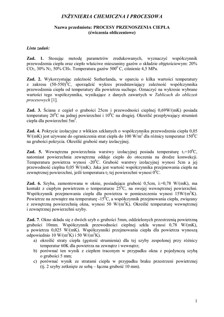 Procesy przenoszenia ciepła (zadania) - III ICHiP