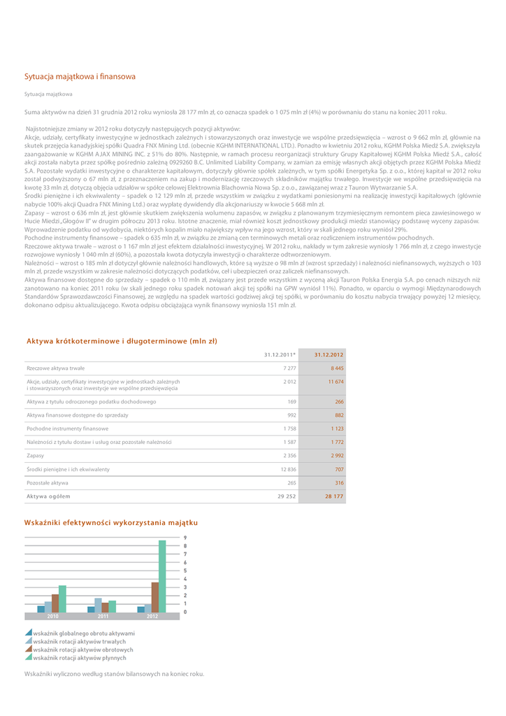 Sytuacja majątkowa i finansowa Sytuacja majątkowa Suma aktywów na dzień 31 grudnia 2012 roku wyniosła 28 177 mln zł, co oznacza spadek o 1 075 mln zł (4%) w porównaniu do stanu na koniec 2011 roku. Najistotniejsze zmiany w 2012 roku dotyczyły następujących pozycji aktywów: Akcje, udziały, certyfikaty inwestycyjne w jednostkach zależnych i stowarzyszonych oraz inwestycje we wspólne przedsięwzięcia – wzrost o 9 662 mln zł, głównie na skutek przejęcia kanadyjskiej spółki Quadra FNX Mining Ltd. (obecnie KGHM INTERNATIONAL LTD.). Ponadto w kwietniu 2012 roku, KGHM Polska Miedź S.A. zwiększyła zaangażowanie w KGHM A JAX MINING INC. z 51% do 80%. Następnie, w ramach procesu reorganizacji struktury Grupy Kapitałowej KGHM Polska Miedź S.A., całość akcji została nabyta przez spółkę pośrednio zależną 0929260 B.C. Unlimited Liability Company, w zamian za emisję własnych akcji objętych przez KGHM Polska Miedź S.A. Pozostałe wydatki inwestycyjne o charakterze kapitałowym, dotyczyły głównie spółek zależnych, w tym spółki Energetyka Sp. z o.o., której kapitał w 2012 roku został podwyższony o 67 mln zł, z przeznaczeniem na zakup i modernizację rzeczowych składników majątku trwałego. Inwestycje we wspólne przedsięwzięcia na kwotę 33 mln zł, dotyczą objęcia udziałów w spółce celowej Elektrownia Blachownia Nowa Sp. z o.o., zawiązanej wraz z Tauron Wytwarzanie S.A. Środki pieniężne i ich ekwiwalenty – spadek o 12 129 mln zł, przede wszystkim w związku z wydatkami poniesionymi na realizację inwestycji kapitałowych (głównie nabycie 100% akcji Quadra FNX Mining Ltd.) oraz wypłatę dywidendy dla akcjonariuszy w kwocie 5 668 mln zł. Zapasy – wzrost o 636 mln zł, jest głównie skutkiem zwiększenia wolumenu zapasów, w związku z planowanym trzymiesięcznym remontem pieca zawiesinowego w Hucie Miedzi „Głogów II” w drugim półroczu 2013 roku. Istotne znaczenie, miał również koszt jednostkowy produkcji miedzi stanowiący podstawę wyceny zapasów. Wprowadzenie podatku od wydobycia, niektórych kopalin miało największy wpływ na jego wzrost, który w skali jednego roku wyniósł 29%. Pochodne instrumenty finansowe – spadek o 635 mln zł, w związku ze zmianą cen terminowych metali oraz rozliczeniem instrumentów pochodnych. Rzeczowe aktywa trwałe – wzrost o 1 167 mln zł jest efektem działalności inwestycyjnej. W 2012 roku, nakłady w tym zakresie wyniosły 1 766 mln zł, z czego inwestycje rozwojowe wyniosły 1 040 mln zł (60%), a pozostała kwota dotyczyła inwestycji o charakterze odtworzeniowym. Należności – wzrost o 185 mln zł dotyczył głównie należności handlowych, które są wyższe o 98 mln zł (wzrost sprzedaży) i należności niefinansowych, wyższych o 103 mln zł, przede wszystkim w zakresie należności dotyczących podatków, ceł i ubezpieczeń oraz zaliczek niefinansowych. Aktywa finansowe dostępne do sprzedaży – spadek o 110 mln zł, związany jest przede wszystkim z wyceną akcji Tauron Polska Energia S.A. po cenach niższych niż zanotowano na koniec 2011 roku (w skali jednego roku spadek notowań akcji tej spółki na GPW wyniósł 11%). Ponadto, w oparciu o wymogi Międzynarodowych Standardów Sprawozdawczości Finansowej, ze względu na spadek wartości godziwej akcji tej spółki, w porównaniu do kosztu nabycia trwający powyżej 12 miesięcy, dokonano odpisu aktualizującego. Kwota odpisu obciążająca wynik finansowy wyniosła 151 mln zł. Akt ywa kr ót kot er m inowe i długot er m inowe (m ln zł) 31.12.2011* 31.12.2012 Rzeczowe aktywa trwałe 7 277 8 445 Akcje, udziały, certyfikaty inwestycyjne w jednostkach zależnych i stowarzyszonych oraz inwestycje we wspólne przedsięwzięcia 2 012 11 674 Aktywa z tytułu odroczonego podatku dochodowego 169 266 Aktywa finansowe dostępne do sprzedaży 992 882 Pochodne instrumenty finansowe 1 758 1 123 Należności z tytułu dostaw i usług oraz pozostałe należności 1 587 1 772 Zapasy 2 356 2 992 12 836 707 265 316 29 252 28 177 Środki pieniężne i ich ekwiwalenty Pozostałe aktywa Ak ty w a o g ó łem Ws kaźniki efekt ywnoś ci wykor zys t ania m ająt ku Wskaźniki wyliczono według stanów bilansowych na koniec roku. Źr ódła finans owania akt ywów (m ln zł) 31.12.2011* 31.12.2012 23 135 21 923 2 000 2 000 Kapitał z tytułu wyceny aktywów finansowych dostępnych do sprzedaży - 39 - Kapitał z tytułu wyceny instrumentów zabezpieczających przepływy pieniężne 574 286 Zyski zatrzymane 20 600 19 637 Z o b o w i ą za n i a k ró tk o i d łu g o termi n o w e 6 117 6 254 1 840 2 263 - 1 013 868 253 Zobowiązania z tytułu bieżącego podatku dochodowego od osób prawnych 1 588 390 Zobowiązania z tytułu świadczeń pracowniczych 1 323 1 581 498 754 29 252 28 177 K a p i ta ł w ła s n y Kapitał akcyjny Zobowiązania z tytułu dostaw i usług oraz pozostałe zobowiązania Kredyty, pożyczki i zobowiązania z tytułu leasingu finansowego Pochodne instrumenty finansowe Rezerwy na pozostałe zobowiązania i inne obciążenia Og ó łem zo b o w i ą za n i a i k a p i ta ł w ła s n y * Dane przekształcone w związku ze zmianą zasad rachunkowości (Nota 2.1.1 Sprawozdania finansowego).
