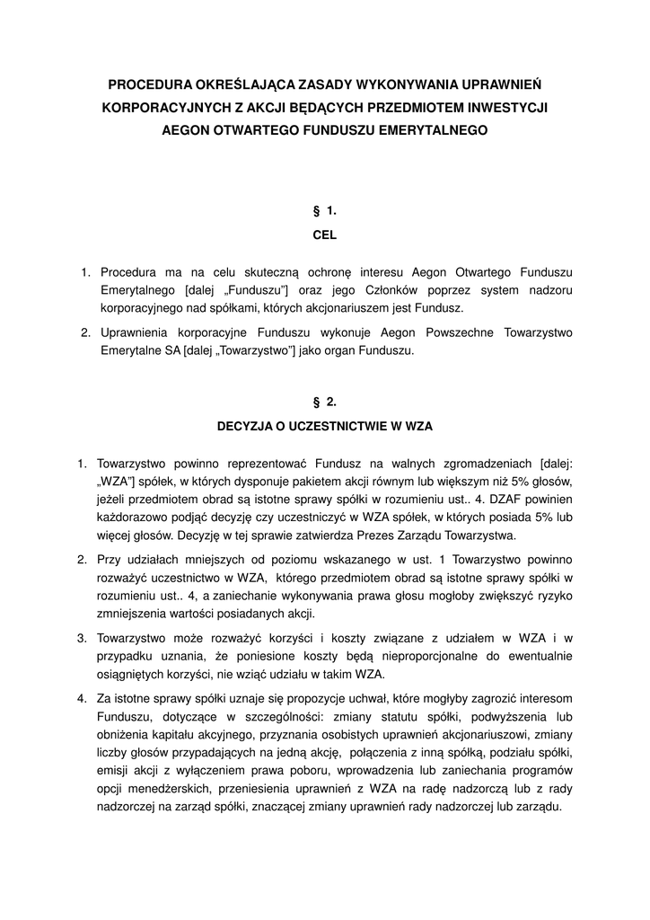 PROCEDURA OKREŚLAJĄCA ZASADY WYKONYWANIA UPRAWNIEŃ KORPORACYJNYCH Z AKCJI BĘDĄCYCH PRZEDMIOTEM INWESTYCJI AEGON OTWARTEGO FUNDUSZU EMERYTALNEGO § 1. CEL 1. Procedura ma na celu skuteczną ochronę interesu Aegon Otwartego Funduszu Emerytalnego [dalej „Funduszu”] oraz jego Członków poprzez system nadzoru korporacyjnego nad spółkami, których akcjonariuszem jest Fundusz. 2. Uprawnienia korporacyjne Funduszu wykonuje Aegon Powszechne Towarzystwo Emerytalne SA [dalej „Towarzystwo”] jako organ Funduszu. § 2. DECYZJA O UCZESTNICTWIE W WZA 1. Towarzystwo powinno reprezentować Fundusz na walnych zgromadzeniach [dalej: „WZA”] spółek, w których dysponuje pakietem akcji równym lub większym niż 5% głosów, jeżeli przedmiotem obrad są istotne sprawy spółki w rozumieniu ust.. 4. DZAF powinien każdorazowo podjąć decyzję czy uczestniczyć w WZA spółek, w których posiada 5% lub więcej głosów. Decyzję w tej sprawie zatwierdza Prezes Zarządu Towarzystwa. 2. Przy udziałach mniejszych od poziomu wskazanego w ust. 1 Towarzystwo powinno rozważyć uczestnictwo w WZA, którego przedmiotem obrad są istotne sprawy spółki w rozumieniu ust.. 4, a zaniechanie wykonywania prawa głosu mogłoby zwiększyć ryzyko zmniejszenia wartości posiadanych akcji. 3. Towarzystwo może rozważyć korzyści i koszty związane z udziałem w WZA i w przypadku uznania, że poniesione koszty będą nieproporcjonalne do ewentualnie osiągniętych korzyści, nie wziąć udziału w takim WZA. 4. Za istotne sprawy spółki uznaje się propozycje uchwał, które mogłyby zagrozić interesom Funduszu, dotyczące w szczególności: zmiany statutu spółki, podwyższenia lub obniżenia kapitału akcyjnego, przyznania osobistych uprawnień akcjonariuszowi, zmiany liczby głosów przypadających na jedną akcję, połączenia z inną spółką, podziału spółki, emisji akcji z wyłączeniem prawa poboru, wprowadzenia lub zaniechania programów opcji menedżerskich, przeniesienia uprawnień z WZA na radę nadzorczą lub z rady nadzorczej na zarząd spółki, znaczącej zmiany uprawnień rady nadzorczej lub zarządu. § 3. WYMIANA POGLĄDÓW I POROZUMIENIA PRZED WZA 1. Jeżeli wymaga tego interes spółki, której akcjonariuszem jest Fundusz, w uzasadnionych przypadkach, jeżeli znajduje to oparcie w praktykach rynkowych, Towarzystwo może wymienić z innymi inwestorami instytucjonalnymi poglądy i opinie dotyczące spółki i planowanego WZA oraz uzgodnić wspólne stanowisko dotyczące postępowania przed WZA. O prowadzonych rozmowach pracownik DZAF informuje Prezesa Zarządu Funduszu. 2. Przedmiotem wymiany poglądów i informacji nie może być informacja objęta tajemnicą zawodową, do której zachowania zobowiązane jest Towarzystwo. § 4. PREZENTACJA KANDYDATÓW DO ORGANÓW SPÓŁKI 1. Towarzystwo nie proponuje kandydatów do Zarządu spółek, których akcjonariuszem jest Fundusz. 2. Towarzystwo może proponować kandydatów do rad nadzorczych spółek, w których Fundusz jest akcjonariuszem. 3. Towarzystwo powinno, w miarę możliwości, dążyć do zaprezentowania, z odpowiednim wyprzedzeniem przed WZA, swoich kandydatów do rad nadzorczych. W tym celu przesyła do spółki życiorys kandydata w celu udostępnienia go innym akcjonariuszom. 4. Przy wyborze członków rad nadzorczych spółek, Towarzystwo dąży do tego, by popierani przez niego kandydaci charakteryzowali się nienaganną reputacją i posiadali należyte wykształcenie oraz doświadczenie zawodowe niezbędne do prawidłowego wykonywania funkcji członka rady nadzorczej. 5. Wyznaczony przez Towarzystwo kandydat do rady nadzorczej powinien spełniać kryteria niezależnego kandydata w rozumieniu ust. 6. 6. Kandydat do rady nadzorczej spółki jest niezależny jeżeli: nie pozostaje w stosunku pracy lub w innym o podobnym charakterze z żadnym z inwestorów instytucjonalnych będących akcjonariuszem tej spółki, nie był członkiem zarządu spółki przez ostatnie 5 lat, nie pracował w spółce na stanowisku kierowniczym przez ostatnie 3 lata, nie otrzymuje ani w ciągu ostatnich 5 lat nie otrzymywał wynagrodzenia, również w postaci opcji menedżerskich od spółki (nie dotyczy to wynagrodzenia otrzymywanego z tytułu pełnienia funkcji członka rady nadzorczej), nie jest akcjonariuszem, pracownikiem ani pełnomocnikiem akcjonariusza dysponującego 5% lub więcej głosów na WZA, nie utrzymuje obecnie ani nie utrzymywał w ciągu ostatniego roku znaczących relacji handlowych ze spółką, nie jest lub w ciągu ostatnich trzech lat nie był wspólnikiem albo pracownikiem obecnego, jak również byłego biegłego rewidenta badającego sprawozdania finansowe spółki lub jej jednostki stowarzyszonej, nie jest powiązany z członkami zarządu w sposób, który mógłby wywołać wątpliwości co do jego bezstronności, nie pełnił funkcji członka rady nadzorczej danej spółki dłużej niż 12 lat. 7. W szczególnych okolicznościach, podyktowanych interesem spółki, której Fundusz jest akcjonariuszem osoba wyznaczona przez Fundusz do rady nadzorczej nie musi spełniać wszystkich wymogów wymaganych dla uznania jej za niezależnego członka rady nadzorczej. 8. Decyzja o zaproponowaniu przez Fundusz kandydata do rady nadzorczej powinna mieć formę pisemną i zawierać informację stwierdzającą czy kandydat spełnia wszystkie kryteria niezależnego kandydata. W przypadku gdyby nie spełniał wszystkich kryteriów decyzja powinna wskazywać, które kryteria nie zostały spełnione oraz zawierać wyjaśnienia, dlaczego pomimo tego kandydat został zaproponowany. 9. Kandydat do rady nadzorczej rekomendowany przez Fundusz jest zatwierdzany przez Komitet Inwestycyjny Funduszu. W decyzji Komitetu Inwestycyjnego powinna znaleźć się informacja stwierdzającą czy kandydat spełnia wszystkie kryteria niezależnego kandydata. W przypadku gdyby nie spełniał wszystkich kryteriów decyzja powinna wskazywać, które kryt