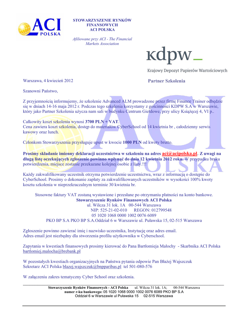STOWARZYSZENIE RYNKÓW FINANSOWYCH ACI POLSKA Afiliowane przy ACI - The Financial Markets Association Warszawa, 4 kwiecień 2012 Partner Szkolenia Szanowni Państwo, Z przyjemnością informujemy, że szkolenie Advanced ALM prowadzone przez firmę Finance Trainer odbędzie się w dniach 14-16 maja 2012 r. Podczas tego szkolenia korzystamy z gościnności KDPW S.A w Warszawie, który jako Partner Szkolenia użycza nam sali w budynku Centrum Giełdowe, przy ulicy Książęcej 4, VI p.. Całkowity koszt szkolenia wynosi 3700 PLN + VAT. Cena zawiera koszt szkolenia, dostęp do materiałów CyberSchool od 14 kwietnia br , całodzienny serwis kawowy oraz lunch. Członkom Stowarzyszenia przysługuje upust w kwocie 1000 PLN od kwoty brutto. Prosimy składanie imienny deklaracji uczestnictwa w szkoleniu na adres [email protected]. Z uwagi na długą listę oczekujących zgłoszenie powinno wpłynąć do dnia 12 kwietnia 2012 roku. W przypadku braku potwierdzenia, miejsce zostanie przekazane kolejnej osobie z listy.!!! Każdy zakwalifikowany uczestnik otrzyma potwierdzenie uczestnictwa, wraz z informacją o dostępie do CyberSchool. Prosimy o dokonanie zapłaty za zakwalifikowanych uczestników w wysokości 100% kwoty kosztu szkolenia w nieprzekraczalnym terminie 30 kwietnia br. Stosowne faktury VAT zostaną wystawione i przesłane po otrzymaniu płatności na konto bankowe. Stowarzyszenie Rynków Finansowych ACI Polska ul. Wilcza 31 lok. 1A 00-544 Warszawa NIP: 525-21-02-010 REGON: 012799548 05 1020 1068 0000 1002 0076 6089 PKO BP S.A PKO BP S.A.Oddział 6 w Warszawie ul. Puławska 15, 02-515 Warszawa Zgłoszenie powinno zawierać imię i nazwisko uczestnika, Instytucję oraz adres email. Adres email jest niezbędny dla stworzenia profilu użytkownika w Cyberschool. Zapytania w kwestiach finansowych prosimy kierować do Pana Bartłomieja Małochy - Skarbnika ACI Polska [email protected] W pozostałych kwestiach organizacyjnych na Państwa pytania odpowie Pan Błażej Wajszczuk Sekretarz ACI Polska [email protected] tel 501-080-576 W załączeniu zakres tematyczny Cyber School oraz szkolenia. ____________________________________________________________________________________________________________________________ Stowarzyszenie Rynków Finansowych - ACI Polska ul. Wilcza 31 lok. 1A; 00-544 Warszawa numer r-ku bankowego: 05 1020 1068 0000 1002 0076 6089 PKO BP S.A Oddział 6 w Warszawie ul Puławska 15 02-515 Warszawa Contents Advanced ALM*Bank Cyber Preparation Course Main topics (chapters) Scope Advanced ALM*Bank Cyber Preparation 1. Total Bank Management Ratios of total bank management Separation of customer and business risk 2. ;8Legal Framework Limitation credit risk Basel II + Outlook Basel III Consequences of Basel II/III on ALM strategies 54 questions 18 pages 30 questions Transfer prices 10 pages Interest gap contribution and risk analysis Implementation of interest opinion Interest Rate Swaps 5. Basics of Nostro management 18 pages Customer contribution 4. Interest Rate Risk Management 27 questions Minimum Risk Capacity and ICAAP 3. Transfer Pricing Method 12 pages 36 questions 18 pages Bonds terminology and pricing Credit Spread Risk Measurement Instruments of CRM 39 questions 6. Risk Calculation Duration and PVBP Basics Risk Management 23 pages Risk Management Methods Risk Management Parameters TOTAL 100 pages ____________________________________________________________________________________________________________________________ Stowarzyszenie Rynków Finansowych - ACI Polska ul. Wilcza 31 lok. 1A; 00-544 Warszawa numer r-ku bankowego: 05 1020 1068 0000 1002 0076 6089 PKO BP S.A Oddział 6 w Warszawie ul Puławska 15 02-515 Warszawa 225 questions - Content of the seminar: Total Bank Management, state-of-the-art in interest and liquidity management in ALM Transfer pricing as a pillar of an efficient risk management philosophy; pros and cons, feasibility, consequences for the organisation MTM valuation in the interest and liquidity books separate management of interest, liquidity and credit spread risk in the banking book Limits and stress tests for interest and liquidity risk in an ICAAP environment Impacts of LCR and NSFR on bank strategies MTM management of interest and liquidity risk MTM measurement of interest and liquidity risks MTM management impulses from mapping customer products with undefined maturity and/or interest sensibilities and non-interest bearing assets and liabilities Model books to manage important products without direct hedging options (terms, currencies, soft options, contract terms) Potentials of an efficient flow trading for the ALM Managing the Bond portfolio Role of the Bond portfolio in the ALM environment: impacts on liquidity ratios, collateral management and impacts on ALM, Products at portfolio level: CDS, securitization Credit Spread risk measurement Tasks/competencies/responsibilities for the bond portfolio management in ALM Equity management in ALM with a view towards Basel 3 Risk strategy and policy: compliance requirements in ALM Consequences of higher equity requirements Stress tests as a basis for the necessary equity buffer (ICAAP management) Considering IFRS valuations in ALM management Bridging the gap between national legislation and IFRS when valuing ALM results Measures to reduce return volatility, macro hedging and IFRS hedge accounting A system for setting up hedge accounting in the banking book PC simulation for advanced ALM management Using ALM instruments to separately manage interest, liquidity and credit spread risk Setting limits under MTM and IFRS valuation criteria ____________________________________________________________________________________________________________________________ Stowarzyszenie Rynków Finansowych - ACI Polska ul. Wilcza 31 lok. 1A; 00-544 Warszawa numer r-ku bankowego: 05 1020 1068 0000 1002 0076 6089 PKO BP S.A Oddział 6 w Warszawie ul Puławska 15 02-515 Warszawa Introducing equity management into 
