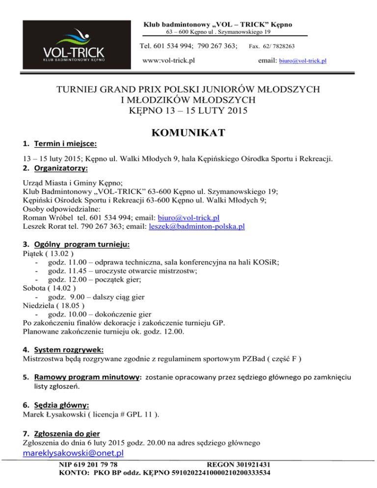 Klub badmintonowy „VOL – TRICK” Kępno 63 – 600 Kępno ul . Szymanowskiego 19 Tel. 601 534 994; 790 267 363; www:vol-trick.pl Fax. 62/ 7828263 email: [email protected] TURNIEJ GRAND PRIX POLSKI JUNIORÓW MŁODSZYCH I MŁODZIKÓW MŁODSZYCH KĘPNO 13 – 15 LUTY 2015 KOMUNIKAT 1. Termin i miejsce: 13 – 15 luty 2015; Kępno ul. Walki Młodych 9, hala Kępińskiego Ośrodka Sportu i Rekreacji. 2. Organizatorzy: Urząd Miasta i Gminy Kępno; Klub Badmintonowy „VOL-TRICK” 63-600 Kępno ul. Szymanowskiego 19; Kępiński Ośrodek Sportu i Rekreacji 63-600 Kępno ul. Walki Młodych 9; Osoby odpowiedzialne: Roman Wróbel tel. 601 534 994; email: [email protected] Leszek Rorat tel. 790 267 363; email: [email protected] 3. Ogólny program turnieju: Piątek ( 13.02 ) - godz. 11.00 – odprawa techniczna, sala konferencyjna na hali KOSiR; - godz. 11.45 – uroczyste otwarcie mistrzostw; - godz. 12.00 – początek gier; Sobota ( 14.02 ) - godz. 9.00 – dalszy ciąg gier Niedziela ( 18.05 ) - godz. 10.00 – dokończenie gier Po zakończeniu finałów dekoracje i zakończenie turnieju GP. Planowane zakończenie turnieju ok. godz. 12.00. 4. System rozgrywek: Mistrzostwa będą rozgrywane zgodnie z regulaminem sportowym PZBad ( część F ) 5. Ramowy program minutowy: zostanie opracowany przez sędziego głównego po zamknięciu listy zgłoszeń. 6. Sędzia główny: Marek Łysakowski ( licencja # GPL 11 ). 7. Zgłoszenia do gier Zgłoszenia do dnia 6 luty 2015 godz. 20.00 na adres sędziego głównego [email protected] NIP 619 201 79 78 REGON 301921431 KONTO: PKO BP oddz. KĘPNO 59102022410000210200333534 Klub badmintonowy „VOL – TRICK” Kępno 63 – 600 Kępno ul . Szymanowskiego 19 Tel. 601 534 994; 790 267 363; Fax. 62/ 7828263 www:vol-trick.pl email: [email protected] 8. Losowanie: Losowanie 10 luty 2015 godz. 20.00; Publikacja losowania 11 luty 2015 9. Kategoria turnieju: - junior młodszy kat. VIII; - młodzik młodszy kat. XI; 10.Nagrody: Według możliwości organizatora. 11. Wpisowe: Zgodnie z regulaminem sportowym cześć A.VI. pkt 3b 12. Zakwaterowanie: a) Bursa szkolna w Specjalnym Ośrodku Szkolno-Wychowawczym 63-500 Ostrzeszów, ul Gen. Sikorskiego1 b) Hostel 63-600 Kępno ul. Solidarności 17a Ceny 35 zł / osoba Jest możliwość zakwaterowania w salach wieloosobowych na terenie hali sportowej lub szkoły po uzgodnieniu z organizatorem. Koszt noclegu 10 zł od osoby. Uczestnicy otrzymują do dyspozycji pomieszczenie z materacami i we własnym zakresie organizują sobie nocleg. 13.Wyżywienie: Dla uczestników proponujemy posiłki w restauracji „Polonia” ( ok. 150m od hali ) w cenie: Śniadanie – 10 zł ( szwedzki stół ); Obiad – 15 zł; Kolacja – 10 zł; Osoby korzystające z noclegu w Ostrzeszowie mogą skorzystać ze śniadania na terenie ośrodka w cenie 10 zł. Na terenie hali przez cały czas trwania turnieju do dyspozycji będzie restauracja. Wszystkie zamówienia na noclegi i wyżywienie należy kierować do organizatora na adres: Leszek Rorat tel. 790 267 363; email: [email protected] oraz do wiadomości na adres email: [email protected] NIP 619 201 79 78 REGON 301921431 KONTO: PKO BP oddz. KĘPNO 59102022410000210200333534