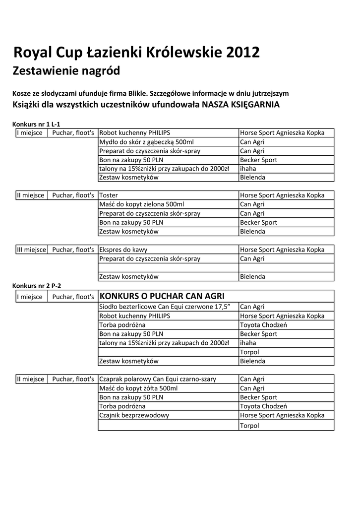 Royal Cup Łazienki Królewskie 2012 Zestawienie nagród Kosze ze słodyczami ufunduje firma Blikle. Szczegółowe informacje w dniu jutrzejszym Książki dla wszystkich uczestników ufundowała NASZA KSIĘGARNIA Konkurs nr 1 L-1 I miejsce Puchar, floot's Robot kuchenny PHILIPS Mydło do skór z gąbeczką 500ml Preparat do czyszczenia skór-spray Bon na zakupy 50 PLN talony na 15%zniżki przy zakupach do 2000zł Zestaw kosmetyków II miejsce Horse Sport Agnieszka Kopka Can Agri Can Agri Becker Sport ihaha Bielenda Puchar, floot's Toster Maść do kopyt zielona 500ml Preparat do czyszczenia skór-spray Bon na zakupy 50 PLN Zestaw kosmetyków Horse Sport Agnieszka Kopka Can Agri Can Agri Becker Sport Bielenda III miejsce Puchar, floot's Ekspres do kawy Preparat do czyszczenia skór-spray Horse Sport Agnieszka Kopka Can Agri Zestaw kosmetyków Bielenda Konkurs nr 2 P-2 I miejsce Puchar, floot's KONKURS O PUCHAR CAN AGRI Siodło bezterlicowe Can Equi czerwone 17,5” Robot kuchenny PHILIPS Torba podróżna Bon na zakupy 50 PLN talony na 15%zniżki przy zakupach do 2000zł Zestaw kosmetyków II miejsce Puchar, floot's Czaprak polarowy Can Equi czarno-szary Maść do kopyt żółta 500ml Bon na zakupy 50 PLN Torba podróżna Czajnik bezprzewodowy Can Agri Horse Sport Agnieszka Kopka Toyota Chodzeń Becker Sport ihaha Torpol Bielenda Can Agri Can Agri Becker Sport Toyota Chodzeń Horse Sport Agnieszka Kopka Torpol III miejsce Puchar, floot's Strzemiona Duca Design „kawowa kratka” Czajnik bezprzewodowy Torba podróżna Zestaw kosmetyków Can Agri Horse Sport Agnieszka Kopka Toyota Chodzeń Bielenda Konkurs nr 3 N-7 I miejsce Puchar, floot's KONKURS O PUCHAR FIRMY BIELENDA zestaw kosmetyków Bielenda Bielenda Pasta siarczanowa do strzałek Black Horse Żel chłodząco-regenerujący Black Horse Maść do kopyt Black Horse Odżywka do grzywy i ogona Black Horse próbki innych kosmetyków Black Horse kupon rabatowy na zakupy w sklepie on-line 15%Black Horse Ekspres do kawy Horse Sport Agnieszka Kopka Bon na zakupy 50 PLN Becker Sport talony na 15%zniżki przy zakupach do 2000zł ihaha voucher na finał ligi golfa VIP Discower Golf Pranimalia II miejsce Puchar, floot's zestaw kosmetyków Bielenda Pasta siarczanowa do strzałek Żel chłodząco-regenerujący Maść do kopyt próbki innych kosmetyków kupon rabatowy na zakupy w sklepie on-line 10% Bon na zakupy 50 PLN Ekspres do kawy III miejsce Puchar, floot's zestaw kosmetyków Bielenda Ekspres do kawy Pasta siarczanowa do strzałek Maść do kopyt próbki innych kosmetyków kupon rabatowy na zakupy w sklepie on-line 10% Bilenda Black Horse Black Horse Black Horse Black Horse Black Horse Becker Sport Horse Sport Agnieszka Kopka Torpol Pranimalia Bielenda Horse Sport Agnieszka Kopka Black Horse Black Horse Black Horse Black Horse Pranimalia Konkurs nr 4 C-4 I miejsce Puchar, floot's Robot kuchenny PHILIPS Mydło do skór z gąbeczką 500ml voucher na finał ligi golfa VIP Bon na zakupy 50 PLN Zestaw kosmetyków Zestaw biżuterii II miejsce Puchar, floot's Toster Bon na zakupy 50 PLN Maść do kopyt żółta 500ml Suplement EPONA CELLUWELL Zestaw kosmetyków Zestaw biżuterii III miejsce Puchar, floot's Maść do kopyt zielona 500ml Czajnik bezprzewodowy Zestaw kosmetyków Zestaw biżuterii Konkurs nr 5 CC-4 I miejsce Puchar, floot's 300 PLN Robot kuchenny PHILIPS Mydło do skór z gąbeczką 500ml Bon na zakupy 50 PLN Pasza EPONA PERFORMANCE Zestaw biżuterii Zestaw kosmetyków II miejsce Puchar, floot's 200 PLN Maść do kopyt czarna 500ml Bon na zakupy 50 PLN Pasza EPONA PERFORMANCE Toster Zestaw biżuterii Zestaw kosmetyków III miejsce Puchar, floot's 100 PLN Maść do kopyt czarna 500ml Suplement EPONA CELLUWELL Czajnik bezprzewodowy Zestaw biżuterii Zestaw kosmetyków Horse Sport Agnieszka Kopka Can Agri Discower Golf Becker Sport Torpol Rsprodukter Polska Bielenda AdFaktoria Horse Sport Agnieszka Kopka Becker Sport Can Agri Horse Feed Bielenda AdFaktoria Can Agri Horse Sport Agnieszka Kopka Torpol Bielenda AdFaktoria Horse Sport Agnieszka Kopka Can Agri Becker Sport Horse Feed AdFaktoria Bielenda Can Agri Becker Sport Horse Feed Horse Sport Agnieszka Kopka AdFaktoria Bielenda Can Agri Horse Feed Horse Sport Agnieszka Kopka AdFaktoria Bielenda