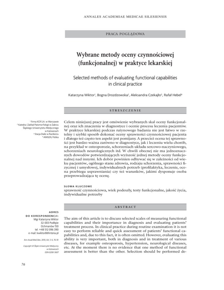 ANNALES ACADEMIAE MEDICAE SILESIENSIS PRACA POGLĄDOWA Wybrane metody oceny czynnościowej (funkcjonalnej) w praktyce lekarskiej Selected methods of evaluating functional capabilities in clinical practice Katarzyna Wiktor1, Bogna Drozdzowska2, Aleksandra Czekajło3, Rafał Hebel4 STRESZCZENIE 2 1 Firma KCR S.A. w Warszawie Katedra i Zakład Patomorfologii w Zabrzu Śląskiego Uniwersytetu Medycznego w Katowicach 3 Stacja Dializ w Raciborzu 4 AMGEN, Polska Celem niniejszej pracy jest omówienie wybranych skal oceny funkcjonalnej oraz ich znaczenia w diagnostyce i ocenie procesu leczenia pacjentów. W praktyce lekarskiej podczas rutynowego badania nie jest łatwo w rzetelny i szybki sposób dokonać oceny sprawności czynnościowej pacjenta i dlatego też często ten aspekt jest pomijany. A przecież ocena tej sprawności jest bardzo ważna zarówno w diagnostyce, jak i leczeniu wielu chorób, na przykład w osteoporozie, schorzeniach układu sercowo-naczyniowego, schorzeniach neurologicznych itd. W chwili obecnej nie ma jednoznacznych dowodów potwierdzających wyższość jednej metody oceny funkcjonalnej nad innymi. Ich dobór powinien odbywać się w zależności od wieku pacjentów, ogólnego stanu zdrowia, rodzaju schorzenia, sprawności fizycznej i umysłowej, indywidualnych potrzeb (profilaktyka, leczenie, ocena przebiegu usprawniania) czy też warunków, jakimi dysponuje osoba przeprowadzająca tę ocenę. S Ł O WA K L U C Z O W E sprawność czynnościowa, wiek podeszły, testy funkcjonalne, jakość życia, indywidualne potrzeby A B S T R AC T ADRES D O KO R E S P O N D E N C J I : Mgr Katarzyna Wiktor 32-003 Podłęże Ochmanów 150 tel. +48 512 096 390 e-mail: [email protected] Ann.Acad.Med.Siles. 2010, 64, 5-6, 76-81 Copyright © Śląski Uniwersytet Medyczny w Katowicach ISSN 0208-5607 76 The aim of this article is to discuss selected scales of measuring functional capabilities and their importance in diagnosis and evaluating patients’ treatment process. In clinical practice during routine examination it is not easy to perform reliable and quick assessment of patients’ functional capabilities and, due to this fact, it is often omitted. However, evaluating this ability is very important, both in diagnosis and in treatment of various diseases, for example osteoporosis, hypertension, neurological diseases, etc. At the moment there is no evidence that one method of functional assessment is better than the other. Selection should be performed de- WYBRANE METODY OCENY CZYNNOĝCIOWEJ (FUNKCJONALNEJ) W PRAKTYCE LEKARSKIEJ pending on patients’ age, health status, type of disease, their fitness and mental status, individual needs (prevention, treatment, evaluation of the effects) or, finally, on specific conditions during the examination. KEY WORDS functional capability, the elderly, functional tests, the quality of life, individual need Definicja sprawności czynnościowej (funkcjonalnej) Sprawność czynnościowa (funkcjonalna) umożliwia wykonywanie i zaspokajanie podstawowych potrzeb życiowych, takich jak: poruszanie się, odżywianie, kontrolowanie czynności fizjologicznych czy utrzymywanie higieny. Sprawność czynnościowa bywa określana również mianem wydolności funkcjonalnej albo aktywności funkcjonalnej. Pojęcia te, najkrócej mówiąc, określają zdolność do bycia niezależnym od innych osób w zaspokajaniu podstawowych potrzeb życiowych. Sprawność czynnościowa jest więc pojęciem szerokim, wiąże się bowiem ze stanem całego organizmu człowieka. Ocena funkcjonalna odgrywa szczególną rolę u osób w podeszłym wieku. W praktyce lekarskiej podczas rutynowego badania nie jest łatwo w rzetelny i szybki sposób dokonać oceny sprawności czynnościowej pacjenta i dlatego też często ten aspekt jest pomijany. A przecież ocena tej sprawności jest bardzo ważna zarówno w diagnostyce, jak i leczeniu wielu cho- rób, na przykład w osteoporozie, schorzeniach układu sercowo-naczyniowego, schorzeniach neurologicznych itd. Ponadto określenie stopnia sprawności funkcjonalnej może być wykorzystane w podjęciu postępowania profilaktycznego. Przy tej okazji warto wspomnieć, iż właściwie dobrana aktywność fizyczna jest podstawowym elementem tej profilaktyki. Aktywność fizyczna poprzez uprawianie sportu, regularnych ćwiczeń fizycznych czy tzw. czynnej rekreacji wpływa na poprawę jakości życia i zwłaszcza u osób starszych jest podstawowym czynnikiem warunkującym samodzielne funkcjonowanie i poprawę przeżywalności pacjentów. Metody oceny stanu funkcjonalnego Stan funkcjonalny organizmu można oceniać między innymi na podstawie: skali wykonywania prostych czynności życia codziennego według Katza (tzw. skala ADL, Activities of Daily Living), skali wykonywania złożonych czynności według Lawtona (tzw. skala IADL, Instrumental Activities of Daily Living) [1-3] czy skali Barthel [4]. S K A L A O C E N Y P O D S TAW O W Y C H C Z Y N N O Ś C I W Ż Y C I U C O D Z I E N N Y M - S K A L A A D L K AT Z A Skala składa się z 6 pytań wymienionych poniżej, które oceniają samodzielność pacjenta: SAMODZIELNOŚĆ W ZAKRESIE: [ocena punktowa: TAK – 1 punkt, NIE – 0 punktów] 1. KĄPANIE SIĘ 1 0 2. UBIERANIE SIĘ I ROZBIERANIE 1 0 3. KORZYSTANIE Z TOALETY 1 0 4. WSTAWANIE Z ŁÓŻKA I PRZEMIESZCZANIE SIĘ NA FOTEL 1 0 5. SAMODZIELNE JEDZENIE 1 0 6. KONTROLOWANE WYDALANIE MOCZU I STOLCA 1 0 PUNKTACJA – 5–6 punktów – 3–4 punkty – d 2 punkty – OSOBY SPRAWNE OSOBY UMIARKOWANIE NIESPRAWNE OSOBY ZNACZNIE NIESPRAWNE 77 ANNALES ACADEMIAE MEDICAE SILESIENSIS SKALA OCENY ZŁOŻONYCH CZYNNOŚCI ŻYCIA CODZIENNEGO - S K A L A I A D L L AW T O N A [ W Y N I K W P U N K TA C H ] Skala zawiera 8 pytań dotyczących samodzielności ocenianych punktowo: 1. Czy potrafisz korzystać z telefonu? 3 = bez pomocy 2 = z niewielką pomocą 1 = zupełnie nie jesteś w stanie korzystać 2. Czy jesteś w stanie dotrzeć do miejsc poza odległo