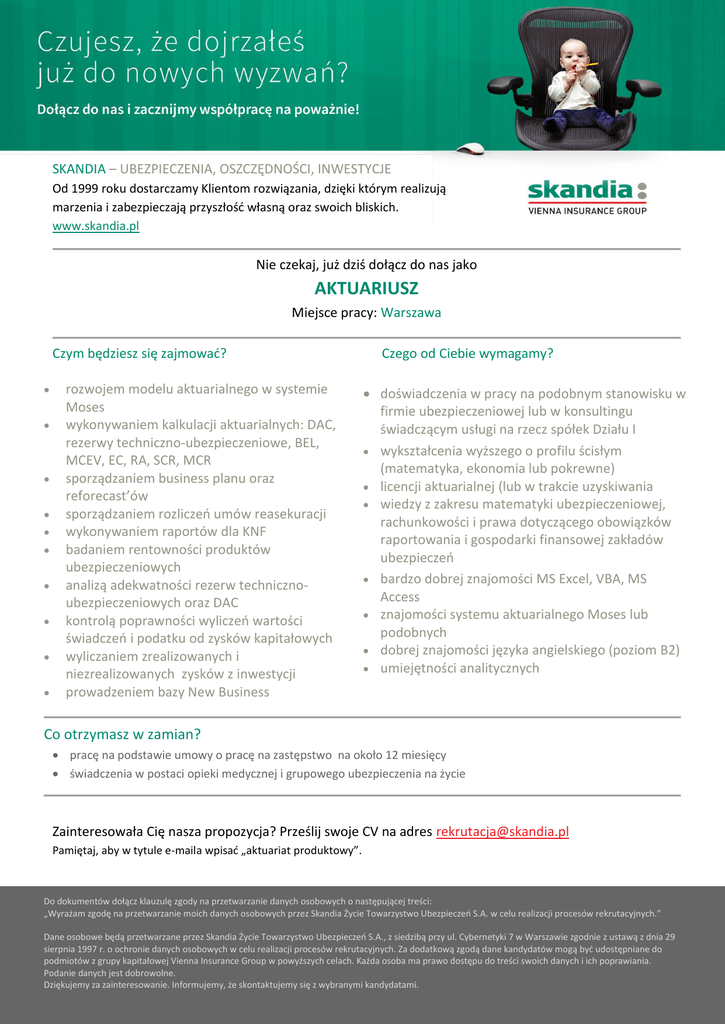 SKANDIA – UBEZPIECZENIA, OSZCZĘDNOŚCI, INWESTYCJE Od 1999 roku dostarczamy Klientom rozwiązania, dzięki którym realizują marzenia i zabezpieczają przyszłość własną oraz swoich bliskich. www.skandia.pl Nie czekaj, już dziś dołącz do nas jako AKTUARIUSZ Miejsce pracy: Warszawa Czym będziesz się zajmować? rozwojem modelu aktuarialnego w systemie Moses wykonywaniem kalkulacji aktuarialnych: DAC, rezerwy techniczno-ubezpieczeniowe, BEL, MCEV, EC, RA, SCR, MCR sporządzaniem business planu oraz reforecast’ów sporządzaniem rozliczeń umów reasekuracji wykonywaniem raportów dla KNF badaniem rentowności produktów ubezpieczeniowych analizą adekwatności rezerw technicznoubezpieczeniowych oraz DAC kontrolą poprawności wyliczeń wartości świadczeń i podatku od zysków kapitałowych wyliczaniem zrealizowanych i niezrealizowanych zysków z inwestycji prowadzeniem bazy New Business Czego od Ciebie wymagamy? doświadczenia w pracy na podobnym stanowisku w firmie ubezpieczeniowej lub w konsultingu świadczącym usługi na rzecz spółek Działu I wykształcenia wyższego o profilu ścisłym (matematyka, ekonomia lub pokrewne) licencji aktuarialnej (lub w trakcie uzyskiwania wiedzy z zakresu matematyki ubezpieczeniowej, rachunkowości i prawa dotyczącego obowiązków raportowania i gospodarki finansowej zakładów ubezpieczeń bardzo dobrej znajomości MS Excel, VBA, MS Access znajomości systemu aktuarialnego Moses lub podobnych dobrej znajomości języka angielskiego (poziom B2) umiejętności analitycznych Co otrzymasz w zamian? pracę na podstawie umowy o pracę na zastępstwo na około 12 miesięcy świadczenia w postaci opieki medycznej i grupowego ubezpieczenia na życie Zainteresowała Cię nasza propozycja? Prześlij swoje CV na adres [email protected] Pamiętaj, aby w tytule e-maila wpisać „aktuariat produktowy”. Do dokumentów dołącz klauzulę zgody na przetwarzanie danych osobowych o następującej treści: „Wyrażam zgodę na przetwarzanie moich danych osobowych przez Skandia Życie Towarzystwo Ubezpieczeń S.A. w celu realizacji procesów rekrutacyjnych.” Dane osobowe będą przetwarzane przez Skandia Życie Towarzystwo Ubezpieczeń S.A., z siedzibą przy ul. Cybernetyki 7 w Warszawie zgodnie z ustawą z dnia 29 sierpnia 1997 r. o ochronie danych osobowych w celu realizacji procesów rekrutacyjnych. Za dodatkową zgodą dane kandydatów mogą być udostępniane do podmiotów z grupy kapitałowej Vienna Insurance Group w powyższych celach. Każda osoba ma prawo dostępu do treści swoich danych i ich poprawiania. Podanie danych jest dobrowolne. Dziękujemy za zainteresowanie. Informujemy, że skontaktujemy się z wybranymi kandydatami.