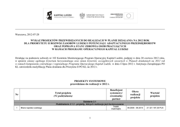 Warszawa, 2012-07-20 WYKAZ PROJEKTÓW PRZEWIDZIANYCH DO REALIZACJI W PLANIE DZIAŁANIA NA 2012 ROK DLA PRIORYTETU II ROZWÓJ ZASOBÓW LUDZKI I POTENCJAŁU ADAPTACYJNEGO PRZEDSIĘBIORSTW ORAZ POPRAWA STANU ZDROWIA OSÓB PRACUJĄCYCH W RAMACH PROGRAMU OPERACYJNEGO KAPITAŁ LUDZKI Działając na podstawie uchwały nr 102 Komitetu Monitorującego Program Operacyjny Kapitał Ludzki, podjętej w dniu 20 czerwca 2012 roku, w sprawie zmiany ogólnego kryterium horyzontalnego oraz zmian kryteriów szczegółowych zawartych w Planach działaniach na 2012 rok w ramach komponentu centralnego i regionalnego Programu Operacyjnego Kapitał Ludzki, w dniu 4 lipca 2012 r. Instytucja Zarządzająca PO KL zatwierdziła modyfikację Planu działania dla Priorytetu II PO KL na 2012 r. PROJEKTY SYSTEMOWE przewidziane do realizacji w 2012 r. Beneficjent systemowy/ ewentualny partner Tytuł projektu (Nr poddziałania) Nr Okres realizacji projektu Wartość projektu 09.2008 - 09.2015 21 321 187,30 PLN Działanie 2.1 Poddziałanie 2.1.3 - projekty, których realizacja jest kontynuowana 1 PARP; PARTNER: Bilans kapitału ludzkiego 1 Uniwersytet Jagielloński 2 Promocja szkoleń i popularyzacja idei podnoszenia kwalifikacji zawodowych przez całe życie PARP 02.2008 - 12.2013 30 000 000,00 PLN 3 Akademia PARP PARP 02.2008 - 09.2015 45 849 811,91 PLN 4 Każdy pracownik jest ważny – podnoszenie kompetencji pracowników o niskich kwalifikacjach PARP 08.2008 - 09.2013 13 543 901,14 PLN 5 Firmy rodzinne PARP 05.2008 - 03.2012 4 799 589,20 PLN 6 Rozwój zasobów ludzkich poprzez promowanie wiedzy, transfer i upowszechnianie innowacji PARP 02.2009 - 03.2013 38 685 000,00 PLN 7 Inwestycja w kadry 3 PARP 04.2009 - 12.2013 15 479 227,89 PLN 8 Powiązania kooperacyjne polskich przedsiębiorstw PARP 04.2009 - 12.2013 12 191 198,29 PLN 9 Szkolenia z zakresu zarządzania środowiskiem PARP 04.2009 - 12.2012 4 060 390,49 PLN 10 Ogólnopolski program promocji i szkoleń dla przedsiębiorstw – Telepraca II PARP 04.2009 - 06.2012 8 181 712,83 PLN 04.2009 - 06.2014 61 000 000,00 PLN 07.2009 - 09.2013 15 885 947,07 PLN 08.2009 - 12.2013 12 413 045,02 PLN PARP; PARTNER: Uniwersytet Ekonomiczny w Krakowie (Małopolska Szkoła Administracji Publicznej) PARP; PARTNER: Uniwersytet Warszawski PARP; PARTNER: Urząd Zamówień Publicznych 11 Instrument Szybkiego Reagowania 12 Z wiekiem na plus – szkolenia dla przedsiębiorstw 13 Nowe podejście do zamówień publicznych – szkolenia i doradztwo 14 Planowanie strategiczne w MMSP PARP 04.2010 - 09.2014 9 976 000,00 PLN 15 Aktywny emeryt PARP 04.2010 - 12.2013 7 930 300,00 PLN 16 Poprawa wizerunku przedsiębiorców i promocja postaw przedsiębiorczych PARP 02.2011 - 03.2014 12 000 000,00 PLN 2 17 Partnerstwo publiczno - prywatne 18 Biznes dla edukacji PARP; PARTNER: Instytut Partnerstwa Publiczno – Prywatnego PARP; PARTNER: Polskie Stowarzyszenie Zarządzania Kadrami 05.2011 - 12.2014 10 047 180,00 PLN 01.2012 - 02.2015 (umowa w trakcie podpisywania) 11 408 596,16 PLN Poddziałanie 2.1.3 – projekty, których realizacja rozpocznie się w 2012 roku 1 Zarządzanie kompetencjami w MSP PARP 04.2012 - 03.2015 11 200 000,00 PLN 2 Społeczna odpowiedzialność biznesu PARP 04.2012 - 03.2015 13 000 000,00 PLN 3 MMP dostawcą usług dla osób starszych PARP 04.2012- 03.2015 10 000 000,00 PLN 4 Portal HR PARP 06.2012-03.2015 11 782 600,00 PLN PARP 06.2008 - 12.2013 50 000 000,00 PLN PARP 04.2009 - 03.2014 30 000 000,00 PLN PARP 07.2008 - 03.2012 88 203 730,82 PLN Działanie 2.2 Poddziałanie 2.2.1 – projekty, których realizacja jest kontynuowana Wsparcie i rozwój instytucji świadczących usługi na rzecz przedsiębiorczości oraz ich sieci 1 Inicjatywy promujące postawy przedsiębiorcze i wspierające rozwój przedsiębiorczości – Fundusz Grantów na Inicjatywy Wsparcie systemu kompleksowych usług informacyjnych dla przedsiębiorców i osób zamierzających rozpocząć działalność gospodarczą poprzez finansowanie sieci Punktów Konsultacyjnych 2 3 4 Zapewnienie dostępu przedsiębiorstw do nowych usług KSU PARP 12.2011 - 12.2014 35 778 000,00 PLN 5 Zapewnienie usług z zakresu rozwoju firmy dla przedsiębiorców oraz osób zamierzających rozpocząć działalność gospodarczą w formule one-stop-shops PARP 10.2011 - 03.2014 69 720 000,00 PLN Poddziałanie 2.2.1 – projekty, których realizacja rozpocznie się w 2012 roku 1 Planowanie działań w MSP a finansowanie zwrotne PARP 07.2012 – 12.2014 21 000 000,00 PLN 03.2008 - 12.2014 100 000 000,00 PLN 04.2008 - 02.2013 9 157 070,83 PLN Poddziałanie 2.2.2 – projekty, których realizacja jest kontynuowana 1 Podnoszenie kompetencji kadry szkoleniowej PARP Działanie 2.3 Poddziałanie 2.3.1 - projekty, których realizacja jest kontynuowana 1 Instytut Medycyny Pracy im. prof. Opracowanie kompleksowych programów profilaktycznych 3 2 Opracowanie i wdrożenie programu profilaktycznego w zakresie wczesnego wykrywania nowotworów układu moczowo – płciowego u pracujących mężczyzn w wieku od 45 roku życia (45+) ukierunkowanego na przeciwdziałanie ich dezaktywizacji zawodowej (w szczególności osób wykonujących zawody, co do których istnieje wyższe prawdopodobieństwo narażenia na choroby nowotworów układu moczowo – płciowego) Jerzego Nofera w Łodzi; PARTNER: Instytut Medycyny Wsi im. Witolda Chodźki w Lublinie Departament Polityki Zdrowotnej – Ministerstwo Zdrowia; PARTNER: Centrum Onkologii – Instytut im. Marii Skłodowskiej – Curie w Warszawie 10.2010 - 12.2013 24 310 195,40 PLN 01.2007 - 06.2015 115 380 339,80 PLN 05.2008 - 06.2015 179 607 929,82PLN 09.2009 - 06.2015 35 534 180,09 PLN 10.2009 - 06.2015 20 284 744,58 PLN 01.2012 - 06.2015 25 000 000,00 PLN Poddziałanie 2.3.2 - projekty, których realizacja jest kontynuowana 1 Kształcenie w ramach procesu specjalizacji lekarzy deficytowych specjalności tj. onkologów, kardiologów i lekarzy medycyny pracy 2 Kształcenie zawodowe pielęgniarek i położnych