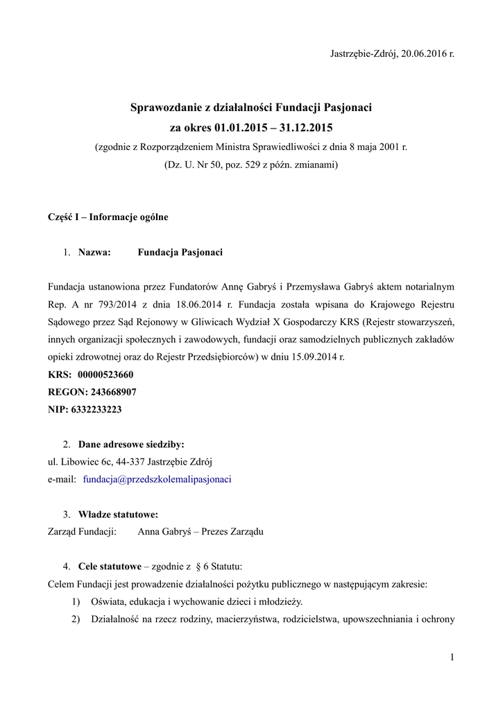 Jastrzębie-Zdrój, 20.06.2016 r. Sprawozdanie z działalności Fundacji Pasjonaci za okres 01.01.2015 – 31.12.2015 (zgodnie z Rozporządzeniem Ministra Sprawiedliwości z dnia 8 maja 2001 r. (Dz. U. Nr 50, poz. 529 z późn. zmianami) Część I – Informacje ogólne 1. Nazwa: Fundacja Pasjonaci Fundacja ustanowiona przez Fundatorów Annę Gabryś i Przemysława Gabryś aktem notarialnym Rep. A nr 793/2014 z dnia 18.06.2014 r. Fundacja została wpisana do Krajowego Rejestru Sądowego przez Sąd Rejonowy w Gliwicach Wydział X Gospodarczy KRS (Rejestr stowarzyszeń, innych organizacji społecznych i zawodowych, fundacji oraz samodzielnych publicznych zakładów opieki zdrowotnej oraz do Rejestr Przedsiębiorców) w dniu 15.09.2014 r. KRS: 00000523660 REGON: 243668907 NIP: 6332233223 2. Dane adresowe siedziby: ul. Libowiec 6c, 44-337 Jastrzębie Zdrój e-mail: fundacja@przedszkolemalipasjonaci 3. Władze statutowe: Zarząd Fundacji: Anna Gabryś – Prezes Zarządu 4. Cele statutowe – zgodnie z § 6 Statutu: Celem Fundacji jest prowadzenie działalności pożytku publicznego w następującym zakresie: 1) Oświata, edukacja i wychowanie dzieci i młodzieży. 2) Działalność na rzecz rodziny, macierzyństwa, rodzicielstwa, upowszechniania i ochrony 1 praw dziecka. 3) Wspieranie i upowszechnianie kultury fizycznej dzieci i młodzieży. 4) Działalność charytatywna na rzecz dzieci i młodzieży oraz rodzin w trudnej sytuacji życiowej. 5) Działalność w zakresie upowszechniania i popularyzacji kultury, sztuki, ochrony dóbr kultury i dziedzictwa narodowego wśród dzieci i młodzieży, zwłaszcza w sytuacji materialnej. 6) Ochrona i promocja zdrowia dzieci i młodzieży, zwłaszcza w trudnej sytuacji życiowej. 7) Pomoc społeczna, w tym pomoc rodzinom i osobom w trudnej sytuacji życiowej oraz wyrównywania szans tych rodzin i osób. 8) Upowszechnianie turystyki i krajoznawstwa wśród dzieci i młodzieży, zwłaszcza w trudnej sytuacji życiowej. 9) Upowszechnianie i popularyzacja oraz organizacja wolontariatu. 10) Działalność na rzecz integracji europejskiej oraz rozwijanie kontaktów i współpracy między społeczeństwami. 11) Podtrzymywanie i upowszechnianie tradycji narodowej, pielęgnowania polskości oraz rozwoju świadomości narodowej, obywatelskiej i kulturowej wśród dzieci i młodzieży. 12) Organizacja wypoczynku dzieci i młodzieży, zwłaszcza w trudnej sytuacji życiowej. 13) Promocja ekologii i ochrony zwierząt oraz ochrony dziedzictwa przyrodniczego. Fundacja realizuje cele poprzez (zgodnie z § 7 Statutu): 1) Prowadzenie kursów, warsztatów i zajęć dla dzieci i młodzieży oraz osób dorosłych. 2) Prowadzenie warsztatów i grup wsparcia dla rodzin, organizowanie szkoleń i poradnictwa dla rodzin, realizowanie programów prorodzinnych. 3) Organizowanie wsparcia finansowego i rzeczowego dla rodzin i dzieci zagrożonych ubóstwem i wykluczeniem w celu wyrównywania szans, oraz dla osób chorych i niepełnosprawnych wymagających pomocy przy leczeniu. 4) Organizowanie konkursów i upowszechnianie wśród dzieci i młodzieży wiedzy w zakresie wychowania w rodzinie, sportu i zdrowego trybu życia, kultury, dziedzictwa narodowego, turystyki i krajoznawstwa, wolontariatu, tradycji narodowej, wiedzy o Unii Europejskiej, ekologii i ochrony przyrody. 5) Zakładanie, prowadzenie, wyposażanie, utrzymywanie, kierowanie i zarządzanie przedszkolami. 2 6) Opracowywanie programów nauczania przedszkolnego i wczesnoszkolnego. 7) Prace badawcze związane z edukacją przedszkolną i wczesnoszkolną. 8) Prowadzenie profilaktyki i promocja zdrowia. 9) Prowadzenie konsultacji i terapii psychologicznej oraz logopedycznej dla dzieci i młodzieży. 10) Prowadzenie działalności stypendialnej. 11) Organizowanie wyjazdów turystycznych i edukacyjnych dla dzieci i młodzieży oraz rodzin. 12) Organizowanie szkoleń, seminariów i konferencji. 13) Organizacja imprez i przedsięwzięć oświatowych i edukacyjnych, rekreacyjnych, sportowych, kulturalnych oraz o charakterze integracyjnym. 14) Planowanie i realizacja kampanii społecznych i informacyjnych wspomagających realizację celów Fundacji. 15) Organizowanie zbiórek publicznych w kraju i za granicą. 16) Pozyskiwanie sponsorów stałych i okolicznościowych. 17) Współpracę z władzami samorządowymi, rządowymi i organizacjami pozarządowymi w zakresie wymienionym w celach działania Fundacji. 5. Odpisy uchwał Zarządu Fundacji – w załączeniu 6. Działalność gospodarcza Fundacja Pasjonaci jest wpisana do rejestru Przedsiębiorców Krajowego Rejestru Sądowego. Dochód z prowadzonej działalności gospodarczej służy wyłącznie realizacji celów statutowych. Działalność gospodarcza prowadzona jest w następującym zakresie: (działalność przeważająca) 8510.Z Wychowanie przedszkolne 8551.Z Pozaszkolne formy edukacji sportowej oraz zajęć sportowych i rekreacyjnych 8559.B Pozostałe pozaszkolne formy edukacji, gdzie indziej niesklasyfikowane 8891.Z Opieka dzienna nad dziećmi Część II – Informacje finansowe za okres 01.01.2015 – 31.12.2015 1. Przychody statutowe wg źródeł pochodzenia 3 Darowizny Dotacje ze źródeł publicznych FIO – lokalnie 2015 (Projekt „MY-MA-MY”) Program „Maluch” 2015 Przychody – przedszkole, żłobek Przedszkole - opłaty, czesne i wpisowe Przedszkole - zajęcia dodatkowe Żłobek – czesne, wpisowe, dodatkowe opłaty 128 829,47 zł 46 860,50 zł 3 916,50 zł 42 944,00 zł 133 793,11 zł 50 141,00 zł 7 571,10 zł 75 268,00 zł Pozostałe koszty 813,01 zł Pozostałe przychody operacyjne 701,41 zł RAZEM 310 184,49 zł 2. Koszty statutowe oraz administracyjne Koszty statutowe - realizacja zadań publicznych: 3 916,50 zł Zużycie materiałów i energii 921,00 zł Usługi obce 1 315,50 zł Wynagrodzenia 1 480,00 zł Koszty promocji i reklamy Koszty statutowe - przedszkole, żłobek 200,00 zł 212 769,14 zł Zużycie materiałów i energii 35 270,40 zł Usługi 