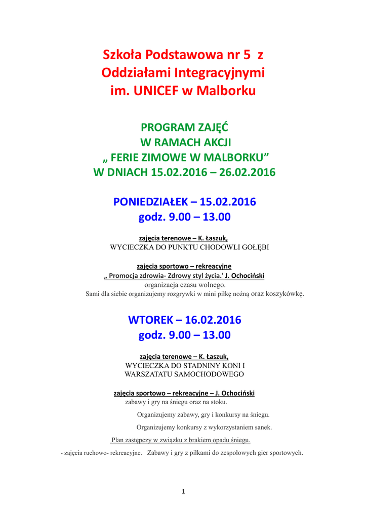 Szkoła Podstawowa nr 5 z Oddziałami Integracyjnymi im. UNICEF w Malborku PROGRAM ZAJĘĆ W RAMACH AKCJI „ FERIE ZIMOWE W MALBORKU” W DNIACH 15.02.2016 – 26.02.2016 PONIEDZIAŁEK – 15.02.2016 godz. 9.00 – 13.00 zajęcia terenowe – K. Łaszuk, WYCIECZKA DO PUNKTU CHODOWLI GOŁĘBI zajęcia sportowo – rekreacyjne „ Promocja zdrowia- Zdrowy styl życia.' J. Ochociński organizacja czasu wolnego. Sami dla siebie organizujemy rozgrywki w mini piłkę nożną oraz koszykówkę. WTOREK – 16.02.2016 godz. 9.00 – 13.00 zajęcia terenowe – K. Łaszuk, WYCIECZKA DO STADNINY KONI I WARSZATATU SAMOCHODOWEGO zajęcia sportowo – rekreacyjne – J. Ochociński zabawy i gry na śniegu oraz na stoku. Organizujemy zabawy, gry i konkursy na śniegu. Organizujemy konkursy z wykorzystaniem sanek. Plan zastępczy w związku z brakiem opadu śniegu. - zajęcia ruchowo- rekreacyjne. Zabawy i gry z piłkami do zespołowych gier sportowych. 1 ŚRODA – 17.02.2016 godz. 9.00 – 13.00 zajęcia terenowe – K. Łaszuk, WYCIECZKA DO HELDRUKU zajęcia sportowo – rekreacyjne – J. Ochociński spędzamy czas wolny na sportowo. Sami dla siebie organizujemy rozgrywki w piłkę nożną, unihokeja i piłkę ręczną. CZWARTEK – 18.02.2016 godz. 9.00 – 13.00 zajęcia terenowe – K. Łaszuk, WYCIECZKA DO KOMENDY POWIATOWEJ POLICJI W MALBORKU zajęcia sportowo – rekreacyjne – J. Ochociński Gry i zabawy integrujące grupę. Gry zespołowe organizacja czasu wolnego. PIĄTEK – 19.02.2016 godz. 9.00 – 13.00 zajęcia terenowe – K. Łaszuk, WYCIECZKA DO KOMENDY PWIATOWEJ STRAŻY POŻARNEJ W MALBORKU, „WSPÓLNE GRILOWANIE”, PODSUMOWANIE ZAJĘĆ zajęcia sportowo – rekreacyjne – J. Ochociński Sami dla siebie organizujemy rozgrywki w piłkę nożną, siatkową. 2 PONIEDZIAŁEK – 22.02.2016 godz. 9.00 – 13.00 zajęcia sportowo – rekreacyjne – S.Orłowska Sami dla siebie organizujemy rozgrywki w mini piłkę nożną koszykówkę, piłkę ręczną, siatkówkę. Zajęcia ruchowo- muzyczne na stepach organizacja czasu wolnego. Przygotowujemy układy choreo graficzne w rytm muzyki. zajęcia plastyczne – D.Cybulska „Świat nitką malowany”- maczanie nici lub wełny w farbie (czyste końcówki wystają poza kartkę), układanie wzoru na jednej połowie kartki, złożenie kartki i wyciąganie nici lub wełny; dorysowywanie dowolnych elementów farbami, kredkami lub ołówkiem. Pomoce - nici lub wełna o różnej grubości, farby, kubek, woda, pędzel, kredki,ołówek, karton. „Kolorowe witraże” - przedstawienie za pomocą kolorowych papierów i bibuły różnych elementów przyrody w technice witrażu. Odrysowywanie od szablonów, wycinanie, klejenie poszczególnych elementów. Pomoce - kolorowy papier, bibuła, nożyczki, karton, szablony, ołówek, klej. (tematyka zajęć do wyboru) WTOREK – 23.02.2016 godz. 9.00 – 13.00 zajęcia sportowo – rekreacyjne – S. Orłowska Zabawy i gry na śniegu oraz na stoku. Organizujemy zabawy, gry i konkursy na śniegu. Organizujemy konkursy z wykorzystaniem sanek i ślizgów. Plan zastępczy w związku z brakiem opadu śniegu. Zabawy i gry z piłkami do zespołowych gier sportowych. Ćwiczymy układy taneczne na stepach. 3 Zajęcia plastyczne- D. Cybulska „Zimowy krajobraz nocą” - malowanie różnych wzorów białą farbą plakatową białą kredką lub białą kredą na czarnym lub granatowym kartonie; wycięcie z białego kartonu - formy okna i przyklejenie go do rysunku. Pomoce - czarny lub granatowy karton, biały karton, biała kredka, biała kreda, nożyczki, biała farba, pędzel, klej, kubek, woda. „Karmnik dla ptaków” - wykonanie karmnika dla ptaków według instrukcji „krok po kroku”. Pomoce - pudełka, ścinki tkanin, nożyczki, pędzel, farby, klej, kubek, woda. ( tematyka zajęć do wyboru) ŚRODA – 24.02.2016 godz. 9.00 – 13.00 zajęcia sportowo – rekreacyjne – S. Orlowska Sami dla siebie organizujemy rozgrywki w piłkę nożną, unihokeja, ringo i siatkówkę. Tańczymy zumbę-.uczeń wykonuje ćwiczenia kształtujące przy muzyce. zajęcia plastyczne- D. Cybulska „Pomysłowe rzeźby ze śniegu” - indywidualne lepienie różnych kształtów ze śniegu według własnego pomysłu, złączenie ich w jedną wspólną rzeźbę. Jeśli nie będzie śniegu lepienie z plasteliny lub z modeliny. Pomoce - plastelina lub modelina. „Nasz wesoły bałwanek”- lepienie bałwana ze śniegu lub wyklejanie bałwana z okrągłych wacików, dorysowywanie i doklejanie dodatkowych elementów. Pomoce - waciki, karton, papier kolorowy, klej, flamastry, pędzel, farby, kubek, woda. ( tematyka zajęć do wyboru) 4 CZWARTEK – 25.02.2016 godz. 9.00 – 13.00 zajęcia sportowo – rekreacyjne – S. Orłowska Zabawy i gry na śniegu oraz na stoku. Organizujemy zabawy, gry i konkursy na śniegu. Organizujemy wyścigi z wykorzystaniem sanek. Plan zastępczy w związku z brakiem opadu śniegu. Gry zespołowe - organizacja czasu wolnego.. Zajęcia ruchowo- muzyczne na stepach organizacja czasu wolnego. Przygotowujemy układy choreo graficzne w rytm muzyki. zajęcia plastyczne- D. Cybulska „Kartki okolicznościowe” - zaprojektowanie i wykonanie kartek według własnego pomysłu - technika dowolna. Pomoce - brystol, folia, papier samoprzylepny, suszone liście i kwiaty, ścinki tkanin, papier kolorowy, bibuła, klej, flamastry, kredki, plastelina, pędzel, farby, kubek, woda. „Fantazyjny wazon” - wykonanie wazonu poprzez oklejanie pojemnika różnymi materiałami. Pomoce - pojemnik plastikowy, metalowy lub szklany, plastelina, nasiona, ziarna, pestki, ścinki tkanin, papier kolorowy, gazety, klej, folia. ( tematyka zajęć do wyboru) PIĄTEK – 26.02.2016 godz. 9.00 – 13.00 zajęcia sportowo – rekreacyjne – S. Orłowska Wycieczka na lodowisko. Organizujemy zabawy na lodzie- doskonalimy jazdę na lodzie, doskonalimy krok łyżwowy, przekładankę i jazdę po kole. Sami dla siebie organizujemy rozgrywki w