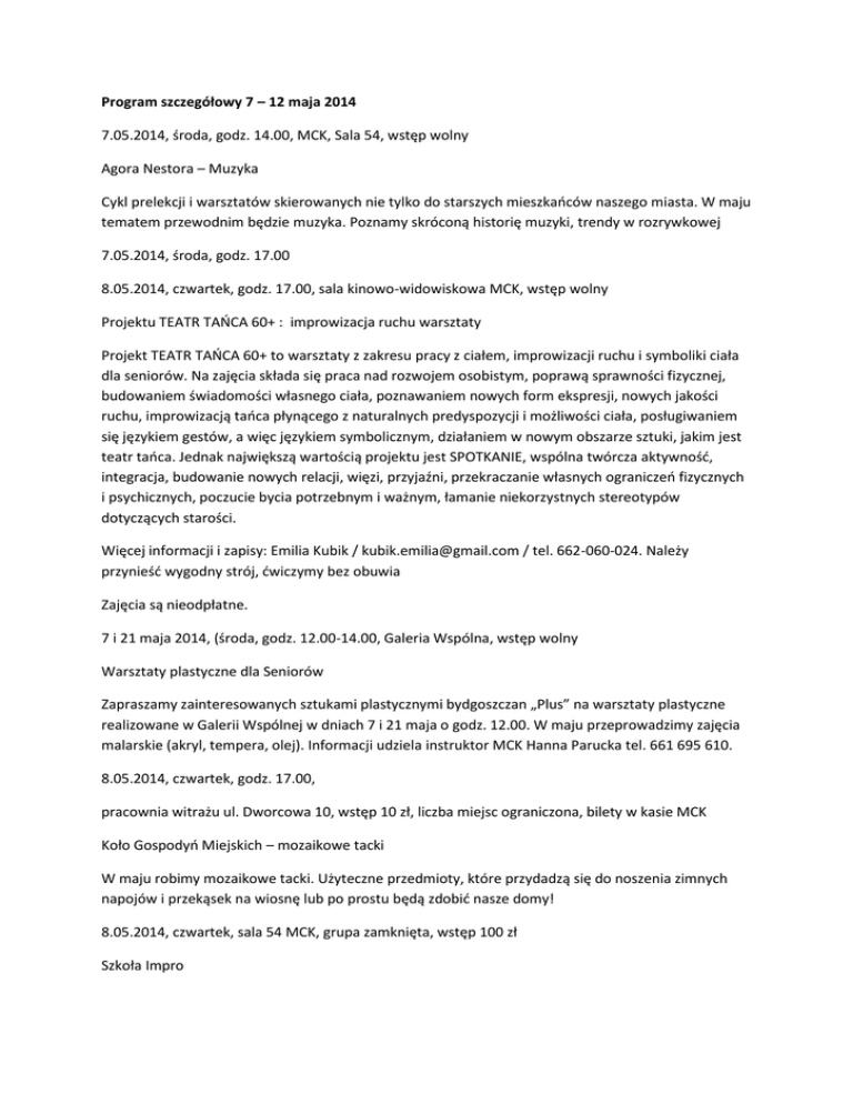 Program szczegółowy 7 – 12 maja 2014 7.05.2014, środa, godz. 14.00, MCK, Sala 54, wstęp wolny Agora Nestora – Muzyka Cykl prelekcji i warsztatów skierowanych nie tylko do starszych mieszkańców naszego miasta. W maju tematem przewodnim będzie muzyka. Poznamy skróconą historię muzyki, trendy w rozrywkowej 7.05.2014, środa, godz. 17.00 8.05.2014, czwartek, godz. 17.00, sala kinowo-widowiskowa MCK, wstęp wolny Projektu TEATR TAŃCA 60+ : improwizacja ruchu warsztaty Projekt TEATR TAŃCA 60+ to warsztaty z zakresu pracy z ciałem, improwizacji ruchu i symboliki ciała dla seniorów. Na zajęcia składa się praca nad rozwojem osobistym, poprawą sprawności fizycznej, budowaniem świadomości własnego ciała, poznawaniem nowych form ekspresji, nowych jakości ruchu, improwizacją tańca płynącego z naturalnych predyspozycji i możliwości ciała, posługiwaniem się językiem gestów, a więc językiem symbolicznym, działaniem w nowym obszarze sztuki, jakim jest teatr tańca. Jednak największą wartością projektu jest SPOTKANIE, wspólna twórcza aktywność, integracja, budowanie nowych relacji, więzi, przyjaźni, przekraczanie własnych ograniczeń fizycznych i psychicznych, poczucie bycia potrzebnym i ważnym, łamanie niekorzystnych stereotypów dotyczących starości. Więcej informacji i zapisy: Emilia Kubik / [email protected] / tel. 662-060-024. Należy przynieść wygodny strój, ćwiczymy bez obuwia Zajęcia są nieodpłatne. 7 i 21 maja 2014, (środa, godz. 12.00-14.00, Galeria Wspólna, wstęp wolny Warsztaty plastyczne dla Seniorów Zapraszamy zainteresowanych sztukami plastycznymi bydgoszczan „Plus” na warsztaty plastyczne realizowane w Galerii Wspólnej w dniach 7 i 21 maja o godz. 12.00. W maju przeprowadzimy zajęcia malarskie (akryl, tempera, olej). Informacji udziela instruktor MCK Hanna Parucka tel. 661 695 610. 8.05.2014, czwartek, godz. 17.00, pracownia witrażu ul. Dworcowa 10, wstęp 10 zł, liczba miejsc ograniczona, bilety w kasie MCK Koło Gospodyń Miejskich – mozaikowe tacki W maju robimy mozaikowe tacki. Użyteczne przedmioty, które przydadzą się do noszenia zimnych napojów i przekąsek na wiosnę lub po prostu będą zdobić nasze domy! 8.05.2014, czwartek, sala 54 MCK, grupa zamknięta, wstęp 100 zł Szkoła Impro – warsztaty improwizacji teatralnej z Teatrem Improwizowanym wymyWammy dla pierwszej grupy warsztatowej (poziom podstawowy). Teatr Improwizowany wymyWammy to jedyny taki teatr w Bydgoszczy. Zależy nam na tym, by wypełnić lukę w mieście istniejącą na tym polu. Chcemy przybliżyć bydgoszczanom stosunkowo młodą, wyjątkową formę teatralną, w której widz jest współautorem i aktywnym uczestnikiem pokazów teatralnych. 9-13 maja 2014, godz. 10.00-17.00, Pałac w Ostromecku, wstęp 100 zł, zapisy: [email protected] SYTUACJA TEATR: Warsztaty Przemysława Błaszczaka (Instytut Grotowskiego we Wrocławiu) Normy, społeczne konwenanse, maniery, zasady tworzą środowisko, w którym kształtuje się nasza fizyczność, relacja do ciała – „ciałopogląd”. W dużym stopniu to, jak chodzimy, biegamy tańczymy, dotykamy się i siebie nawzajem jest uwarunkowane kulturowo, choć zarazem tak głęboko zakorzenione w naszym wnętrzu, że łatwo przychodzi nam się z tym utożsamić, powiedzieć „taki jestem”. Warsztaty mają na celu zapomnienie ciała, jakim go znamy, by wsłuchać się w to istniejące tu i teraz, w relacji z samym sobą, przestrzenią, partnerem czy wreszcie grupą. Poprzez głęboką koncentrację w treningu indywidualnym oraz partnerskim będziemy odkrywać nowe sposoby percepcji i komunikacji, improwizacji polegającej na współ-działaniu, współ-tworzeniu, współ-istnieniu w procesie twórczym. Przemysław Błaszczak – aktor, od 1995 roku związany z Instytutem im. Jerzego Grotowskiego. W latach 1996-1999 pracował w Teatrze Pieśń Kozła pod kierownictwem Grzegorza Brala. W latach 2002-2003 przygotował własny monodram Ecce homo. Od roku 2004 aktor Teatru ZAR, zespołu teatralnego działającego przy Instytucie Grotowskiego. Warsztaty zakończone zostaną pokazem 14 maja 2014 o godz. 17.00 w MCK 9-12.05.2014 Prolog do bydgoskiego aneksu Planete+ Doc Film Festival Bezpłatne pokazy filmów dokumentalnych promujące bydgoską część festiwalu Planete+ Doc. Lokalizacje: klub STReFA, klub Mózg, Kino Jeremi, UKW Tydzień przed bydgoskim aneksem międzynarodowego festiwalu filmów dokumentalnych Planete Doc+ FF zapraszamy na prolog w postaci czterech pokazów filmów dokumentalnych zapowiadających główne wydarzenie festiwalowe. Prolog odbywa się od 9 do 12 maja. Na główną część bydgoskiej edycji Planete+ Doc FF zapraszamy do Kina Orzeł i Mózgu w dniach 16-19.05.2014. W prologu znalazły się trzy długometrażowe filmy dokumentalne znane z poprzednich edycji Planete+ Doc FF oraz akcent lokalny w postaci pokazu zestawu filmów bydgoszczanina Krzysztofa Nowickiego. Najbardziej znanym filmem prologu jest "Sztuka znikania" w reżyserii Bartosza Konopki, który wcześniej otrzymał nominację do Oskara za film "Królik po berlińsku". Program prologu •9.05.2014 piątek godz. 20:00 "Koniec czasu. Wszystko zaczyna się teraz" reż. Peter Mettler, Szwajcaria, 2012, 109 min, klubokawiarnia Strefa, sala yogi •10.05.2014 sobota godz. 20:00 "Full metalowa wiocha" reż. Sung Hyung Cho, 90 min Mózg •11.05.2014 niedziela godz. 19:00 Krzysztof Nowicki - dokumenty tutejsze m.in. "Być jak Ironman" zestaw 76 min, Kino Jeremi •12.05.2014 poniedziałek godz. 19:00 "Sztuka znikania" reż. Bartosz Konopka, 52 min UKW ul. Chodkiewicza, aula Mikotoksyn bud F 9.05.2014, piątek, godz. 20.00, sala kinowo-widowiskowa MCK, wstęp wolny Premiery Płytowe: Alhena / gość otwierający wydarzenie Egoistic Zespół Alhena tworzą: Marta Bejma (wokal), Piotr Kowalski (klawisze), Tomasz Bogulski (gitara), Piotr Grugel (perkusja) i Grzegorz Ostrowski (bas). Grupa powstała w styczniu 2010 ro