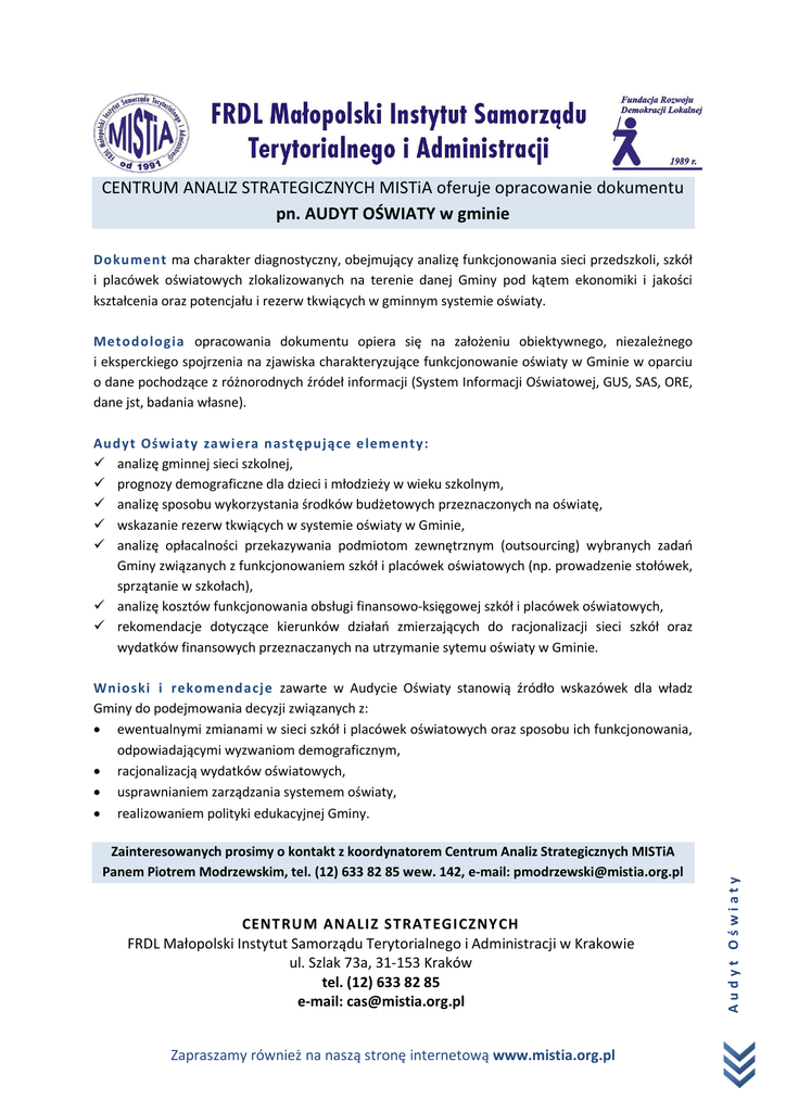 CENTRUM ANALIZ STRATEGICZNYCH MISTiA oferuje opracowanie dokumentu pn. AUDYT OŚWIATY w gminie Dokument ma charakter diagnostyczny, obejmujący analizę funkcjonowania sieci przedszkoli, szkół i placówek oświatowych zlokalizowanych na terenie danej Gminy pod kątem ekonomiki i jakości kształcenia oraz potencjału i rezerw tkwiących w gminnym systemie oświaty. Metodologia opracowania dokumentu opiera się na założeniu obiektywnego, niezależnego i eksperckiego spojrzenia na zjawiska charakteryzujące funkcjonowanie oświaty w Gminie w oparciu o dane pochodzące z różnorodnych źródeł informacji (System Informacji Oświatowej, GUS, SAS, ORE, dane jst, badania własne). Audyt Oświaty zawi era nast ępujące e lementy: analizę gminnej sieci szkolnej, prognozy demograficzne dla dzieci i młodzieży w wieku szkolnym, analizę sposobu wykorzystania środków budżetowych przeznaczonych na oświatę, wskazanie rezerw tkwiących w systemie oświaty w Gminie, analizę opłacalności przekazywania podmiotom zewnętrznym (outsourcing) wybranych zadań Gminy związanych z funkcjonowaniem szkół i placówek oświatowych (np. prowadzenie stołówek, sprzątanie w szkołach), analizę kosztów funkcjonowania obsługi finansowo-księgowej szkół i placówek oświatowych, rekomendacje dotyczące kierunków działań zmierzających do racjonalizacji sieci szkół oraz wydatków finansowych przeznaczanych na utrzymanie sytemu oświaty w Gminie. Zainteresowanych prosimy o kontakt z koordynatorem Centrum Analiz Strategicznych MISTiA Panem Piotrem Modrzewskim, tel. (12) 633 82 85 wew. 142, e-mail: [email protected] CENT RUM AN ALIZ STRAT EGICZNYCH FRDL Małopolski Instytut Samorządu Terytorialnego i Administracji w Krakowie ul. Szlak 73a, 31-153 Kraków tel. (12) 633 82 85 e-mail: [email protected] Zapraszamy również na naszą stronę internetową www.mistia.org.pl Audyt Oświaty Wnioski i rekomendacje zawarte w Audycie Oświaty stanowią źródło wskazówek dla władz Gminy do podejmowania decyzji związanych z: ewentualnymi zmianami w sieci szkół i placówek oświatowych oraz sposobu ich funkcjonowania, odpowiadającymi wyzwaniom demograficznym, racjonalizacją wydatków oświatowych, usprawnianiem zarządzania systemem oświaty, realizowaniem polityki edukacyjnej Gminy. O NAS Centrum Anali z Strategic znych (CAS) jest jednostką organizacyjną FRDL Małopolskiego Instytutu Samorządu Terytorialnego i Administracji specjalizującą się w realizacji badań społecznych oraz opracowywaniu analiz i raportów dotyczących funkcjonowania samorządu terytorialnego. Celem Centrum Analiz Strategicznych jest monitorowanie zmian społeczno-gospodarczych na poziomie lokalnym i regionalnym. Przygotowując raporty i analizy chcemy przyczynić się do zwiększenia skuteczności i efektywności decyzji podejmowanych przez władze regionalne i lokalne. CAS oferuje usługi analityczno-badawcze dotyczące kluczowych aspektów i obszarów działania samorządu, w szczególności rozwoju lokalnego, edukacji, kultury, rynku pracy i polityki społecznej. FRDL Małopol ski Instytut Samorządu Te rytorialnego i Administ racji (FRD L MISTiA) od ponad 20 lat udziela wsparcia samorządom lokalnym, organizacjom i środowiskom, biorącym udział w budowaniu społeczeństwa i państwa obywatelskiego. Głównym celem Instytutu jest wspomaganie rozwoju głównych sektorów państwa obywatelskiego, a także krzewienie idei oraz metod ich partnerskiej współpracy w relacjach lokalnych i regionalnych. Cel ten realizujemy głównie poprzez świadczenie na rzecz samorządów usług z zakresu doradztwa, szkoleń, konsultingu oraz badań i analiz. Prowadzimy również działalność na rzecz wspomagania integracji środowisk poprzez działalność forów i klubów (m.in. Forum Oświaty Samorządowej) oraz organizujemy konferencje i sympozja o zasięgu regionalnym, krajowym i międzynarodowym. FRDL MISTiA swoją ofertę kieruje zwłaszcza do jednostek samorządu terytorialnego z województwa małopolskiego i podkarpackiego. Na terenie województwa podkarpackiego funkcjonuje filia MISTiA – Podkarpacki Oś rodek Samo rządu Terytor ial nego (POST) . WSPÓŁPRACA: Audyt Oświaty NASI KLIENCI (wsparcie analityczno-badawcze), m.in.: