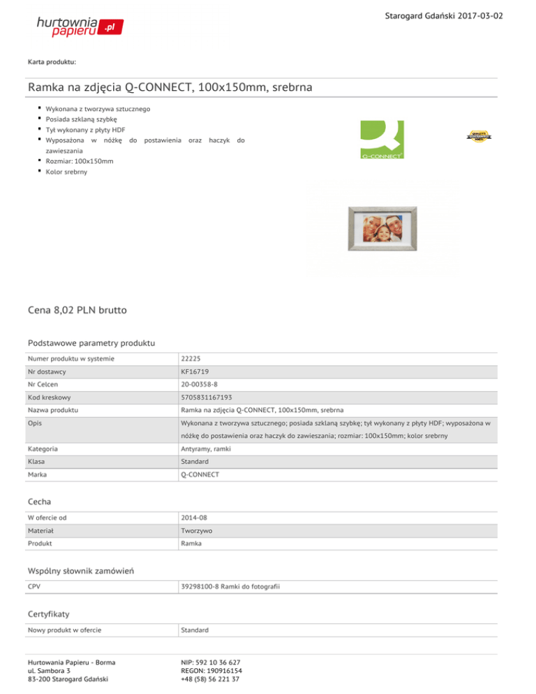 Starogard Gdański 2017-03-02 Karta produktu: Ramka na zdjęcia Q-CONNECT, 100x150mm, srebrna Wykonana z tworzywa sztucznego Posiada szklaną szybkę Tył wykonany z płyty HDF Wyposażona w nóżkę do postawienia oraz haczyk do zawieszania Rozmiar: 100x150mm Kolor srebrny Cena 8,02 PLN brutto Podstawowe parametry produktu Numer produktu w systemie 22225 Nr dostawcy KF16719 Nr Celcen 20-00358-8 Kod kreskowy 5705831167193 Nazwa produktu Ramka na zdjęcia Q-CONNECT, 100x150mm, srebrna Opis Wykonana z tworzywa sztucznego; posiada szklaną szybkę; tył wykonany z płyty HDF; wyposażona w nóżkę do postawienia oraz haczyk do zawieszania; rozmiar: 100x150mm; kolor srebrny Kategoria Antyramy, ramki Klasa Standard Marka Q-CONNECT Cecha W ofercie od 2014-08 Materiał Tworzywo Produkt Ramka Wspólny słownik zamówień CPV 39298100-8 Ramki do fotografii Certyfikaty Nowy produkt w ofercie Standard Hurtowania Papieru - Borma ul. Sambora 3 83-200 Starogard Gdański NIP: 592 10 36 627 REGON: 190916154 +48 (58) 56 221 37 Starogard Gdański 2017-03-02 Karta katalogowa produktu cd. Ramka na zdjęcia Q-CONNECT, 100x150mm, srebrna Hit Standard Wymiary Wymiary (mm) 100x150 Kolor Kolor Srebrny Pozostałe zdjęcia produktu Serdecznie zapraszamy do współpracy Hurtowania Papieru - Borma zespół. Hurtowania Papieru - Borma ul. Sambora 3 83-200 Starogard Gdański NIP: 592 10 36 627 REGON: 190916154 +48 (58) 56 221 37
