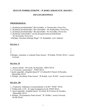 ZESTAW PODRĘCZNIKÓW – W ROKU SZKOLNYM 2016/2017– ZSP LENARTOWICE PRZEDSZKOLE: 1.,,Kolekcja przedszkolaka” dla trzylatka- A. Pawłowska, Nowa Era. 2.,,Kolekcja przedszkolaka” dla czterolatka - M .Prądzyńska, Nowa Era. 3.,,Kolekcja przedszkolaka” dla pięciolatka –M. Koszałka, Nowa Era. 3.,,Kolekcja sześciolatka” roczne przygotowanie przedszkolneM. Krzemień, Nowa Era. 4.Religia ,,Kocham dobrego Boga”- D. Kurpiński, wyd. Jedność. KLASA I 1. 2. 3. 4.Religia ,,Jesteśmy w rodzinie Pana Jezusa”, W.Kubik, WAM, 2012r.+ zeszyt ćwiczeń. KLASA II 1.,,Nasza szkoła”, M.Lorek, M.Zatorska , MEN 2015r. 2.,,Ćwiczenia z pomysłem” , WSiP 2015r. 3.Język angielski ,,English Quest II” J.Corbett,R.O Farrel, M Kondro, Macmillan 2012r. 4. Religia ,,Kochamy Pana Jezusa” ,W.Kubik, wyd. WAM + zeszyt ćwiczeń. KLASA III 1.,,Tropiciele. Edukacja wczesnoszkolna w kl.III”- WSiP 2014r. 2. Podręcznik z CD- do zajęć komputerowych, WSiP 2014r. 3. Język angielski ,,English Quest” JCorbett, R.O Farrel, M. Kondro, Macmillan 2013r. 4. Religia ,,Przyjmujemy Pana Jezusa” ,W. Kubik,+ zeszyt ćwiczeń, WAM 2014r. 1 KLASA IV 1. Język polski ,,Jutro pójdę w świat” H. Dobrowolska ,WSiP, 2012r. + ćwiczenia. 2. J.angielski : NEW HOT SPOT , Colin Granger. 3. Matematyka: ,, Matematyka z pomysłem” , B.Dubiecka- Kruk , E.Malicka WSiP + ćwiczenia cz.I i II .Wydanie z 2015r. 4. Przyroda: ,,Przyrodo witaj”,kl. IV ,,W domu i w okolicy” E. Gromek, E. Kłos, W. Kofto, E. Laskowska, A. Melson, WSiP 2012r.+ćwiczenia Atlas przyrodniczy WSiP. 5. Historia: ,,Klucz do historii” -historia i społeczeństwo ( podręcznik + zeszyt ćwiczeń) W.Kalwat, M.Lis,WSiP 2012r. 6. Plastyka: ,,Plastyka podręcznik do kl. 4 szkoły podstawowej” , S.Stopczyk, WSiP, 2012, 2013, 2014r. 7. Religia: ,,Zaproszeni przez Boga” Z.Marek, A.Hajduk, T.Nosek ,WAM Nowe wydanie2013, 2014r. 8. Zajęcia komputerowe ,,Lekcje z komputerem” kl.IV, W.Jochemczyk, I.Krajewska - Kanas, WSiP 2012,2013,2014r. 9.Muzyka:,,Klucz do muzyki” ,U.Smoczyńska, K.Jakubczak-Drążek, A.Sołtysik WSiP 2015r. 10. Technika: ,,Bądź bezpieczny na drodze. Karta rowerowa” podręcznik dla Kl. IV-VI szkoły podstawowej, WSiP 2012r. KLASA V. 1..J.polski: ,,Jutro pójdę w świat” H.Dobrowolska, podręcznik WSiP, 2013r. 2J.niemiecki: ,,Wir neu 2”,E.Książek- Kempa, E.Wieszczyczyńska, A.Kubicka, G.Motta, Lektorklett , podr.kl.V + zeszyt ćwiczeń 2013r. 3.Historia: Historia: ,,Klucz do historii” -historia i społeczeństwo ( podręcznik + zeszyt ćwiczeń) W.Kalwat, M.Lis, WSiP 4.Przyroda: ,,Przyrodo witaj”, kl.V ,E. Kłos ,zeszyt ćwiczeń , WSiP 2013r. 5.Matematyka: ,,Matematyka z pomysłem ” B.Dubiecka- Kruk, WSiP (+ ćwiczenia cz. I i II ) Wydanie z 2015r. 6.Muzyka: ,,Muzyka kl. IV-VI , M.Rykowska, Z. Szałko, Operon 2011r. 7.Religia:,,Obdarowani przez Boga” ks.Z.Marek, WAM. Nowe wydanie 2014, 2015r. 8.Zajęcia komputerowe ,,Lekcje z komputerem” kl.V, W.Jochemczyk, I.Krajewska – Kanas, WSiP 2013,2014r. 9.Plastyka: ,,Plastyka podręcznik do kl.5 szkoły podstawowej”, S.Stopczyk, WSiP 2013 , 2014r. 2 KLASA VI 1.J.polski : ,,Jutro pójdę w świat ” H.Dobrowolska, WSiP 2014r. 2.J.niemiecki: ,,Winer neu 3”E.Książek–Kempa, A.Kubicka, Motta,Lektorklett podręcznik kl. VI + zeszyt ćwiczeń, 2013r. 3.Historia; ,,Klucz do historii”, + ćwiczenia ,WSiP 2014r. 4.Przyroda: ,,Przyrodo witaj „kl.VI- ,podręcznik + ćwiczenia WSiP 2014 5.Matematyka: ,,Matematyka wokół nas”,H. Lewicka, podręcznik + ćwiczenia WSiP 2014r. 6.Plastyka: ,,Plastyka podręcznik do klasy 6 szkoły podstawowej, S.Stopczyk, WSiP 2014r. 7.Religia : ,,Przemienieni przez Boga”, ks. Z. Marek, ks. R. Nosek .nowe wyd. 8.Zajęcia komputerowe : ,,Lekcje z komputerem”, WSiP 2014r. 9.Muzyka: ,,Muzyka kl.IV-VI, M. Rykowska, Z. Szalko, Operon 2011-2014r. 3