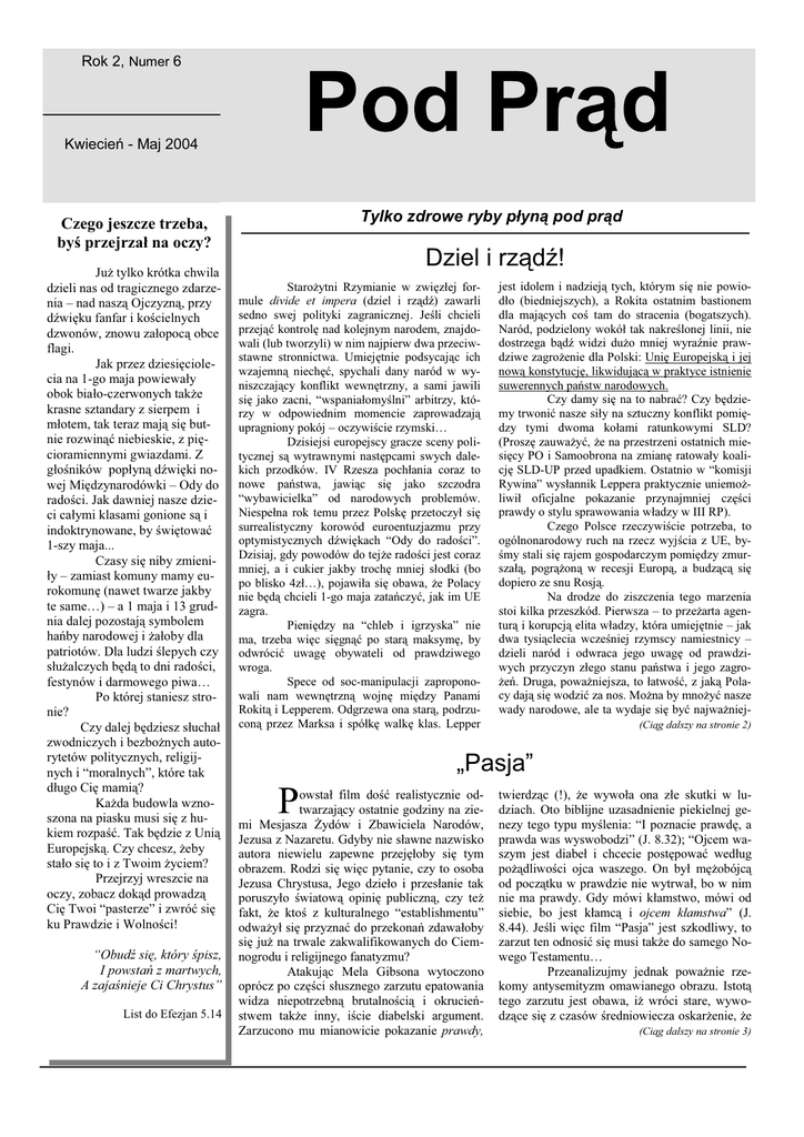 Rok 2, Numer 6 Kwiecień - Maj 2004 Tylko zdrowe ryby płyną pod prąd Czego jeszcze trzeba, byś przejrzał na oczy? Już tylko krótka chwila dzieli nas od tragicznego zdarzenia – nad naszą Ojczyzną, przy dźwięku fanfar i kościelnych dzwonów, znowu załopocą obce flagi. Jak przez dziesięciolecia na 1-go maja powiewały obok biało-czerwonych także krasne sztandary z sierpem i młotem, tak teraz mają się butnie rozwinąć niebieskie, z pięcioramiennymi gwiazdami. Z głośników popłyną dźwięki nowej Międzynarodówki – Ody do radości. Jak dawniej nasze dzieci całymi klasami gonione są i indoktrynowane, by świętować 1-szy maja... Czasy się niby zmieniły – zamiast komuny mamy eurokomunę (nawet twarze jakby te same…) – a 1 maja i 13 grudnia dalej pozostają symbolem hańby narodowej i żałoby dla patriotów. Dla ludzi ślepych czy służalczych będą to dni radości, festynów i darmowego piwa… Po której staniesz stronie? Czy dalej będziesz słuchał zwodniczych i bezbożnych autorytetów politycznych, religijnych i “moralnych”, które tak długo Cię mamią? Każda budowla wznoszona na piasku musi się z hukiem rozpaść. Tak będzie z Unią Europejską. Czy chcesz, żeby stało się to i z Twoim życiem? Przejrzyj wreszcie na oczy, zobacz dokąd prowadzą Cię Twoi “pasterze” i zwróć się ku Prawdzie i Wolności! “Obudź się, który śpisz, I powstań z martwych, A zajaśnieje Ci Chrystus” List do Efezjan 5.14 Dziel i rządź! Starożytni Rzymianie w zwięzłej formule divide et impera (dziel i rządź) zawarli sedno swej polityki zagranicznej. Jeśli chcieli przejąć kontrolę nad kolejnym narodem, znajdowali (lub tworzyli) w nim najpierw dwa przeciwstawne stronnictwa. Umiejętnie podsycając ich wzajemną niechęć, spychali dany naród w wyniszczający konflikt wewnętrzny, a sami jawili się jako zacni, “wspaniałomyślni” arbitrzy, którzy w odpowiednim momencie zaprowadzają upragniony pokój – oczywiście rzymski… Dzisiejsi europejscy gracze sceny politycznej są wytrawnymi następcami swych dalekich przodków. IV Rzesza pochłania coraz to nowe państwa, jawiąc się jako szczodra “wybawicielka” od narodowych problemów. Niespełna rok temu przez Polskę przetoczył się surrealistyczny korowód euroentuzjazmu przy optymistycznych dźwiękach “Ody do radości”. Dzisiaj, gdy powodów do tejże radości jest coraz mniej, a i cukier jakby trochę mniej słodki (bo po blisko 4zł…), pojawiła się obawa, że Polacy nie będą chcieli 1-go maja zatańczyć, jak im UE zagra. Pieniędzy na “chleb i igrzyska” nie ma, trzeba więc sięgnąć po starą maksymę, by odwrócić uwagę obywateli od prawdziwego wroga. Spece od soc-manipulacji zaproponowali nam wewnętrzną wojnę między Panami Rokitą i Lepperem. Odgrzewa ona starą, podrzuconą przez Marksa i spółkę walkę klas. Lepper jest idolem i nadzieją tych, którym się nie powiodło (biedniejszych), a Rokita ostatnim bastionem dla mających coś tam do stracenia (bogatszych). Naród, podzielony wokół tak nakreślonej linii, nie dostrzega bądź widzi dużo mniej wyraźnie prawdziwe zagrożenie dla Polski: Unię Europejską i jej nową konstytucję, likwidującą w praktyce istnienie suwerennych państw narodowych. Czy damy się na to nabrać? Czy będziemy trwonić nasze siły na sztuczny konflikt pomiędzy tymi dwoma kołami ratunkowymi SLD? (Proszę zauważyć, że na przestrzeni ostatnich miesięcy PO i Samoobrona na zmianę ratowały koalicję SLD-UP przed upadkiem. Ostatnio w “komisji Rywina” wysłannik Leppera praktycznie uniemożliwił oficjalne pokazanie przynajmniej części prawdy o stylu sprawowania władzy w III RP). Czego Polsce rzeczywiście potrzeba, to ogólnonarodowy ruch na rzecz wyjścia z UE, byśmy stali się rajem gospodarczym pomiędzy zmurszałą, pogrążoną w recesji Europą, a budzącą się dopiero ze snu Rosją. Na drodze do ziszczenia tego marzenia stoi kilka przeszkód. Pierwsza – to przeżarta agenturą i korupcją elita władzy, która umiejętnie – jak dwa tysiąclecia wcześniej rzymscy namiestnicy – dzieli naród i odwraca jego uwagę od prawdziwych przyczyn złego stanu państwa i jego zagrożeń. Druga, poważniejsza, to łatwość, z jaką Polacy dają się wodzić za nos. Można by mnożyć nasze wady narodowe, ale ta wydaje się być najważniej(Ciąg dalszy na stronie 2) „Pasja” P owstał film dość realistycznie odtwarzający ostatnie godziny na ziemi Mesjasza Żydów i Zbawiciela Narodów, Jezusa z Nazaretu. Gdyby nie sławne nazwisko autora niewielu zapewne przejęłoby się tym obrazem. Rodzi się więc pytanie, czy to osoba Jezusa Chrystusa, Jego dzieło i przesłanie tak poruszyło światową opinię publiczną, czy też fakt, że ktoś z kulturalnego “establishmentu” odważył się przyznać do przekonań zdawałoby się już na trwale zakwalifikowanych do Ciemnogrodu i religijnego fanatyzmu? Atakując Mela Gibsona wytoczono oprócz po części słusznego zarzutu epatowania widza niepotrzebną brutalnością i okrucieństwem także inny, iście diabelski argument. Zarzucono mu mianowicie pokazanie prawdy, 1 twierdząc (!), że wywoła ona złe skutki w ludziach. Oto biblijne uzasadnienie piekielnej genezy tego typu myślenia: “I poznacie prawdę, a prawda was wyswobodzi” (J. 8.32); “Ojcem waszym jest diabeł i chcecie postępować według pożądliwości ojca waszego. On był mężobójcą od początku w prawdzie nie wytrwał, bo w nim nie ma prawdy. Gdy mówi kłamstwo, mówi od siebie, bo jest kłamcą i ojcem kłamstwa” (J. 8.44). Jeśli więc film “Pasja” jest szkodliwy, to zarzut ten odnosić się musi także do samego Nowego Testamentu… Przeanalizujmy jednak poważnie rzekomy antysemityzm omawianego obrazu. Istotą tego zarzutu jest obawa, iż wróci stare, wywodzące się z czasów średniowiecza oskarżenie, że (Ciąg dalszy na stronie 3) Pod Prąd Dziel i rz