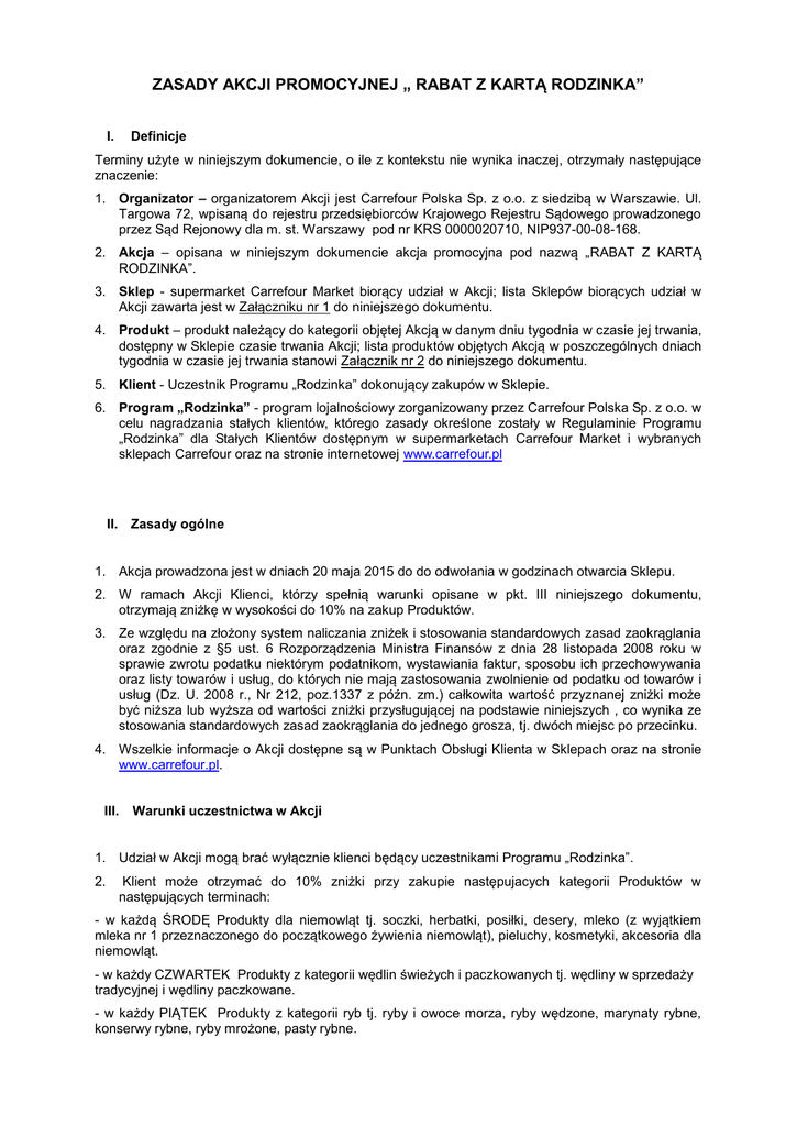 ZASADY AKCJI PROMOCYJNEJ „ RABAT Z KARTĄ RODZINKA” I. Definicje Terminy użyte w niniejszym dokumencie, o ile z kontekstu nie wynika inaczej, otrzymały następujące znaczenie: 1. Organizator – organizatorem Akcji jest Carrefour Polska Sp. z o.o. z siedzibą w Warszawie. Ul. Targowa 72, wpisaną do rejestru przedsiębiorców Krajowego Rejestru Sądowego prowadzonego przez Sąd Rejonowy dla m. st. Warszawy pod nr KRS 0000020710, NIP937-00-08-168. 2. Akcja – opisana w niniejszym dokumencie akcja promocyjna pod nazwą „RABAT Z KARTĄ RODZINKA”. 3. Sklep - supermarket Carrefour Market biorący udział w Akcji; lista Sklepów biorących udział w Akcji zawarta jest w Załączniku nr 1 do niniejszego dokumentu. 4. Produkt – produkt należący do kategorii objętej Akcją w danym dniu tygodnia w czasie jej trwania, dostępny w Sklepie czasie trwania Akcji; lista produktów objętych Akcją w poszczególnych dniach tygodnia w czasie jej trwania stanowi Załącznik nr 2 do niniejszego dokumentu. 5. Klient - Uczestnik Programu „Rodzinka” dokonujący zakupów w Sklepie. 6. Program „Rodzinka” - program lojalnościowy zorganizowany przez Carrefour Polska Sp. z o.o. w celu nagradzania stałych klientów, którego zasady określone zostały w Regulaminie Programu „Rodzinka” dla Stałych Klientów dostępnym w supermarketach Carrefour Market i wybranych sklepach Carrefour oraz na stronie internetowej www.carrefour.pl II. Zasady ogólne 1. Akcja prowadzona jest w dniach 20 maja 2015 do do odwołania w godzinach otwarcia Sklepu. 2. W ramach Akcji Klienci, którzy spełnią warunki opisane w pkt. III niniejszego dokumentu, otrzymają zniżkę w wysokości do 10% na zakup Produktów. 3. Ze względu na złożony system naliczania zniżek i stosowania standardowych zasad zaokrąglania oraz zgodnie z §5 ust. 6 Rozporządzenia Ministra Finansów z dnia 28 listopada 2008 roku w sprawie zwrotu podatku niektórym podatnikom, wystawiania faktur, sposobu ich przechowywania oraz listy towarów i usług, do których nie mają zastosowania zwolnienie od podatku od towarów i usług (Dz. U. 2008 r., Nr 212, poz.1337 z późn. zm.) całkowita wartość przyznanej zniżki może być niższa lub wyższa od wartości zniżki przysługującej na podstawie niniejszych , co wynika ze stosowania standardowych zasad zaokrąglania do jednego grosza, tj. dwóch miejsc po przecinku. 4. Wszelkie informacje o Akcji dostępne są w Punktach Obsługi Klienta w Sklepach oraz na stronie www.carrefour.pl. III. Warunki uczestnictwa w Akcji 1. Udział w Akcji mogą brać wyłącznie klienci będący uczestnikami Programu „Rodzinka”. 2. Klient może otrzymać do 10% zniżki przy zakupie następujacych kategorii Produktów w następujących terminach: - w każdą ŚRODĘ Produkty dla niemowląt tj. soczki, herbatki, posiłki, desery, mleko (z wyjątkiem mleka nr 1 przeznaczonego do początkowego żywienia niemowląt), pieluchy, kosmetyki, akcesoria dla niemowląt. - w każdy CZWARTEK Produkty z kategorii wędlin świeżych i paczkowanych tj. wędliny w sprzedaży tradycyjnej i wędliny paczkowane. - w każdy PIĄTEK Produkty z kategorii ryb tj. ryby i owoce morza, ryby wędzone, marynaty rybne, konserwy rybne, ryby mrożone, pasty rybne. - w każdą SOBOTĘ Produkty z kategorii dla zwierząt tj. karma i akcesoria dla psów i kotów, akcesoria i karma dla zwierząt pozostałych. - w każdy PONIEDZIAŁEK Produkty z kategorii pieczywo i ciastka tj.pieczywo, ciastka świeże, pączki drożdżówki. - w każdy WTOREK Produkty z kategorii wody i napoje bezalkoholowe tj. wody gazowane i niegazowane, wody smakowe, soki, syropy, napoje gazowane i niegazowane, napoje na bazie herbaty, napoje energetyczne. - w każdą NIEDZIELĘ Produkty z kategorii kosmetyków tj. mydła, środki do kąpieli, żele pod przysznic, pasty i szczoteczki do zębów, pielęgnacja włosów, szampony, odżywki, balsamy, lakiery, pianki, żele, farby, pielęgnacja twarzy i ciała, dezodoranty, środki do depilacji, środki do opalania, kosmetyki dla mężczyzn: środki do golenia, środki po goleniu, dezodoranty. Szczegółowa lista Produktów objętych akcją zawarta jest w Załączniku nr 2 do niniejszego dokumentu. 3. Warunkiem uczestnictwa w Akcji i otrzymania zniżki określonej w pkt. II ust. 2 jest spełnienie łącznie poniższych warunków: a) dokonanie w jednym ze Sklepów zakupu Produktu lub Produktów z kategorii objętej Akcją w danym dniu tygodnia w czasie jej trwania, b) okazanie kasjerowi karty lojalnościowej Programu ”Rodzinka” w celu zeskanowania kodu kreskowego karty lojalnościowej. 4. Zniżka udzielana w ramach Akcji sumuje się z innymi zniżkami / promocjami, w szczególności ze zniżką przysługującą Klientom posiadającym Kartę Pracownika lub Kartę Seniora. 5. W przypadku łączenia zniżki przysługującej w ramach Akcji ze zniżką przysługującą na podstawie karty lojalnościowej Programu ”Rodzinka” - Karty Pracownika, zniżki naliczane są w następującej kolejności: 1) Zniżka udzielana w ramach Akcji opisanej w niniejszym dokumencie, 2) zniżka przysługująca z tytułu posiadania Karty Pracownika. 6. W przypadku łączenia zniżki przysługującej w ramach Akcji ze zniżką przysługującą na podstawie karty lojalnościowej Programu ”Rodzinka” - Karty Seniora, zniżki naliczane są w następującej kolejności: 1) Zniżka udzielana w ramach Akcji opisanej w niniejszym dokumencie, 2) Zniżka przysługująca z tytułu posiadania Karty Seniora – w formie e-Kuponu Senior. 3) Zniżka przysługujaca z tytułu realizacji e-Kuponu Senior. IV. Postępowanie reklamacyjne 1. Każdemu Klientowi przysługuje prawo wniesienia pisemnej reklamacji, w zakresie niezgodności sposobu przeprowadzenia Akcji z zasadami opisanymi w niniejszym dokumencie oraz regulaminie Programu „Rodzinka” w czasie trwania Akcji lub nie później niż w terminie do 30 dni od daty jej zakończenia. Reklamacje wniesione po u