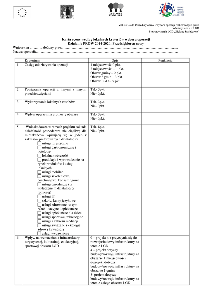 Zał. Nr 3a do Procedury oceny i wyboru operacji realizowanych przez podmioty inne niż LGD Stowarzyszenie LGD „Zielone Sąsiedztwo” Karta oceny według lokalnych kryteriów wyboru operacji Działanie PROW 2014-2020: Przedsiębiorca nowy Wniosek nr ………. złożony przez ……………………………………………..……………………………………... Nazwa operacji:………………………………………………………………………………………………………… Kryterium Zasięg oddziaływania operacji Opis 1 miejscowość-0 pkt. 2 miejscowości – 1 pkt. Obszar gminy – 2 pkt. Obszar 2 gmin – 3 pkt. Obszar LGD – 5 pkt. 2 Powiązania operacji z innymi z innymi przedsięwzięciami Tak- 3pkt. Nie- 0pkt. 3 Wykorzystanie lokalnych zasobów Tak- 3pkt. Nie- 0pkt. 4 Wpływ operacji na promocję obszaru Tak- 3pkt. Nie- 0pkt. 5 Wnioskodawca w ramach projektu zakłada działalność gospodarczą nieuciążliwą dla mieszkańców wpisującą się w jeden z zakresów preferowanych działalności. usługi turystyczne usługi gastronomiczne i hotelowe lokalna twórczość produkcja i wprowadzanie na rynek produktów i usług lokalnych usługi mobilne usługi szkoleniowe, coachingowe, konsultingowe usługi ogrodnicze ( z wyłączeniem działalności rolniczej) usługi IT szkoły, kursy językowe usługi zdrowotne, w tym rehabilitacyjne i opiekuńcze usługi opiekuńcze dla dzieci usługi sportowe, rekreacyjne usługi z zakresu mediacji usługi związane z ekologią, zdrową żywnością usługi wydawnicze Wpływ na wzmacnianie infrastruktury turystycznej, kulturalnej, edukacyjnej, sportowej obszaru LGD Tak- 8pkt. Nie- 0pkt. 1 6 0 – projekt nie przyczynia się do rozwoju/budowy infrastruktury na terenie LGD 4 – projekt dotyczy budowy/rozwoju infrastruktury na obszarze 1 miejscowości 6-projekt dotyczy budowy/rozwoju infrastruktury na obszarze 1 gminy 8- projekt dotyczy budowy/rozwoju infrastruktury na terenie całego obszaru LGD Punktacja 7 Wnioskodawca oświadczył, że opłaca podatki na obszarze objętym LSR Tak- 5pkt. Nie- 0pkt. 8 Wnioskodawca w dniu składania wniosku należy do jednej z poniższych grup: - Osoba w wieku do 35 r.ż. - Osoba w wieku powyżej 50 lat. - Kobieta oraz osoba sprawująca opiekę nad małym dzieckiem (do ukończenia 6 r.z.) - Osoba niepełnosprawna Z biznesplanu projektu wynika konieczność utworzenia nowego miejsca pracy Tak- 10pkt. Nie- 0pkt. (1 0) Wnioskodawca w ramach projektu zakłada działalność gospodarczą opartą na lokalnych produktach rolnych Tak- 3pkt. Nie- 0pkt. 10 Projekt jest innowacyjny tzn. Zakłada wprowadzenie na rynek lokalny produktu/usługi niedostępnej w ciągu ostatnich 12 miesięcy na terenie danej LGD Tak- 8pkt. Nie- 0pkt. 11 Wnioskodawca przedstawił - posiadane doświadczenie w realizacji projektów o podobnym charakterze, - kwalifikacje odpowiednie do przedmiotu operacji, lub - podmiot ubiegający się o dofinansowanie wykonuje działalność odpowiednią do przedmiotu operacji, które to elementy w realny sposób zwiększają szanse utrzymania działalności w wymaganym okresie trwałości projektu. Za każdy element po 2 pkt, max. 6 pkt. Nie- 0pkt. 12 Wnioskodawca szczegółowo opisał wyniki analizy rynku lokalnego, uwzględniając następujące elementy: - rzetelna ocena konkurencji - plany działań promocyjnych -strategia utrzymania firmy w perspektywie 5 lat -strategia utrzymania miejsc pracy -opis docelowej grupy klientów Brak szczegółowego opisu – 0 pkt. Szczegółowy opis z uwzględnieniem 3 elementów pkt5 Szczegółowy opis z uwzględnieniem 5 elementów pkt 10 13 W ramach prowadzonej działalności kultywowane będą tradycje artystyczne lub rzemieślnicze lub kulinarne Tak- 3pkt. Nie- 0pkt. 14 Wnioskodawca wziął udział w szkoleniu/doradztwie przeprowadzonym przez LGD w ramach danego naboru Tak- 4pkt. Nie- 0pkt. 15 Wnioskodawca na etapie doradztwa złożył w Biurze LGD wypełnioną fiszkę projektową Tak- 4pkt. Nie- 0pkt. 16 W ramach projektu przewidziano wykorzystanie spójnej wizualizacji zgodnej z wytycznymi PROW 2014-2020 z wykorzystaniem logo LGD Tak- 5pkt. Nie- 0pkt. 9 - 1 etat 0 pkt - 1,5 etatu 4 pkt - 2 etaty i więcej 8 pkt 17 Powstanie lub modernizacja obiektów infrastruktury kulturalnej, turystycznej lub rekreacyjnej w miejscowościach poniżej 5 tys. mieszkańców. SUMA PUNKTÓW Tak-5 pkt Nie- 0 pkt Kryterium minimalne: 50% 7.Uwagi: ………………………. data ……………………………………..……………. czytelny podpis członka Rady Programowej podpis sekretarza posiedzenia Rady LGD pieczęć LGD