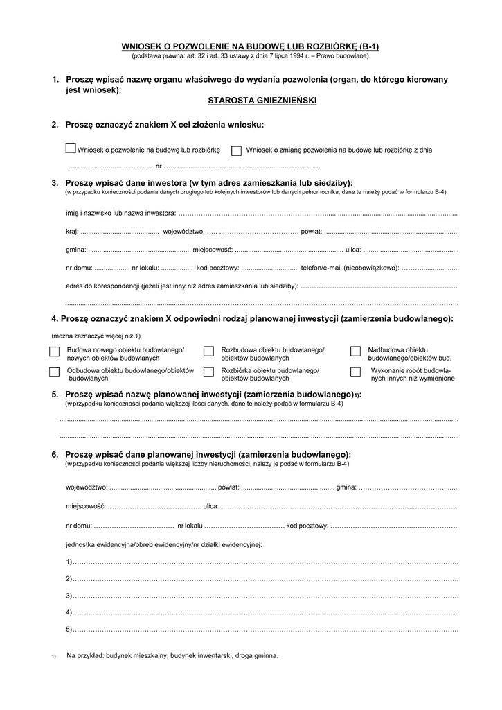 WNIOSEK O POZWOLENIE NA BUDOWĘ LUB ROZBIÓRKĘ (B-1) (podstawa prawna: art. 32 i art. 33 ustawy z dnia 7 lipca 1994 r. – Prawo budowlane) 1. Proszę wpisać nazwę organu właściwego do wydania pozwolenia (organ, do którego kierowany jest wniosek): STAROSTA GNIEŹNIEŃSKI 2. Proszę oznaczyć znakiem X cel złożenia wniosku: Wniosek o pozwolenie na budowę lub rozbiórkę Wniosek o zmianę pozwolenia na budowę lub rozbiórkę z dnia .............................................. nr ……………………………............................................ 3. Proszę wpisać dane inwestora (w tym adres zamieszkania lub siedziby): (w przypadku konieczności podania danych drugiego lub kolejnych inwestorów lub danych pełnomocnika, dane te należy podać w formularzu B-4) imię i nazwisko lub nazwa inwestora: …………………………………………………………...................................................................... kraj: .......................................... województwo: ….. ...…………………………… powiat: ........................................................................ gmina: ....................................................... miejscowość: .......................................................... ulica: ................................................... nr domu: ................... nr lokalu: ................. kod pocztowy: .............................. telefon/e-mail (nieobowiązkowo): ……….................... adres do korespondencji (jeżeli jest inny niż adres zamieszkania lub siedziby): ……………………………………………………………. ................................................................………………………………………………………………………………………………………….. 4. Proszę oznaczyć znakiem X odpowiedni rodzaj planowanej inwestycji (zamierzenia budowlanego): (można zaznaczyć więcej niż 1) Budowa nowego obiektu budowlanego/ nowych obiektów budowlanych Rozbudowa obiektu budowlanego/ obiektów budowlanych Odbudowa obiektu budowlanego/obiektów budowlanych Rozbiórka obiektu budowlanego/ obiektów budowlanych Nadbudowa obiektu budowlanego/obiektów bud. Wykonanie robót budowlanych innych niż wymienione 5. Proszę wpisać nazwę planowanej inwestycji (zamierzenia budowlanego)1): (w przypadku konieczności podania większej ilości danych, dane te należy podać w formularzu B-4) ..................................................................................................................................................................................................................... ..................................................................................................................................................................................................................... 6. Proszę wpisać dane planowanej inwestycji (zamierzenia budowlanego): (w przypadku konieczności podania większej liczby nieruchomości, należy je podać w formularzu B-4) województwo: ......................................................... powiat: .................................................. gmina: …………………………………....... miejscowość: …………………………………… ulica: …………………………………………………………………………...……………….. nr domu: ……………………………… nr lokalu ……………………………… kod pocztowy: ……………………………….…….………….. jednostka ewidencyjna/obręb ewidencyjny/nr działki ewidencyjnej: 1) ………………………………………………………………………………………………………………………………………………………. 2) ………………………………………………………………………………………………………………………………………………………. 3) ………………………………………………………………………………………………………………………………………………………. 4) ………………………………………………………………………………………………………………………………………………………. 5) ………………………………………………………………………………………………………………………………………………………. 1) Na przykład: budynek mieszkalny, budynek inwentarski, droga gminna. 7. Proszę wskazać załączniki do wniosku: (w przypadku konieczności wskazania większej liczby załączników, dane te należy podać w formularzu B-4) 8. 1) ......................................................................................................................................................................................................... 2) …………………………………………………………………………………………………………………………………………………... 3) …………………………………………………………………………………………………………………………………………………... 4) …………………………………………………………………………………………………………………………………………………... 5) …………………………………………………………………………………………………………………………………………………... Proszę oznaczyć znakiem X w przypadku dołączania formularza B-4 Dołączam formularz B-4 ................................................................................................................ Data oraz czytelny podpis inwestora lub osoby upoważnionej do działania w jego imieniu (w przypadku skła