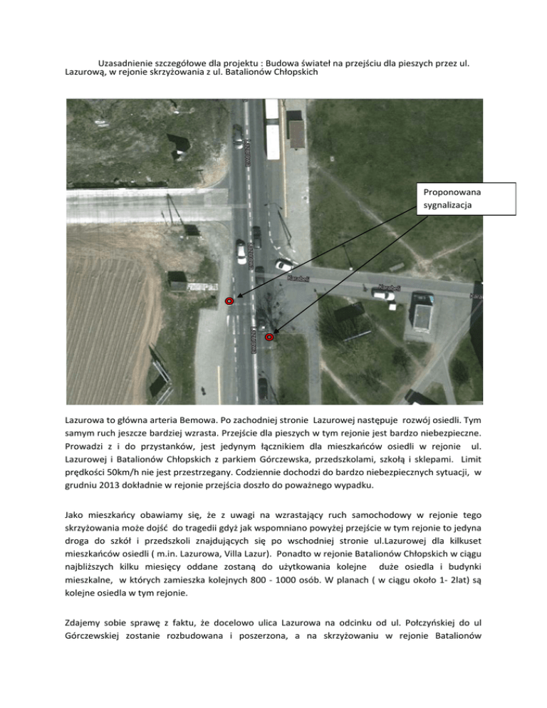 Uzasadnienie szczegółowe dla projektu : Budowa świateł na przejściu dla pieszych przez ul. Lazurową, w rejonie skrzyżowania z ul. Batalionów Chłopskich Proponowana sygnalizacja Lazurowa to główna arteria Bemowa. Po zachodniej stronie Lazurowej następuje rozwój osiedli. Tym samym ruch jeszcze bardziej wzrasta. Przejście dla pieszych w tym rejonie jest bardzo niebezpieczne. Prowadzi z i do przystanków, jest jedynym łącznikiem dla mieszkańców osiedli w rejonie ul. Lazurowej i Batalionów Chłopskich z parkiem Górczewska, przedszkolami, szkołą i sklepami. Limit prędkości 50km/h nie jest przestrzegany. Codziennie dochodzi do bardzo niebezpiecznych sytuacji, w grudniu 2013 dokładnie w rejonie przejścia doszło do poważnego wypadku. Jako mieszkańcy obawiamy się, że z uwagi na wzrastający ruch samochodowy w rejonie tego skrzyżowania może dojść do tragedii gdyż jak wspomniano powyżej przejście w tym rejonie to jedyna droga do szkół i przedszkoli znajdujących się po wschodniej stronie ul.Lazurowej dla kilkuset mieszkańców osiedli ( m.in. Lazurowa, Villa Lazur). Ponadto w rejonie Batalionów Chłopskich w ciągu najbliższych kilku miesięcy oddane zostaną do użytkowania kolejne duże osiedla i budynki mieszkalne, w których zamieszka kolejnych 800 - 1000 osób. W planach ( w ciągu około 1- 2lat) są kolejne osiedla w tym rejonie. Zdajemy sobie sprawę z faktu, że docelowo ulica Lazurowa na odcinku od ul. Połczyńskiej do ul Górczewskiej zostanie rozbudowana i poszerzona, a na skrzyżowaniu w rejonie Batalionów Chłopskich i Karabeli oraz przejściu najprawdopodobniej docelowo zostaną zainstalowane światła. Tak wynika ze wstępnej koncepcji przebudowy ulicy Lazurowej. Należy jednak podkreślić że etap ten zostanie zrealizowany najwcześniej po roku 2042! Do tego czasu na przejściu dla pieszych i skrzyżowaniu może dojść do kilku wypadków, w których życie mogą stracić także dzieci. Dramatyzm sytuacji podkreśla także fakt, że w roku 2015 ma nastąpić otwarcie odcinka przedłużenia ul Lazurowej w postaci ul. Nowo- Lazurowej od ul Chrościckiego do ul. Połczyńskiej. Tym samym cały ruch samochodowy z Ursusa i Włoch z ulicy Nowo – Lazurowej zostanie nakierowany w ulicę Lazurową jeszcze bardziej przyczyniając się do wzrostu ruchu i zwiększenia ryzyka potencjalnych wypadków. Z tego powodu wydaje nam się, że poprawa bezpieczeństwa w tym rejonie powinna należeć do priorytetów dzielnicy. Ponadto jako dodatkowy efekt zamontowania świateł na ulicy Lazurowej znacząco poprawi się możliwość i bezpieczeństwo wjazdu i wyjazdu w ulice Batalionów Chłopskich oraz Karabeli. Naszym zdaniem instalacja świateł na przejściu nawet jako rozwiązanie tymczasowe lub na kilka lat może przyczynić się do zapobiegnięcia kilku tragicznym wypadkom. Ponadto nic nie stoi na przeszkodzi, aby podczas przebudowy ul. Lazurowej wykorzystać część istniejącej infrastruktury, w tym planowane światła. W wieloletniej prognozie finansowej miasta na lata 2015 – 2042 brak środków na kontynuację przebudowy ul. Lazurowej w przedmiotowym rejonie zarezerwowano jedynie środki na prace projektowe/przygotowawcze. Potwierdzają to nie tylko dokumenty opublikowane na http://bip.warszawa.pl/Menu_przedmiotowe/budzet_polityka_finansowa/default.htm liczne doniesienia prasowe: stronie ale także Publikacja prasowa z 16 sierpnia 2013 http://m.warszawa.gazeta.pl/warszawa/1,106541,14446263,Nowa_trasa_z_dziura_w_srodku__Zabr aknie_300_metrow.html : „….Nowolazurowa - Połczyńska - Szeligowska - Lazurowa. - Ten następny odcinek Nowolazurowej będzie wykonany w oddzielnym etapie, na który nie mamy zapewnionych pieniędzy w wieloletniej prognozie finansowej miasta - mówi Małgorzata Gajewska.” Publikacja prasowa 12 10 2014 http://warszawa.gazeta.pl/warszawa/1,34862,16774605,Wydluzaja_Nowolazurowa__Skonczy_sie_u dreka_kierowcow_.html : „….. Zarząd Miejskich Inwestycji Drogowych ma projekt budowlany tego fragmentu. Zakłada on budowę krótkiego łącznika Połczyńskiej z Lazurową i poszerzenie tej ostatniej ulicy. Na razie trwa wykup gruntów. Nie wiadomo, kiedy władze Warszawy znajdą pieniądze na budowę.” Zgodnie z informacjami zawartymi w projekcie budżetu na rok 2015. Brak jest środków na kontynuacje przebudowy ulicy Lazurowej w omawianym rejonie: Budowa ul. Nowolazurowej na odc. od Al. Jerozolimskich do Trasy AK, w tym: zadanie a. Zarząd 2005 odcinek od Miejskich Al. Inwestycji Jerozolimskic Drogowych h do ul. ks. Juliana Chrościckieg o zadanie b. Zarząd 2011 odcinek od Miejskich ul. ks. Juliana Inwestycji Chrościckieg Drogowych o do ul. Połczyńskiej zadanie c. Zarząd 2011 odcinek od Miejskich ul. Inwestycji Połczyńskiej Drogowych do węzła S8 prace przygotowaw cze w zakresie pozyskiwania nieruchomoś ci zadanie d. Zarząd 2015 odcinek od Miejskich ul. Inwestycji Połczyńskiej Drogowych do ul. Sterniczej 129 327 372 2015 5 251 901 2015 94 170 539 2015 19 904 932 2015 10 000 000 Analogiczne informacje prezentuje Wieloletnia Prognoza Finansowa Miasta Stołecznego Warszawy Na Lata 2015-2042 : Str 96 : Budowa ul. Nowolazurowej na odcinku od Al. Jerozolimskich do Trasy AK - Zadanie A od Al. Jerozolimskich do ul. Ks. Juliana Chrościckiego W roku 2015 przewidziano: Budowa ul. Nowolazurowej na odc. od Al. Jerozolimskich do Trasy AK, w tym: zadanie b. odcinek od ul. ks. Juliana Chrościckiego do ul. Połczyńskiej zadanie c. odcinek od ul. Połczyńskiej do węzła S8 - prace przygotowawcze w zakresie pozyskiwania nieruchomości W dokumencie tym po roku 2015 nie wskazano środków na kolejne etapy. Przy weryfikacji formalnej analogicznej propozycji projektu w 2014 roku Zarząd Dróg Miejskich przekazał, że projekt budowy ul. Nowolazurowej uwzględnia urządzenie sygnalizacji świetlnej przy przejściach dla pieszych w rejonie przystanków autobusowych przy ul. Batalionów Chłopskich. Jest to bardzo dobra wiadomość 