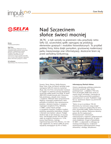 Case Study Nad Szczecinem słońce świeci mocniej Branża Produkcja przemysłowa Opis firmy Selfa Grzejnictwo Elektryczne S.A to największy polski producent elementów grzejnych. Ustabilizowana pozycja (tradycja Selfy sięga 1932 roku), wieloletnie doświadczenie oraz sukcesywnie rosnąca sprzedaż pozwoliły nam na miano lidera dostawcy najwyższej jakości elementów grzejnych w Polsce. 38,7% - o tyle wzrosły na przestrzeni roku przychody netto Selfy GE, szczecińskiej spółki zajmującej się produkcją elementów grzejnych i modułów fotowoltaicznych. To przykład polskiej firmy, która dzięki pomysłom, gruntownej modernizacji parku maszynowego oraz informatyzacji, skutecznie broni się przed zachodnią konkurencją. Cel wdrożenia Optymalizacja sfery kosztowej produkcji Szwecja, Dania, Niemcy, Wielka Brytania, Rosja, Litwa. Kraje, do których sprzedaje swoje rozwiązania Selfa GE można by wymieniać długo. Gdy inne firmy wstrzymywały inwestycje ze względu na niepewną sytuację gospodarczą, szczecińska spółka poszła inną drogą. W latach 2005-2010 zmodernizowała park maszynowy, halę produkcyjną, zakupiła nowe maszyny i urządzenia. Wdrożyła także oprogramowanie. Najpierw wspierające projektowanie, które pozwoliło na skrócenie czasu opracowywania produktu i obniżenie kosztów, a następnie wspierające zarządzanie firmą. Wdrożony w 2008 r. system Impuls pomógł w zarządzaniu finansami, środkami trwałymi, produkcją, gospodarką materiałową, relacjami z klientami oraz kadrami i płacami. Podjęte działania były na tyle skuteczne, że trzy lata temu, zatrudniającej ponad 150 osób Selfie udało się zwiększyć przychody aż o 131%. Jurorzy Gazel Biznesu, rankingu organizowanego przez Pulsu Biznesu, nie mieli więc wątpliwości, by zaliczyć spółkę do grona najszybciej rozwijających się firm w Polsce. Informatyczny Sherlock Holmes Historia największego polskiego producenta elementów grzejnych sięga czasów przedwojennych - a dokładnie 1932 roku. Firma od początku kładła duży nacisk na rozwój nowych technologii i zaznaczyła się w historii kilkoma pionierskimi produktami wprowadzonymi na rynek. Przykładem mogą być np. ogrzewacze olejowe czy promienniki podczerwieni. "Słońce nie po to przebywa 150 mln kilometrów, by marnować swoją energię" czytamy w broszurze wydanej kilka lat temu przez szczecińską spółkę. Dobrze tłumaczy to czym Selfa się zajmuje. Elektryczne elementy grzejne dla firm spożywczych, farmaceutycznych i chemicznych, wykorzystywane w bojlerach, podgrzewaczach wody, kuchenkach elektrycznych, to jedna strona działalności. Druga to fotowoltaika. W 2004 r. w odpowiedzi na zbliżającą się rewolucję technologiczną i zwiększone zainteresowanie wykorzystywaniem energii odnawialnej i ekologią, zdecydowano Case Study Selfa GE SA Branża Produkcja przemysłowa Oprogramowanie ERP o uruchomieniu produkcji modułów fotowoltaicznych. W 2012. r. wystartował Zakład Produkcji Modułów Fotowoltaicznych, a wyniki firmy poszybowały w górę. Menedżerowie firmy nie ukrywają, że sukces to nie tylko efekt wieloletnich doświadczeń, innowacji, ale także informatyzacji. Najlepszym przykładem może być właśnie fotowoltaika. Materiały do produkcji modułów fotowoltaicznych, muszą być dostarczane Just in Time. - Część materiałów posiada także krótki termin przydatności do użycia, magazynowanie mija się więc z celem. Dzięki systemowi IT, mamy stałą kontrolę nad kosztami. Nie monitorujemy ich ręcznie, nie wprowadzany cen materiałów. Wszystko wyliczane jest automatycznie opowiada Michał Redliński, Dyrektor Techniczno-Produkcyjny Zakładu Fotowoltaiki, Selfa GE S.A. Wdrożony w 2008 r. system Impuls wspiera zarządzanie produkcją od strony zleceń produkcyjnych, technologii, rozliczania kosztów, planowania zakupów materiałów. Dba też o przejrzystość procesu produkcji. To bardzo ważne, bo moduł fotowoltaiczny z uwagi na swoje zastosowanie jest objęty długoterminową, 25-letnią gwarancją. W razie awarii, firma musi wiedzieć kiedy, przez kogo i z jakich materiałów został on wyprodukowany. System ERP to ułatwia. Dzięki niemu pracownicy mają pełną informację na temat wyrobów, które zostały wysłane do klienta. - Już na etapie wysyłki numer seryjny produktu powiązany jest z zamówieniem. W przypadku reklamacji możemy więc nie tylko prześledzić całą ścieżkę produkcji. Wiemy też co należy zmienić, by uniknąć danej reklamacji w przyszłości. Pomaga w tym moduł systemu Impuls, który wykorzystujemy do analizy miejsc zagrożonych powstawaniem braków -- wyjaśnia Michał Redliński. Sztuka planowania i logistyki Od lat rdzeniem działalności Selfa GE jest produkcja elementów grzejnych. W odróżnieniu od zakładu fotowoltaiki, w którym realizuje się niemal wyłącznie zamówienia długoseryjne, w zakładzie produkcji elementów grzejnych realizuje się także zamówienia krótkoseryjne. Tutaj także nad całością procesu - od momentu wpłynięcia zamówienia aż po ostateczne wystawienie faktury i wydanie towaru - czuwa system informatyczny. - Jedną z ważniejszych zalet systemu Impuls jest techniczne przygotowanie produkcji. W systemie mamy wpisane technologie każdego elementu grzejnego, dzięki temu w każdej chwili dysponujemy informacjami na temat zapotrzebowania materiałowego, technicznego czy organizacyjnego. Gdy zamówienie trafia na produkcję, wiemy jaka będzie potrzeba materiałowa, jaki jest termin dostawy materiału czy półwyrobu. Dzięki temu bez problemu możemy w terminie zrealizować zamówienie. opowiada Dariusz Pilawski, Kierownik Produkcji Elementów Grzejnych, Selfa GE S.A. System IT wspiera Selfę także w obszarze logistyki. Różnorodność oferty wymusza konieczność przygotowywania mnóstwa pomniejszych komponentów potrzebnych do produkcji elementów grzejnych. Dużą rolę odgrywa tutaj wewnętrzny park maszynowy 