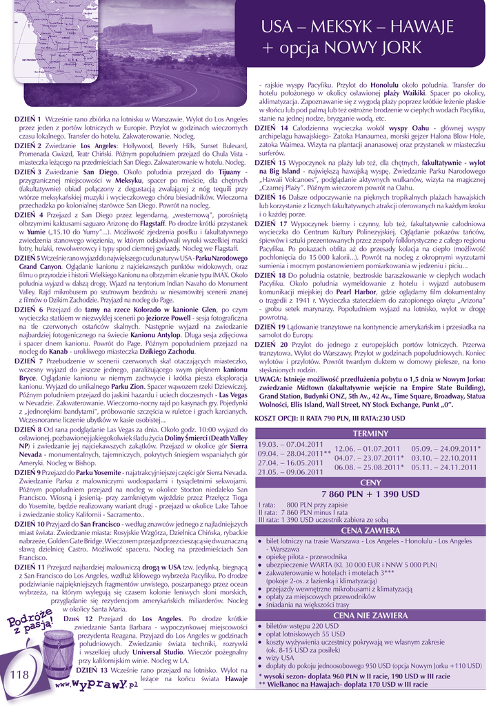 USA – Meksyk – Hawaje + opcja Nowy Jork - rajskie wyspy Pacyfiku. Przylot do Honolulu około południa. Transfer do hotelu położonego w okolicy osławionej plaży Waikiki. Spacer po okolicy, aklimatyzacja. Zapoznawanie się z wygodą plaży poprzez krótkie leżenie płaskie w słońcu lub pod palmą lub też ostrożne brodzenie w ciepłych wodach Pacyfiku, stanie na jednej nodze, bryzganie wodą, etc. Dzień 14 Całodzienna wycieczka wokół wyspy Oahu - głównej wyspy archipelagu hawajskiego- Zatoka Hanaumea, morski gejzer Halona Blow Hole, zatoka Waimea. Wizyta na plantacji ananasowej oraz przystanek w miasteczku surferów. Dzień 15 Wypoczynek na plaży lub też, dla chętnych, fakultatywnie - wylot na Big Island - największą hawajską wyspę. Zwiedzanie Parku Narodowego „Hawaii Volcanoes”, podglądanie aktywnych wulkanów, wizyta na magicznej „Czarnej Plaży”. Późnym wieczorem powrót na Oahu. Dzień 16 Dalsze odpoczywanie na pięknych tropikalnych plażach hawajskich lub korzystanie z licznych fakultatywnych atrakcji oferowanych na każdym kroku i o każdej porze. Dzień 17 Wypoczynek bierny i czynny, lub też, fakultatywnie całodniowa wycieczka do Centrum Kultury Polinezyjskiej. Oglądanie pokazów tańców, śpiewów i sztuki prezentowanych przez zespoły folklorystyczne z całego regionu Pacyfiku. Po pokazach obfita aż do przesady kolacja na ciepło (możliwość pochłonięcia do 15 000 kalorii...). Powrót na nocleg z okropnymi wyrzutami sumienia i mocnym postanowieniem pomiarkowania w jedzeniu i piciu... Dzień 18 Do południa ostatnie, beztroskie baraszkowanie w ciepłych wodach Pacyfiku. Około południa wymeldowanie z hotelu i wyjazd autobusem komunikacji miejskiej do Pearl Harbor, gdzie oglądamy film dokumentalny o tragedii z 1941 r. Wycieczka stateczkiem do zatopionego okrętu „Arizona” - grobu setek marynarzy. Popołudniem wyjazd na lotnisko, wylot w drogę powrotną. Dzień 19 Lądowanie tranzytowe na kontynencie amerykańskim i przesiadka na samolot do Europy. Dzień 20 Przylot do jednego z europejskich portów lotniczych. Przerwa tranzytowa. Wylot do Warszawy. Przylot w godzinach popołudniowych. Koniec wylotów i przylotów. Powrót twardym duktem w domowy pielesze, na łono stęsknionych rodzin. UWAGA: Istnieje możliwość przedłużenia pobytu o 1,5 dnia w Nowym Jorku: zwiedzanie Midtown (fakultatywnie wejście na Empire State Building), Grand Station, Budynki ONZ, 5th Av., 42 Av., Time Square, Broadway, Statua Wolności, Ellis Island, Wall Street, NY Stock Exchange, Punkt „0”. Dzień 1 Wcześnie rano zbiórka na lotnisku w Warszawie. Wylot do Los Angeles przez jeden z portów lotniczych w Europie. Przylot w godzinach wieczornych czasu lokalnego. Transfer do hotelu. Zakwaterowanie. Nocleg. Dzień 2 Zwiedzanie Los Angeles: Hollywood, Beverly Hills, Sunset Bulevard, Promenada Gwiazd, Teatr Chiński. Późnym popołudniem przejazd do Chula Vista miasteczka leżącego na przedmieściach San Diego. Zakwaterowanie w hotelu. Nocleg. Dzień 3 Zwiedzanie San Diego. Około południa przejazd do Tijuany przygranicznej miejscowości w Meksyku, spacer po mieście, dla chętnych (fakultatywnie) obiad połączony z degustacją zwalającej z nóg tequili przy wtórze meksykańskiej muzyki i wycieczkowego chóru biesiadników. Wieczorna przechadzka po kolonialnej starówce San Diego. Powrót na nocleg. Dzień 4 Przejazd z San Diego przez legendarną, „westernową”, porośniętą olbrzymimi kaktusami saguaro Arizonę do Flagstaff. Po drodze krótki przystanek w Yumie („15.10 do Yumy”...). Możliwość zjedzenia posiłku i fakultatywnego zwiedzenia stanowego więzienia, w którym odsiadywali wyroki wszelkiej maści łotry, hulaki, rewolwerowcy i typy spod ciemnej gwiazdy. Nocleg we Flagstaff. Dzień 5 Wcześnie rano wyjazd do największego cudu natury w USA - Parku Narodowego Grand Canyon. Oglądanie kanionu z najciekawszych punktów widokowych, oraz filmu o przyrodzie i historii Wielkiego Kanionu na olbrzymim ekranie typu IMAX. Około południa wyjazd w dalszą drogę. Wjazd na terytorium Indian Navaho do Monument Valley. Rajd mikrobusem po szutrowym bezdrożu w niesamowitej scenerii znanej z filmów o Dzikim Zachodzie. Przyjazd na nocleg do Page. Dzień 6 Przejazd do tamy na rzece Kolorado w kanionie Glen, po czym wycieczka statkiem w niezwykłej scenerii po jeziorze Powell - sesja fotograficzna na tle czerwonych ostańców skalnych. Następnie wyjazd na zwiedzanie najbardziej fotogenicznego na świecie Kanionu Antylop. Długa sesja zdjęciowa i spacer dnem kanionu. Powrót do Page. Późnym popołudniem przejazd na nocleg do Kanab - urokliwego miasteczka Dzikiego Zachodu. Dzień 7 Przebudzenie w scenerii czerwonych skał otaczających miasteczko, wczesny wyjazd do jeszcze jednego, paraliżującego swym pięknem kanionu Bryce. Oglądanie kanionu w niemym zachwycie i krótka piesza eksploracja kanionu. Wyjazd do unikalnego Parku Zion. Spacer wąwozem rzeki Dziewiczej. Późnym południem przejazd do jaskini hazardu i uciech doczesnych - Las Vegas w Nevadzie. Zakwaterowanie. Wieczorno-nocny rajd po kasynach gry. Pojedynki z „jednorękimi bandytami”, próbowanie szczęścia w ruletce i grach karcianych. KOSZT OPCJI: II RATA 790 PLN, III RATA:230 USD Wczesnoranne liczenie ubytków w kasie osobistej... Dzień 8 Od rana podglądanie Las Vegas za dnia. Około godz. 10:00 wyjazd do TERMINY osławionej, pozbawionej jakiegokolwiek śladu życia Doliny Śmierci (Death Valley NP) i zwiedzanie jej najciekawszych zakątków. Przejazd w okolice gór Sierra 19.03. – 07.04.2011 12.06. – 01.07.2011 05.09. – 24.09.2011* Nevada - monumentalnych, tajemniczych, pokrytych śniegiem wspaniałych gór 09.04. – 28.04.2011** 04.07. – 23.07.2011* 03.10. – 22.10.2011 27.04. – 16.05.2011 Ameryki. Nocleg w Bishop. 06.08. – 25.08.2011* 05.11. – 24.11.2011 Dzień 9 Przejazd do Parku Yosemite - najatrakcyjniejszej części gór Sierra Nevada. 21.05. – 
