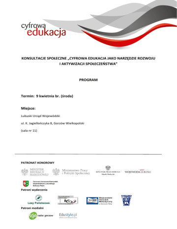 KONSULTACJE SPOŁECZNE „CYFROWA EDUKACJA JAKO NARZĘDZIE ROZWOJU I AKTYWIZACJI SPOŁECZEŃSTWA” PROGRAM Termin: 9 kwietnia br. (środa) Miejsce: Lubuski Urząd Wojewódzki ul. K. Jagiellończyka 8, Gorzów Wielkopolski (sala nr 11) PATRONAT HONOROWY Patroni wydarzenia Patroni medialni 9.30 – Rejestracja uczestników 10.00 – 10.05 - Powitanie /Przedstawiciel samorządu lokalnego/ 10.05 – 10.25 Czy Polskę stać na pasywne społeczeństwo? /Agata Tyszkiewicz, Fundacja Innowacyjna Edukacja/ Prezentacja korzyści państwa związanych z inwestycją w edukację z wykorzystaniem synergii działań resortów (kompetencje i finansowanie), prezentacja korelacji inwestycji ze spadkiem bezrobocia (ze szczególnym uwzględnieniem osób młodych do 21 roku życia) oraz kosztów zasiłków i programów wspomagających aktywizację zawodową (w tym porównanie z PKB) 10.25 – 11.25 Nowoczesna edukacja jako kompleksowe rozwiązania systemowe /Witold Kołodziejczyk, Collegium Futurum/ Edukacja jako priorytet w budowaniu kapitału społecznego Od edukacji ujednoliconej do edukacji zindywidualizowanej. Wyzwanie 1. Edukacja w systemie klasowo – lekcyjnym i edukacja hybrydowa (łączenie PATRONAT HONOROWY Patroni wydarzenia Patroni medialni tradycyjnych zajęć z zajęciami w przestrzeni wirtualnej, transmisje online, itp.) Wyzwanie 2. Model klasycznej dydaktyki i edutainment oraz dydaktyka wykorzystująca zasoby sieci / treści dydaktyczne dostępne dzięki nowym technologiom Wyzwanie 3. Model szkoły „pasywnej” (przekazującej wiedzę) a model szkoły „aktywnej” (szkoła jako miejsce poszukiwania i przetwarzania wiedzy oraz indywidualnych umiejętności związanych z efektywnym funkcjonowaniem w społeczności i przyszłym życiu zawodowym) ● Metodologia łączenia umiejętności i potrzeb – metody dydaktyczne w dobie nowoczesnych technologii oraz współczesnych potrzeb rynkowych Od kształcenia w systemie przedmiotowym do kształcenia kompetencji Wyzwanie 1. Konieczność inwestowania w nauczycieli w kontekście ich współczesnej roli i funkcji dydaktycznej jako wyniku zmieniającego się otoczenia (rynek i środowisko społeczne) Wyzwanie 2. Pozycja funkcjonalna nauczyciela w lokalnej społeczności- jako edukator, mentor, asystent społeczny PATRONAT HONOROWY Patroni wydarzenia Patroni medialni ● Szkoła jako centrum i akcelerator rozwoju lokalnej społeczności Od edukacji zamkniętej w cyklach kształcenia do edukacji przez całe życie Wyzwanie 1. Od edukacji ograniczonej do programu szkolnego do edukacji ciągłej (life-long learning oraz life-wide learning) Wyzwanie 2. Specjalne potrzeby edukacyjne / aktywizacja w kontekście umiejętności budowania swojego otoczenia i środowiska życia. Studia przypadków: ● Wsparcie podstawy programowej w edukacji obowiązkowej poprzez kształcenie umiejętności – innowacyjności, kreatywności i współpracy (SZKOCJA – program rządowy) ● Stworzenie modelu współpracy oraz wzmacnianie partycypacji w życiu społecznym, poczucia tożsamości i potencjału lokalnego (WIELKA BRYTANIA - ESSA Academy) ● Budowanie potencjału regionu w oparciu o edukację na poziomie podstawowym (MAINE, USA) PATRONAT HONOROWY Patroni wydarzenia Patroni medialni ● Wsparcie kształcenia dzieci ze specjalnymi potrzebami edukacyjnymi – wyrównywanie szans oraz wspieranie uzdolnionych dzieci (NOWY TOMYŚL, PODIEBRADY) 11.25-11.40 Przerwa 11.40-12.00 Ankieta dla wszystkich uczestników konsultacji społecznych w regionie 12.00-13.00 Dyskusja w grupach tematycznych 1. Rola i funkcja nauczyciela w budowaniu kapitału społecznego - szkoła jako akcelerator rozwoju społeczności lokalnych 2. Dydaktyka w dobie nowoczesnych technologii oraz współczesnych potrzeb rynkowych, rola technologii we wsparciu nowoczesnej edukacji 3. Współpraca administracji publicznej (instytucje administracji rządowej i jst) w kontekście wykorzystania synergii kompetencji oraz możliwości finansowania w budowaniu nowoczesnej edukacji jako podstawy kapitału społecznego 13.00-13.05 Zakończenie i podziękowanie PATRONAT HONOROWY Patroni wydarzenia Patroni medialni PRELEGENCI WITOLD KOŁODZIEJCZYK COLLEGIUM FUTURUM Redaktor naczelny miesięcznika „Edukacja i Dialog” Twórca Laboratorium Edukacji Medialnej w CODN (platforma z wideowykładami dla nauczycieli). Współpracownik WSiP i Wydawnictw Szkolnych PWN w wielu projektach związanych ze szkoleniem nauczycieli. Stworzył i wdraża nowatorski projekt Collegium Futurum - gimnazjum i liceum w Słupsku wykorzystujący nowe modele dydaktyczne oparte na technologii informacyjno - komunikacyjnej. Przygotował na zlecenie Instytutu Obywatelskiego raport "Jak będzie zmieniać się edukacja? Wyzwania dla polskiej szkoły i ucznia." Apple Education Mentor. Autor (miedzy innymi) książki "Gra o szkołę. W poszukiwaniu zasad zarządzania w nowych czasach" i poradnika dla uczniów "Jak skutecznie zarządzać swoim czasem". Współautor książki "Rodzice w szkole". Prowadzi blog ekspercki: edukacjaprzyszlosci.blogspot.com AGATA TYSZKIEWICZ FUNDACJA INNOWACYJNA EDUKACJA Ponad 20 lat aktywnej pracy i zaangażowania w Polsce i za granicą jako konsultant międzynarodowych programów. Członek wielu organizacji pozarządowych i partner wspierający realizację programów społecznych (Polskie Stowarzyszenie Fundraisingu, Stowarzyszenie Pro Re, Fundacja „Hospicjum to też Życie”, SOS Wioski Dziecięce, Komitet Ochrony Praw Dziecka i wiele innych). W latach 2008-2010 – Doradca Rzecznika Praw Obywatelskich ds. Programów Społecznych, PATRONAT HONOROWY Patroni wydarzenia Patroni medialni współpracująca z organizacjami pozarządowymi na terenie całej Polski. Inicjator i pomysłodawca wielu kampanii społecznych m.in. „Taksówka z fotelikiem”, „Bezpieczne place zabaw”. Członek jury polskich i międzynarodowych konkursów związanych z programami społecznymi i pomocą innym, m.in. „Człowiek bez Barier” (St