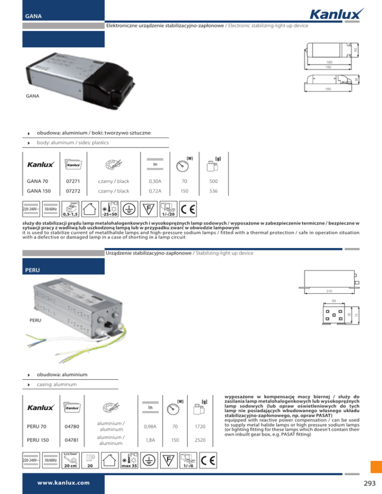 GANA 90 Elektroniczne urządzenie stabilizacyjno-zapłonowe / Electronic stabilizing-light up device 38 180 190 190 GANA obudowa: aluminium / boki: tworzywo sztuczne body: aluminum / sides: plastics GANA 70 07271 czarny / black 0,30A 70 500 GANA 150 07272 czarny / black 0,72A 150 536 220-240V~ 50/60Hz 0,5-1,5 -25÷50 1/-/20 służy do stabilizacji prądu lamp metalohalogenkowych i wysokoprężnych lamp sodowych / wyposażone w zabezpieczenie termiczne / bezpieczne w sytuacji pracy z wadliwą lub uszkodzoną lampą lub w przypadku zwarć w obwodzie lampowym it is used to stabilize current of metallhalide lamps and high-pressure sodium lamps / fitted with a thermal protection / safe in operation situation with a defective or damaged lamp in a case of shorting in a lamp circuit Urządzenie stabilizacyjno-zapłonowe / Stabilizing-light up device PERU 210 70 75 90 PERU obudowa: aluminium casing: aluminum PERU 70 04780 aluminium / aluminum 0,98A 70 1720 PERU 150 04781 aluminium / aluminum 1,8A 150 2520 wyposażone w kompensację mocy biernej / służy do zasilania lamp metalohalogenkowych lub wysokoprężnych lamp sodowych (lub opraw oświetleniowych do tych lamp nie posiadających wbudowanego własnego układu stabilizacyjno-zapłonowego, np. opraw PASAT) equipped with reactive power compensation / can be used to supply metal halide lamps or high pressure sodium lamps (or lighting fitting for these lamps which doesn’t contain their own inbuilt gear box, e.g. PASAT fitting) 6 x 0,75mm2 220-240V~ 50/60Hz 20 cm 20 www.kanlux.com max 35 1/-/6 293