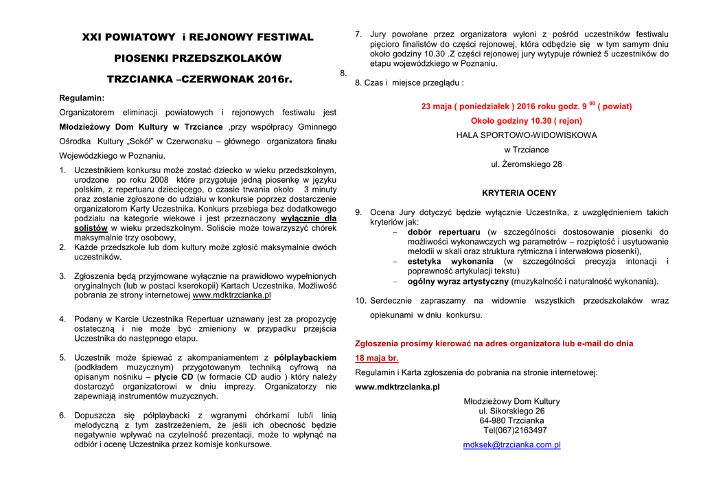 XXI POWIATOWY i REJONOWY FESTIWAL 7. Jury powołane przez organizatora wyłoni z pośród uczestników festiwalu pięcioro finalistów do części rejonowej, która odbędzie się w tym samym dniu około godziny 10.30 .Z części rejonowej jury wytypuje również 5 uczestników do etapu wojewódzkiego w Poznaniu. PIOSENKI PRZEDSZKOLAKÓW 8. TRZCIANKA –CZERWONAK 2016r. 8. Czas i miejsce przeglądu : Regulamin: Organizatorem eliminacji powiatowych i rejonowych festiwalu 23 maja ( poniedziałek ) 2016 roku godz. 9 jest HALA SPORTOWO-WIDOWISKOWA Ośrodka Kultury „Sokół” w Czerwonaku – głównego organizatora finału w Trzciance Wojewódzkiego w Poznaniu. 3. Zgłoszenia będą przyjmowane wyłącznie na prawidłowo wypełnionych oryginalnych (lub w postaci kserokopii) Kartach Uczestnika. Możliwość pobrania ze strony internetowej www.mdktrzcianka.pl 4. Podany w Karcie Uczestnika Repertuar uznawany jest za propozycję ostateczną i nie może być zmieniony w przypadku przejścia Uczestnika do następnego etapu. 5. Uczestnik może śpiewać z akompaniamentem z półplaybackiem (podkładem muzycznym) przygotowanym techniką cyfrową na opisanym nośniku – płycie CD (w formacie CD audio ) który należy dostarczyć organizatorowi w dniu imprezy. Organizatorzy nie zapewniają instrumentów muzycznych. 6. Dopuszcza się półplaybacki z wgranymi chórkami lub/i linią melodyczną z tym zastrzeżeniem, że jeśli ich obecność będzie negatywnie wpływać na czytelność prezentacji, może to wpłynąć na odbiór i ocenę Uczestnika przez komisje konkursowe. ( powiat) Około godziny 10.30 ( rejon) Młodzieżowy Dom Kultury w Trzciance ,przy współpracy Gminnego 1. Uczestnikiem konkursu może zostać dziecko w wieku przedszkolnym, urodzone po roku 2008 które przygotuje jedną piosenkę w języku polskim, z repertuaru dziecięcego, o czasie trwania około 3 minuty oraz zostanie zgłoszone do udziału w konkursie poprzez dostarczenie organizatorom Karty Uczestnika. Konkurs przebiega bez dodatkowego podziału na kategorie wiekowe i jest przeznaczony wyłącznie dla solistów w wieku przedszkolnym. Soliście może towarzyszyć chórek maksymalnie trzy osobowy, 2. Każde przedszkole lub dom kultury może zgłosić maksymalnie dwóch uczestników. 00 ul. Żeromskiego 28 KRYTERIA OCENY 9. Ocena Jury dotyczyć będzie wyłącznie Uczestnika, z uwzględnieniem takich kryteriów jak: dobór repertuaru (w szczególności dostosowanie piosenki do możliwości wykonawczych wg parametrów – rozpiętość i usytuowanie melodii w skali oraz struktura rytmiczna i interwałowa piosenki), estetyka wykonania (w szczególności precyzja intonacji i poprawność artykulacji tekstu) ogólny wyraz artystyczny (muzykalność i naturalność wykonania). 10. Serdecznie zapraszamy na widownie wszystkich przedszkolaków opiekunami w dniu konkursu. Zgłoszenia prosimy kierować na adres organizatora lub e-mail do dnia 18 maja br. Regulamin i Karta zgłoszenia do pobrania na stronie internetowej: www.mdktrzcianka.pl Młodzieżowy Dom Kultury ul. Sikorskiego 26 64-980 Trzcianka Tel(067)2163497 [email protected] wraz KARTA ZGŁOSZENIA : KARTA ZGŁOSZENIA : 1. Imię i nazwisko oraz data urodzenia uczestnika: 1. Imię i nazwisko oraz data urodzenia uczestnika: .................................................................………………………......... .................................................................………………………......... .............................................................................................................. .............................................................................................................. 2.Adres zamieszkania uczestnika (gmina, kod pocztowy, miejscowość, ulica, nr 2.Adres zamieszkania uczestnika (gmina, kod pocztowy, miejscowość, ulica, nr domu i domu i mieszkania) mieszkania) : : .............................................................................................................. .............................................................................................................. .............................................................................................................. .............................................................................................................. 4. Nazwa przedszkola( instytucja zgłaszająca) : 4. Nazwa przedszkola( instytucja zgłaszająca) : .............................................................................................................. .............................................................................................................. .............................................................................................................. .............................................................................................................. 5. Tytuł utworu 5. Tytuł utworu (tytuł piosenki, autor muzyki, autor tekstu): (tytuł piosenki, autor muzyki, autor tekstu): .............................................................................................................. .............................................................................................................. .............................................................................................................. .............................................................................................................. 6. Rodzaj akompaniamentu Płyta -CD Audio, mp3,instrumenty muzyczne: 6. Rodzaj akompaniamentu Płyta -CD Audio, mp3, instrumenty muzyczne: .............................................................................................................. .............................................................................................................. 7. Inne potrzeby i wymagania : 7. Inne potrzeby i wymagania : .................................................................................................
