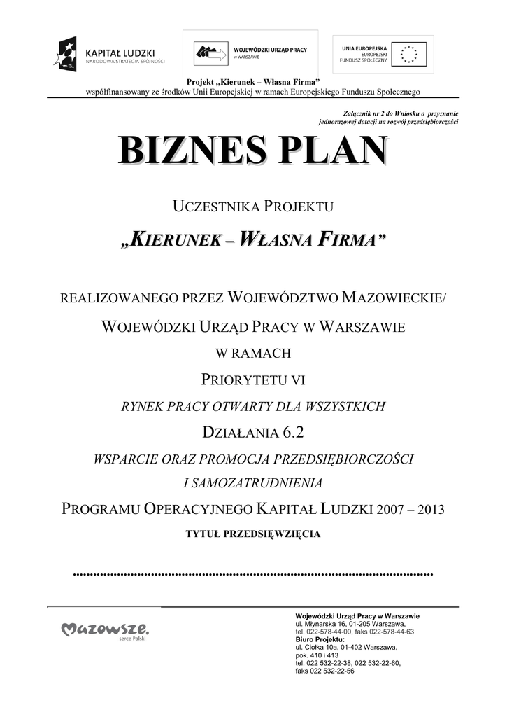 Projekt ,,K Kierunek – Własna Firma” współfinansowany ze środków Unii Europejskiej w ramach Europejskiego Funduszu Społecznego Załącznik nr 2 do Wniosku o przyznanie jednorazowej dotacji na rozwój przedsiębiorczości BIZNES PLAN UCZESTNIKA PROJEKTU „KIERUNEK – WŁASNA FIRMA” REALIZOWANEGO PRZEZ WOJEWÓDZTWO MAZOWIECKIE/ WOJEWÓDZKI URZĄD PRACY W WARSZAWIE W RAMACH PRIORYTETU VI RYNEK PRACY OTWARTY DLA WSZYSTKICH DZIAŁANIA 6.2 WSPARCIE ORAZ PROMOCJA PRZEDSIĘBIORCZOŚCI I SAMOZATRUDNIENIA PROGRAMU OPERACYJNEGO KAPITAŁ LUDZKI 2007 – 2013 TYTUŁ PRZEDSIĘWZIĘCIA .......................................................................................................... Wojewódzki Urząd Pracy w Warszawie ul. Młynarska 16, 01-205 Warszawa, tel. 022-578-44-00, faks 022-578-44-63 Biuro Projektu: ul. Ciołka 10a, 01-402 Warszawa, pok. 410 i 413 tel. 022 532-22-38, 022 532-22-60, faks 022 532-22-56 Projekt ,,K Kierunek – Własna Firma” współfinansowany ze środków Unii Europejskiej w ramach Europejskiego Funduszu Społecznego SPIS TREŚCI I. DANE UCZESTNIKA PROJEKTU .................................................................................................... 3 II. POTENCJAŁ I WYKSZTAŁCENIE UCZESTNIKA PROJEKTU ........................................... 3 2.1 WYKSZTAŁCENIE, DOŚWIADCZENIE I KWALIFIKACJE UCZESTNIKA PROJEKTU ......................................................................................................................... 3 2.2 STAN PRZYGOTOWAŃ DO PODJĘCIA DZIAŁALNOŚCI GOSPODARCZEJ I WYKONANE DZIAŁANIA...................................................................................................................... 4 2.3 PLANOWANE ZATRUDNIENIE (W PIERWSZYCH 12 MIESIĄCACH PROWADZENIA DZIAŁALNOŚCI)……………………………………………………………4 2.4 POSIADANE ZASOBY, KTÓRE BĘDĄ WYKORZYSTYWANE DO PROWADZENIA DZIAŁALNOŚCI GOSPODARCZEJ……………………………………………………....…….5 III. POMYSŁ NA BIZNES – UZASADNIENIE REALIZACJI PRZEDSIĘWZIĘCIA ............ 6 3.1 INFORMACJE OGÓLNE O PLANOWANEJ DZIAŁALNOŚCI GOSPODARCZEJ ........... 6 IV. ANALIZA RYNKOWA............................................................................................................................... 8 4.1 OFERTA – CHARAKTERYSTYKA PRODUKTU/USŁUGI/TOWARU.................................. 8 4.2 KLIENCI I RYNEK ................................................................................................................................. 9 4.3DYSTRYBUCJA I PROMOCJA .............................................................................................................10 4.4 KONKURENCJA NA RYNKU ............................................................................................................10 V. ANALIZA SILNYCH I SŁABYCH STRON DZIAŁALNOŚCI, JEJ ZAGROŻEŃ I MOŻLIWOŚCI (SWOT) ............................................................................................................................... 11 VI. OPŁACALNOŚĆ I EFEKTYWNOŚĆ PRZEDSIĘWZIĘCIA………………………...……12 VII. IDENTYFIKACJA ROZWIĄZAŃ ALTERNATYWNYCH........................................................13 VIII. TRWAŁOŚĆ EKONOMICZNO-FINANSOWA PRZEDSIĘWZIĘCIA………………...14 8.1 PROGNOZA POZIOMU CEN…………………………………… ……………….………14 8.2 PROGNOZA WIELKOŚCI SPRZEDAŻY………………………………………………….15 8.3 PROGNOZA PRZYCHODÓW ZE SPRZEDAŻY…………………………………………16 8.4 KOSZTY…………………………………………………………………………...…………17 8.5 PROGNOZA FINANSOWA…………………………………………...……………………18 8.6 RACHUNEK ZYSKÓW I STRAT……………………………………………………...……19 8.7 ŹRÓDŁA FINANSOWANIA……………………………………………………………….20 2 Projekt ,,K Kierunek – Własna Firma” współfinansowany ze środków Unii Europejskiej w ramach Europejskiego Funduszu Społecznego Wnioskodawca musi wypełnić wszystkie pola w biznes planie. Jeśli jakieś pytanie/polecenie go nie dotyczy, musi wpisać „nie dotyczy”. Pozostawienie pustych pól w dokumencie skutkować będzie odrzuceniem Wniosku o przyznanie środków finansowych na rozwój przedsiębiorczości. I. DANE UCZESTNIKA PROJEKTU. Nazwisko i imię/imiona PESEL Miejsce urodzenia NIP Adres zamieszkania Telefon E-mail Czy wnioskodawca prowadził działalność gospodarczą? Jeśli tak, to kiedy i jaką, i czy korzystał z pomocy publicznej? II. POTENCJAŁ I WYKSZTAŁCENIE UCZESTNIKA PROJEKTU. 2.1 WYKSZTAŁCENIE, DOŚWIADCZENIE I KWALIFIKACJE UCZESTNIKA PROJEKTU. W tym miejscu należy opisać zdobyte wykształcenie, ewentualne odbyte kursy szkoleniowe i doskonalące, dotychczasowe doświadczenie zawodowe i wszelkie dodatkowe posiadane umiejętności oraz, jeśli to możliwe, wskazać i ocenić ich wagę i znaczenie w stosunku do zaproponowanego w niniejszym biznes planie przedsięwzięcia. Wykształcenie Kursy i szkolenia Doświadczenie zawodowe 3 Projekt ,,K Kierunek – Własna Firma” współfinansowany ze środków Unii Europejskiej w ramach Europejskiego Funduszu Społecznego Dodatkowe umiejętności Adekwatność posiadanego doświadczenia i wykształcenia do planowanego przedsięwzięcia 2.2 STAN PRZYGOTOWAŃ DO PODJĘCIA DZIAŁALNOŚCI GOSPODARCZEJ I WYKONANE DZIAŁANIA. Proszę opisać podjęte działania w celu realizacji przedsięwzięcia np. promocja, pozyskanie klientów, zaangażowanie środków, badanie rynku. [Miejsce na opis] 2.3 PLANOWANE ZATRUDNIENIE (W PIERWSZYCH 12 MIESIĄCACH PROWADZENIA DZIAŁALNOŚCI). Proszę wymienić i opisać kluczowe dla funkcjonowania przedsiębiorstwa stanowiska, proszę podać planowane zatrudnienie w etatach lub częściach etatów. Nazwa stanowiska o