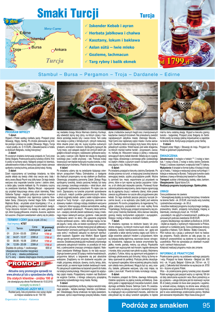 Smaki Turcji 9 dni Bułgaria Edirne Morze Czarne Istambuł PIskender Kebab i ayran Gruzja PHerbata jabłkowa i chałwa PKasztany, lokum i baklawa Bursa Troja Turcja Ankara Turcja PAslan sütü – lwie mleko PGozleme, lachmacun PTarg rybny i balik ekmek od 1799 zł Stambuł – Bursa – Pergamon – Troja – Dardanele – Edirne Irak Morze Śródziemne Syria Cypr Program imprezy 1 dzień Wyjazd z Polski według rozkładu jazdy. Przejazd przez Słowację, Węgry, Serbię. Po drodze planowane są krótkie postoje i przerwy na posiłek (Słowacja, Węgry, Turcja - koszt posiłku ok. 5-10 EUR). Zakwaterowanie w hotelu w okolicach Belgradu, nocleg tranzytowy*. 2 dzień Po wczesnym śniadaniu kontynuacja przejazdu do Turcji przez Serbię i Bułgarię. Przekroczenie granicy tureckiej w Edirne. Krótki postój na wymianę waluty. Następnie przejazd do Istambułu, zakwaterowanie w hotelu w historycznej części miasta i pierwsze spotkanie z turecką kuchnią, podczas późnej kolacji. Nocleg. 3 dzień Dzień rozpoczniemy od tureckiego śniadania, na które zwykle składa się świeży chleb oraz owcze sery: biały i słony zwany Beyaz Peynir oraz żółty kasar. Do tego świeże warzywa oraz wspaniałe tureckie czarne i zielone oliwki, a także jajka, tureckie kiełbaski itp. Po śniadaniu ruszmy na zwiedzanie Istambułu: Błękitny Meczet - najwspanialszy przykład klasycznego okresu sztuki islamskiej, Pałac Sułtanów Topkapi - niegdyś polityczne centrum imperium osmańskiego, Hipodrom oraz tajemnicza cysterna Yerebatan Saray. Zobaczymy również Hagia Sofia - Kościół Mądrości Bożej - arcydzieło sztuki bizantyjskiej z VI w., a później jedną z najsłynniejszych muzułmańskich świątyń. Turcja otoczona morzami ma dostęp do wielu gatunków ryb, które bywają grillowanie, smażone, duszone, wędzone lub suszone. Zmęczeni zwiedzaniem udamy się do położo- TERMINY I CENY (za os. w pok. 2/3 os.) Kod imprezy: KTST Cena W promocji katalogowa już od: 01 25.04 - 03.05 2399 zł 1799 zł 02 04.07 - 12.07 2399 zł 1799 zł 03 08.08 - 16.08 2399 zł 1799 zł 04 12.09 - 20.09 2399 zł 1799 zł Dopłata do pokoju 1 osobowego: 600 zł Ubezpieczenie kosztów rezygnacji: 2,4 % ceny - stawka podstawowa 6,2 % ceny - stawka obejmująca choroby przewlekłe Nr Termin Promocje Aktualne ceny promocyjne sprawdź na www.almatur.pl lub u sprzedawców oferty. Dla stałych klientów - zniżka 100 zł (nie obowiązuje przy ofercie First Moment do 15.02.2015) szczegóły na stronie 5 Rozkład jazdy nr 6 Rozkład jazdy, lista przystanków oraz wykaz dopłat za miejsce wsiadania na str. 154-155 nej niedaleko brzegu Morza Marmara dzielnicy Kumkapi, aby odwiedzić słynny targ rybny, na którym rybacy i handlarze sprzedają świeże ryby i owoce morza. Tam czeka nas kolacja w jednej z klimatycznych, rybnych restauracji, które otwarte przez cały rok, kuszą turystów cudownymi smakami, aromatami i kolorami. Spróbujemy typowych dla Turcji meze, czyli zakąsek ciepłych lub zimnych takich jak: gołąbki w liściach winogron, nadziewane i grillowane warzywa, pasty z warzyw i pikli. Będzie też okazja do degustacji tureckiego piwa i wódki anyżowej – raki. Podczas kolacji towarzyszyć nam będzie tradycyjna muzyka turecka, o charakterystycznym brzmieniu. Powrót do hotelu na nocleg. 4 dzień Po śniadaniu udamy się na zwiedzanie kipiącego orientalnym przepychem Pałacu Dolmabahce, a następnie dla chętnych proponujemy na rejs statkiem po Bosforze. Obserwując przepiękną panoramę Zatoki Złotego Rogu spróbujemy tureckiej, świeżo parzonej herbaty lub kawy oraz znanego, tureckiego smakołyku – rahat lokum, słodkiej galaretki nadziewanej orzeszkami. Po rejsie czas na lunch. Zapraszamy na tureckie przysmaki sprzedawane z ulicznych, małych punktów gastronomicznych. Można wybrać oryginalny kebab - jeden z setek rodzajów serwowanych w Turcji. Kumpir – czyli upieczony ziemniak nadziewany masłem i różnego rodzaju dodatkami warzywno – mięsnymi, które kupujący dobiera samodzielnie, według swoich upodobań smakowych. Polecamy także lachmacun – zawijany cieniutki placek nadziewany masą z mielonego mięsa i siekanych warzyw i gozleme - małe pierożki nadziewane serem na słono. Dla ugaszenia pragnienie można spróbować ayranu - lekko słonego napoju na bazie jogurtu i wody, soku ze świeżo wyciskanych owoców: granatów lub cytrusów, herbaty tradycyjnej lub jabłkowej o niesamowitym aromacie pachnących owoców. Następnie czas wolny i możliwość zakupów na słynnych stambulskich bazarach: Egipskim oraz Wielkim. Bazar Egipski oferuje szeroki asortyment przypraw, bakalii i suszonych owoców. Dodatkową atrakcją jest możliwość próżniowego pakowania zakupionych towarów, co przedłuża ich trwałość, a jednocześnie znacząco zmniejsza objętość. Natomiast zwiedzanie Wielkiego Bazaru to nie lada wyczyn. Zajmuje bowiem ponad 30 tysięcy metrów kwadratowych, przypomina labirynt, a targowanie się jest absolutnie wskazane. Znajdziemy na nim dosłownie wszystko: pamiątki, przyprawy, słodycze, dywany, ciuchy, lampy, złoto, nawet antyki, po wierne kopie torebek światowych marek. Po zakupowych szaleństwa na bazarach powrót do hotelu na kolejną turecką kolację. Wieczorem wyjazd do azjatyckiej części miasta. Przejedziemy mostem nad Bosforem na wzgórze Camlice, z którego zobaczymy przepiękną panoramę rozświetlonego nocą miasta. Nocleg. 5 dzień Po śniadaniu wyjeżdżamy do Bursy, miejsca narodzin kolejnego specjału - kebaba zwanego: İskender, czyli Aleksander. Odwiedzający Bursę smakosze nie będą zawiedzeni, ponieważ, oprócz wspomnianego powyżej kebaba, miasto słynie z kotlecików zwanych İnegöl oraz z kandyzowanych kasztanów i świeżych brzoskwiń. Nie omieszkamy zwiedzić najciekawszych zabytków miasta: Zielonego Meczetu Yeşil Camii oraz najstarszej części miasta i murów warownych. Zawitamy także na tutejszy kryty bazar, który słynie z jedwa