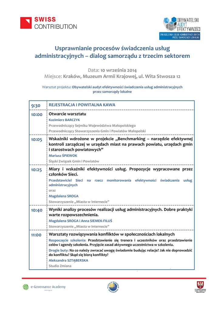 Usprawnianie procesów świadczenia usług administracyjnych – dialog samorządu z trzecim sektorem Data: 10 września 2014 Miejsce: Kraków, Muzeum Armii Krajowej, ul. Wita Stwosza 12 Warsztat projektu: Obywatelski audyt efektywności świadczenia usług administracyjnych przez samorządy lokalne 9:30 REJESTRACJA I POWITALNA KAWA 10:00 Otwarcie warsztatu Kazimierz BARCZYK Przewodniczący Sejmiku Województwa Małopolskiego Przewodniczący Stowarzyszenia Gmin i Powiatów Małopolski 10:05 Wskaźniki wdrożone w projekcie „Benchmarking – narzędzie efektywnej kontroli zarządczej w urzędach miast na prawach powiatu, urzędach gmin i starostwach powiatowych” Mariusz ŚPIEWOK Śląski Związek Gmin i Powiatów 10:25 Miary i wskaźniki efektywności usług. Propozycje wypracowane przez członków Sieci. Przedstawiciel Sieci administracyjnych na rzecz monitorowania efektywności świadczenia usług oraz Magdalena SROGA Stowarzyszenie „Miasta w Internecie” 10:40 Wyniki analizy procesów realizacji usług administracyjnych. Dobre praktyki warte rozpowszechnienia. Magdalena SROGA i Anna SIEMEK-FILUŚ Stowarzyszenie „Miasta w Internecie” 11:00 Warsztaty rozwiązywania konfliktów w społecznościach lokalnych Rozpoczęcie szkolenia: Przedstawienie się trenera i uczestników oraz przedstawienie celów i agendy szkolenia. Przyjęcie zasad aktywnego uczestnictwa w szkoleniu. Drogie buty: Na co należy zwracać uwagę świadomie budując relacje? Jak nie doprowadzić do konfliktu? Skąd się biorą konflikty? Aleksandra SZTĄBERSKA Studio Zmiana 12:00 PRZERWA KAWOWA 12:15 Warsztaty rozwiązywania konfliktów w społecznościach lokalnych c.d. Zadanie zespołowe „Powódź": Co pomaga a co przeszkadza rozwiązywaniu problemów w zespołach? Wyprawa na wyspy Perłowe: Style reagowania na konflikt. Rozpoznanie własnych preferencji funkcjonowania w konflikcie. Style reagowania na konflikt: Systematyka stylów zachowania w sytuacjach konfliktowych w oparciu o podejście do siebie i drugiej strony konfliktu. Wady i zalety każdego stylu (mini wykład, dyskusja uczestników, przykłady uczestników). Zakończenie szkolenia: Podsumowanie szkolenia. Aleksandra SZTĄBERSKA Studio Zmiana 14:45 LUNCH 15:00 ZAKOŃCZENIE WARSZTATU
