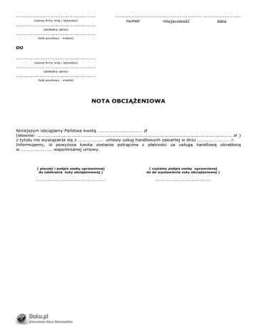 ................................................ (nazwa firmy imię i nazwisko) ................................................ .................................................... ....................... numer miejscowość data (dokładny adres) ................................................ (kod pocztowy - miasto) DO ................................................ (nazwa firmy imię i nazwisko) ................................................ (dokładny adres) ................................................ (kod pocztowy - miasto) NOTA OBCIĄŻENIOWA Niniejszym obciążamy Państwa kwotą ........................... zł (słownie: ..................................................................................................................... zł ) z tytułu nie wywiązania się z ................ umowy usług handlowych zawartej w dniu .................... r. Informujemy, iż powyższa kwota zostanie potrącona z płatności za usługę handlową określoną w ................... wspomnianej umowy. ( pieczęć i podpis osoby uprawnionej do odebrania noty obciążeniowej ) ( czytelny podpis osoby uprawnionej do do wystawienia noty obciążeniowej ) .......................................... ..................................
