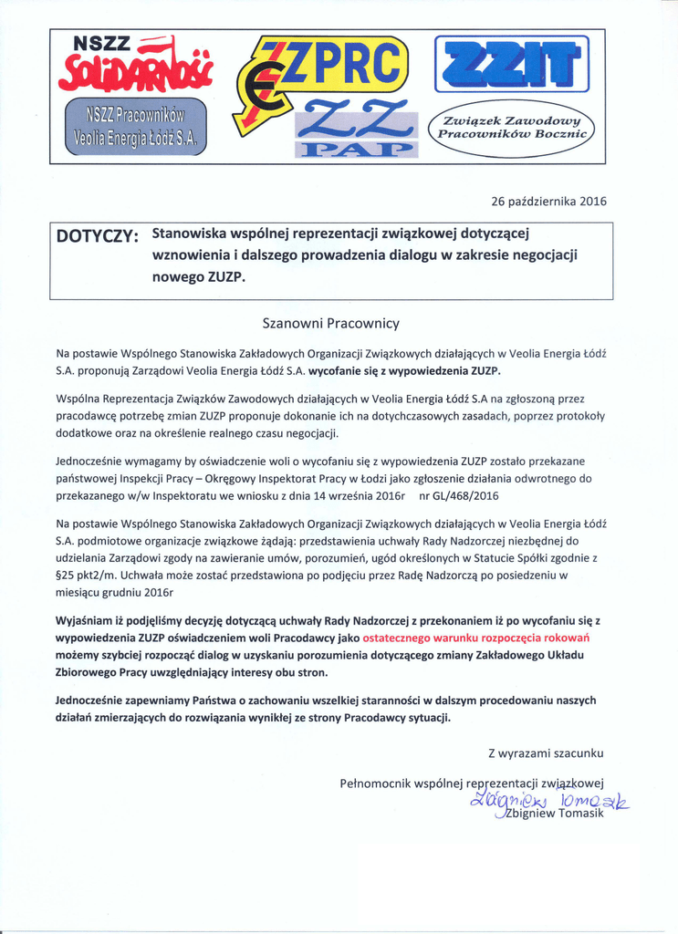 26 DOTYCZY: października 2016 Stanowiska wspólnej reprezentacji związkowej dotyczącej wznowienia i dalszego prowadzenia dialogu w zakresie negocjacji nowego ZUZP. Szanowni Pracownicy Na postawie Wspólnego Stanowiska Zakładowych Organizacji Związkowych działających w Veo lia Energia Łódź S.A. proponują Zarządowi Veolia Energia Łódź się S.A. wycofanie z wypowiedzenia ZUZP. Wspólna Reprezentacja Związków Zawodowych działających w Veolia Energia Łódź S.A na zgłoszoną przez pracodawcę potrzebę dodatkowe oraz na Jednocześnie państwowej zmian ZUZP proponuje dokonanie ich na dotychczasowych zasadach, poprzez określenie realnego czasu negocjacji. wymagamy by oświadczenie woli o wycofaniu się z wypowiedzenia ZUZP zosta ło przekazane Inspekcji Pracy- Okręgowy Inspektorat Pracy w Łodzi jako zgłoszenie działania odwrotnego do przekazanego w/w Inspektoratu we wniosku z dnia 14 września 2016r Na postawie Wspólnego Stanowiska S.A. podmiotowe organizacje udzielania protokoły Zarządowi Zakładowych związkowe żądają: Organizacji Związkowych działających przedstawienia zgody na zawieranie umów, nr GL/468/2016 porozumień, uchwały ugód w Veolia Energia Rady Nadzorczej określonych niezbędnej w Statucie Spółk i Łódź do zgodnie z §25 pkt2/m. Uchwała może zostać przedstawiona po podjęciu przez Radę Nadzorczą po posiedzeniu w miesiącu grudniu 2016r Wyjaśniam iż podjęliśmy decyzję dotyczącą uchwały Rady Nadzorczej z przekonaniem iż po wycofaniu się z wypowiedzenia ZUZP oświadczeniem woli Pracodawcy jako ostatecznego warunku rozpoczęcia rokowań możemy szybciej rozpocząć Zbiorowego Pracy Jednocześnie dialog w uzyskaniu porozumienia uwzględniający zapewniamy działań zmierzających do dotyczącego zmiany Zakładowego Układu interesy obu stron. Państwa o zachowaniu wszelkiej rozwiązania wynikłej staranności w dalszym procedowaniu naszych ze strony Pracodawcy sytuacji. Z wyrazami szacunku Pełnomocnik wspólnej repr e; ent~cji zwj.ą.ztowej ~ eteA 91 [email protected] 10 1)'111 a~ }z__ ~ bigniew Tomasik