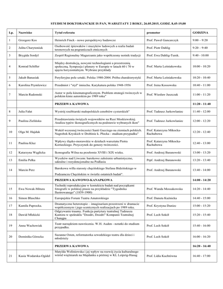 STUDIUM DOKTORANCKIE IS PAN, WARSZTATY 2 ROKU, 26.05.2015, GODZ. 8,45-19,00 Lp. Nazwisko Tytuł referatu promotor GODZINA 1 Grzegorz Kos Heinrich Finck - nowe perspektywy badawcze Prof. Paweł Gancarczyk 9:00 – 9:20 2 Julita Charytoniuk Osobowość śpiewaków i muzyków ludowych a realia badań terenowych na pograniczach etnicznych Prof. Piotr Dahlig 9:20 – 9:40 3 Brygida Sordyl Zespół Regionalny Magurzanie jako współczesny nośnik tradycji Prof. Ewa Dahlig-Turek. 9:40 - 10:00 4 Konrad Schiller Między destrukcją, nowymi technologiami a przestrzenią społeczną. Sympozja i plenery w Europie w latach 60 i 70 w ujęciu horyzontalnym. Wybrane przykłady Prof. Marta Leśniakowska 10:00 - 10:20 5 Jakub Banasiak Peryferyjne pole sztuki. Polska 1980-2004. Próba charakterystyki Prof. Marta Leśniakowska 10:20 - 10:40 6 Karolina Prymlewicz Przedmiot i "styl" śmiechu. Karykatura polska 1948-1956 Prof. Irena Kossowska 10:40 - 11:00 7 Marcin Radomski Autor w polu kinematograficznym. Problem strategii twórczych w polskim kinie autorskim po 1989 roku" Prof. Wiesław Juszczak 11:00 - 11:20 PRZERWA KAWOWA 11:20 - 11:40 8 Julia Fałat Wystrój rzeźbiarski małopolskich cenobiów cysterskich" Prof. Tadeusz Jurkowlaniec 11:40 - 12:00 9 Paulina Zielińska Przedstawienia świętych wojowników na Rusi Moskiewskiej. Analiza typów ikonograficznych na podstawie wybranych ikon" Prof. Tadeusz Jurkowlaniec 12:00 - 12:20 10 Olga M. Hajduk Wokół wczesnej twórczości Santi Gucciego na ziemiach polskich. Nagrobek Kryskich w Drobinie k. Płocka - studium przypadku" Prof. Katarzyna MikockaRachubowa 12:20 - 12:40 11 Paulina Kluz Wpływy śląsko-morawskie w dziełach warsztatu Piotra Korneckiego. Przyczynek do genezy twórczości. Prof. Katarzyna MikockaRachubowa 12:40 - 13:00 12 Katarzyna Węglicka Ikonografia Wilna na przełomie XVIII i XIX wieku. Prof. Andrzej Baranowski 13:00 - 13:20 13 Emilia Pełka Wyszków nad Liwcem: barokowe założenie urbanistyczne, sakralne i rezydencjonalne na Podlasiu Prpf. Andrzej Baranowski 13:20 - 13:40 14 Marcin Perz Prof. Andrzej Baranowski 13:40 - 14:00 Barokowa willa starosty chęcińskiego Stefana Bidzińskiego w Podzamczu Chęcińskim w świetle ostatnich badań". PRZERWA KAWOWO-KANAPKOWA 14:00 - 14:20 15 Ewa Nowak-Mitura Techniki reprodukcyjne w kontekście badań nad początkami fotografii w polskiej prasie na przykładzie "Tygodnika Ilustrowanego" (1859-1900) Prof. Wanda Mossakowska 14:20 - 14:40 16 Simon Blaschko Europejskie Forum Teatru Amatorskiego Prof. Danuta Kuźnicka 14:40 - 15:00 17 Kamila Paprocka. Prof. Krystyna Duniec 15:00 - 15:20 18 Dawid Mlekicki Prof. Lech Sokół 15:20 - 15:40 19 Anna Wachowiak Teatr narzędziem nawrócenia. W.H. Auden - notatki do studium przypadku. Prof. Lech Sokół 15:40 - 16:00 20 Dominika Górecka Suzanne Osten, reformatorka szwedzkiego teatru dla dzieci i młodzieży Prof. Lech Sokół 16:00 - 16:20 Dramatyczne heterotopie – imaginarium przestrzeni w dramacie współczesnym i jego scenicznych realizacjach po 1989 roku. Odgrywanie traumy. Funkcja partytury teatralnej Tadeusza Kantora w spektaklu "Doodri, Doodri" Kompanii Teatralnej Changpa PRZERWA KAWOWA 21 Kasia Wodarska-Ogidel Matylda Woliniewska i jej wpływ na rozwój życia kulturalnego wśród więźniarek na Majdanku a później w KL Leipzig-Hasag 16:20 - 16:40 Prof. Lidia Kuchtówna 16:40 - 17:00 22 Radosław Lubiak "Wraca nowe" - polityka kulturalna PZPR wobec teatru po Październiku 1956 Prof. Lidia Kuchtówna 17:00 - 17:20 23 Malwina Ciechan Główne nurty życia teatralnego w getcie warszawskim, 19401942. Prof. Edward Krasiński 17:20 - 17:40 24 Marta Andrzejczak Biżuteria jednorazowa Prof. Irena Huml 18:00 - 18:20