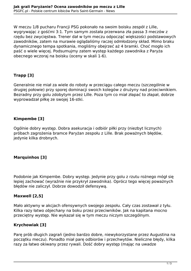 Jak grali Paryżanie? Ocena zawodników po meczu z Lille PSGFC.pl - Polskie centrum kibiców Paris Saint-Germain - News W meczu 1/8 pucharu Francji PSG pokonało na swoim boisku zespół z Lille, wygrywając z gośćmi 3:1. Tym samym została przerwana zła passa 3 meczów z rzędu bez zwycięstwa. Trener dał w tym meczu odpocząć większości podstawowych zawodników, zatem na murawie oglądaliśmy raczej odmłodzony skład. Mimo braku dynamicznego tempa spotkania, mogliśmy obejrzeć aż 4 bramki. Choć mogło ich paść o wiele więcej. Podsumujmy zatem występ każdego zawodnika z Paryża obecnego wczoraj na boisku (oceny w skali 1-6). Trapp [3] Generalnie nie miał za wiele do roboty w przeciągu całego meczu (szczególnie w drugiej połowie) przy sporej dominacji swoich kolegów z drużyny nad przeciwnikiem. Bezradny przy golu zdobytym przez Lille. Poza tym co miał złapać to złapał, dobrze wyprowadzał piłkę ze swojej 16-stki. Kimpembe [3] Ogólnie dobry występ. Dobra asekuracja i odbiór piłki przy (niezbyt licznych) próbach zagrożenia bramce Paryżan zespołu z Lille. Brak poważnych błędów, jedynie kilka drobnych. Marquinhos [3] Podobnie jak Kimpembe. Dobry występ. Jedynie przy golu z rzutu rożnego mógł się lepiej zachować (wyraźnie nie przykrył zawodnika). Oprócz tego więcej poważnych błędów nie zaliczył. Dobrze dowodził defensywą. Maxwell [2,5] Mało aktywny w akcjach ofensywnych swojego zespołu. Cały czas zostawał z tyłu. Kilka razy łatwo objechany na boku przez przeciwników. Jak na kapitana mocno przeciętny występ. Nie wykazał się w tym meczu niczym szczególnym. Krychowiak [3] Parę prób długich zagrań (jedno bardzo dobre, niewykorzystane przez Augustina na początku meczu). Ponadto miał parę odbiorów i przechwytów. Nieliczne błędy, kilka razy za łatwo okiwany przez rywali. Dość dobry występ (mając na uwadze 1/3 Jak grali Paryżanie? Ocena zawodników po meczu z Lille PSGFC.pl - Polskie centrum kibiców Paris Saint-Germain - News wcześniejsze). Nkunku [3,5] Kiepski początek, przez znaczną część pierwszej połowy niewidoczny, niezbyt przydawał się drużynie. Znacznie lepsza druga połowa, częściej widziany przy piłce. Asystował przy drugiej bramce Lucasa, kilka razy postraszył strzałami bramkarza Lille (strzał w poprzeczkę po dobrej indywidualnej akcji) Verratti [3,5] Solidny występ Włocha. Brał udział w konstruowaniu akcji ofensywnych zespołu. Miał znaczy udział przy zdobyciu 2 bramki przez Paryżan. Wystrzegał się błędów. Zagrał parę dobrych, prostopadłych podań. Ogólnie występ na plus. Jese [2,5] Znów pokazał, że daleko mu od swojej dyspozycji sprzed ponad roku. Mało kreatywny w akcjach ofensywnych, liczne straty piłki, nieudane dryblingi i źle podejmowane decyzje. Zdarzały się także problemy z opanowaniem piłki. Jedynie zdobyta bramka poprawia trochę jego ocenę końcową (choć też więcej było w niej przypadku niż umiejętności). Lucas [3,5] Chaotyczny początek Brazylijczyka, od jakoś 30 minuty zaczęło być coraz lepiej. Spory udział przy pierwszym golu poprzez świetne podanie piętą do Augustina, który, według sędziego, został sfaulowany przez bramkarza. Przy drugiej bramce znalazł się we właściwym miejscu, kierując piłkę do siatki po podaniu Nkunku. Zdobyte 2 gole poprawiają jego ocenę, lecz nie był to też najlepszy mecz w wykonaniu Lucasa. Augustin [2] Słaby występ 19 latka. Mógł strzelić spokojnie przynajmniej 2 bramki. Brak skuteczności w oddawanych strzałach, mijał się z piłką w polu karnym, nie trafiał w nią. Jedyne co zrobił dla drużyny to „wywalczył” (bardzo kontrowersyjny) rzut karny, po którym padła bramka, co należy zapisać jako plus obok tego zawodnika. Usprawiedliwiać go może jedynie wiek i brak ogrania. Ikone, Matudi 2/3 Jak grali Paryżanie? Ocena zawodników po meczu z Lille PSGFC.pl - Polskie centrum kibiców Paris Saint-Germain - News Nie spędzili zbyt wiele czasu na boisku (około 20 minut każdy). W tym czasie żaden nie wykazał się niczym szczególnym. Zagrali przeciętnie. Ponadto grali zbyt krótko, żeby ich oceniać (były to raczej zmiany mające na celu danie odpoczynku zawodnikom, których zmieniali) Autor: PSGKP 3/3 Powered by TCPDF (www.tcpdf.org)