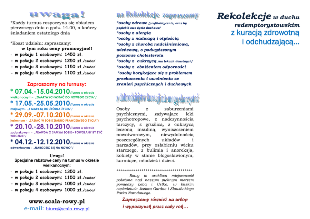 *Każdy turnus rozpoczyna się obiadem pierwszego dnia o godz. 14.00, a kończy śniadaniem ostatniego dnia *Koszt udziału: zapraszamy: w tym roku ceny promocyjne!! - w pokoju 1 osobowym: 1450 zł. - w pokoju 2 osobowym: 1250 zł./osoba/ - w pokoju 3 osobowym: 1150 zł./osoba/ - w pokoju 4 osobowym: 1100 zł./osoba/ Zapraszamy na turnusy: *osoby zdrowe /profilaktycznie, oraz by pogłębić swe życie duchowe/ *osoby z alergią *osoby z nadwagą i otyłością *osoby z chorobą nadciśnieniową, wieńcową, o podwyższonym poziomie cholesterolu *osoby z cukrzycą /na lekach doustnych/ *osoby z obniżeniem odporności *osoby borykające się z problemem przebaczenia i uwolnienia ze zranień psychicznych i duchowych * 07.04.-15.04.2010/Turnus w okresie wielkanocnym - „ZMARTWYCHWSTAĆ DO NOWEGO ŻYCIA”/ * 17.05.-25.05.2010/Turnus w okresie majowym- „Z MARYJĄ DO ŹRÓDLA ŻYCIA”/ * 29.09.-07.10.2010/Turnus w okresie jesiennym - „ZASIAĆ W SOBIE ZIARNO PRAWDZIWEGO ŻYCIA”/ * 20.10.-28.10.2010/Turnus w okresie zaduszkowym - „PRAWDA O SAMYM SOBIE – POWOLANY BY ŻYĆ WIECZNIE”/ * 04.12.-12.12.2010/Turnus w okresie adwentowym - „NARODZIĆ SIĘ NA NOWO”/ - Uwaga! Specjalne rabatowe ceny na turnus w okresie wielkanocnym: w pokoju 1 osobowym: 1350 zł. w pokoju 2 osobowym: 1150 zł./osoba/ w pokoju 3 osobowym: 1050 zł./osoba/ w pokoju 4 osobowym: 1000 zł./osoba/ www.scala-rowy.pl e-mail: [email protected] Osoby z zaburzeniami psychicznymi, zażywające leki psychotropowe, z nadczynnością tarczycy, z gruźlicą, z cukrzycą leczoną insuliną, wyniszczeniem nowotworowym, niewydolnością poszczególnych układów i narządów, przy osłabieniu wieku starczego, z bulimią i anoreksją, kobiety w stanie błogosławionym, karmiące, młodzież i dzieci. *************************************** Rowy to urokliwa miejscowość położona nad naszym pięknym morzem pomiędzy Łebą i Ustką, w bliskim sąsiedztwie Jeziora Gardno i Słowińskiego Parku Narodowego. Zapraszamy również na urlop i wypoczynek przez cały rok… Rekolekcje w duchu redemptorystowskim z kuracją zdrowotną i odchudzającą… Człowiek - czyli ciało i duch - a w zdrowym ciele – zdrowy duch… dlatego proponujemy przywracanie zdrowia przez naukę właściwego żywienia, diagnozę stanu zdrowia i zagrożenia chorobami cywilizacyjnymi, leczenie zatrucia organizmu na skutek stresu i nieprawidłowego sposobu odżywiania oraz odnowę ducha, by odzyskać w sobie na nowo dobro, pokój, radość i zdrowie. Zapraszamy zatem do Domu rekolekcyjnego Redemptorystów „SCALA” w Rowach nad polskim morzem… Żyje się tylko raz - nie można więc życia zmarnować… co zatem zrobić, by dobrze przeżyć swoje życie? – odpowiedź jest prosta: to uczynić siebie szczęśliwym.. a człowiek może być tak naprawdę szczęśliwy tylko wtedy gdy odkryje zdolność swego serca, które powołane jest by… kochać. Dlatego celem pobytu jest utrwalenie lub odzyskanie na nowo pokoju, dobra, radości i zdrowia – a to wszystko swe źródło ma w sercu człowieka. SCALA – znaczy tyle co schody… a więc droga do góry…Powołaniem chrześcijanina jest „szukać tego co w górze…”, a to nie przychodzi łatwo…dlatego proponujemy rekolekcje /żywa obecność Boga pośród nas, modlitwa, dialog i otwarcie na drugiego człowieka we wspólnocie rekolekcyjnej/ oraz kurację zdrowotną i dla potrzebujących: kurację odchudzającą. /zdrowe i właściwe odżywianie dla każdego/ POMOCĄ W WĘDROWANIU KU GÓRZE będą ćwiczenia duchowe: *codzienna Msza św. z nauką rekolekcyjną /cykl nauk w duchu redemptorystowskim/ *modlitwa kontemplacji według św. Alfonsa M.Liguorii *adoracje Najświętszego Sakramentu *Nabożeństwo uzdrowienia serca przez przebaczenie – nabożeństwo pojednania *Nabożeństwo umocnienia – Sakrament Namaszczenia Chorych *Nabożeństwo ponownego opowiedzenia się za Chrystusem, Lekarzem ducha i ciała. *rozmowy z kierownikiem duchowym Zasady zdrowego stylu życia, z którymi zapoznajemy się podczas pobytu w naszym ośrodku w Rowach nad polskim morzem zapewniają naukę zdrowego życia a przez nie w konsekwencji korzystnej zmiany w organizmie, co pozwala żyć w lepszym zdrowiu i sprawności psychofizycznej. Zdrowe żywienie, ruch wpływa korzystnie na oczyszczenie organizmu z toksyn dnia codziennego, a dla potrzebujących skutecznie wpływa na odchudzanie. Wszystko to dokonuje się w dobroczynnym klimacie polskiego morza. Dom rekolekcyjny posiada 35 przestronnych, komfortowych pokoi. Jednorazowo może pomieścić 70 osób. Wyposażenie pokoi: telewizor/oprócz pokoi 4 osobowych/, czajnik, dostęp do Internetu oraz łazienka. W domu znajduje się: 2 kaplice, sala audiowizualna, sala spotkań przy kominku, sala telewizyjna, sala fitness i siłownia, sauna, gabinet masażu, oraz monitorowany parking. Dom rekolekcyjny SCALA ul. Nadmorska 6, 76-212 ROWY tel. 0 693 642 834, 691114502 059 814 18 03 www.scala-rowy.pl *kontrolę lekarską: /całodobowa opieka lekarska/ konsultację i porady lekarskie, pomiar ciśnienia krwi i cukru *diagnozowanie błędów żywieniowych i ustalenie planu dietoterapii *aktywny wypoczynek: gimnastykę i aerobik, zorganizowane spacery brzegiem morza lub po parku krajobrazowym, przejażdżki rowerowe, basen *program kulturalny: wieczory muzyczne /zabawa taneczna/, spotkania z poezją, ciekawe filmy *wykłady, prelekcje, pokazy dotyczące zdrowego stylu życia i żywienia *spotkania z psychologiem *masaże całkowite i częściowe *korzystanie z sauny *dodatkowe korzystanie z basenu *dodatkowe wypożyczenie roweru *rejs po morzu *dokumentację lekarską *zażywane leki *obuwie i strój sportowy *płaszcz przeciwdeszczowy *ręcznik, strój kąpielowy, czepek WARUNKIEM UTRZYMANIA REZERWACJI JEST PRZEDPLATA NA TRZY MIESIĄCE PRZED ROZPOCZĘCIEM TURNUSU Przedpłata jest bezzwrotna, możliwość wykorzystania przedpłaty na inny turnus. Wpłaty należy dokonywać przekazem po