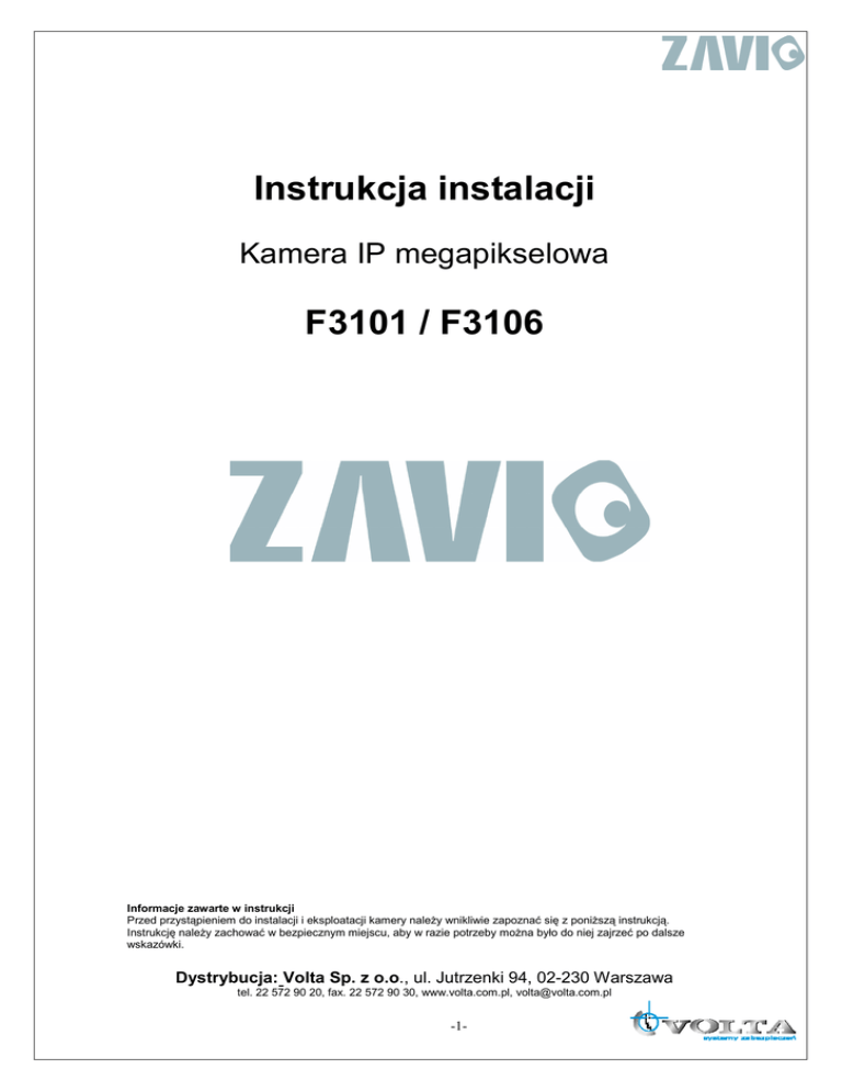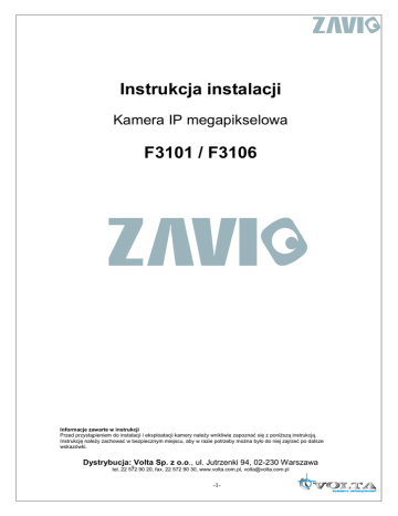 Instrukcja instalacji Kamera IP megapikselowa F3101 / F3106 Informacje zawarte w instrukcji Przed przystąpieniem do instalacji i eksploatacji kamery naleŜy wnikliwie zapoznać się z poniŜszą instrukcją. Instrukcję naleŜy zachować w bezpiecznym miejscu, aby w razie potrzeby moŜna było do niej zajrzeć po dalsze wskazówki. Dystrybucja: Volta Sp. z o.o., ul. Jutrzenki 94, 02-230 Warszawa tel. 22 572 90 20, fax. 22 572 90 30, www.volta.com.pl, [email protected] -1- UWAGA RYZYKO PORAśENIA PRĄDEM ELEKTRYCZNYM. NIE OTWIERAĆ UWAGA! ABY ZREDUKOWAĆ RYZYKO PORAśENIA PRĄDEM ELEKTRYCZNYM NIE OTWIERAJ POKRYWY ZEWNĘTRZNEJ. W RAZIE BŁĘDNEGO DZIAŁANIA ODDAJ URZĄDZENIE DO AUTORYZOWANEGO SERWISU UWAGA!!! PAMIĘTAJ O OCHRONIE PRZECIWPRZEPIĘCIOWEJ Kamery jako elementy w znacznym stopniu naraŜone na uszkodzenia spowodowane wyładowaniami atmosferycznymi lub/i innego typu przepięciami, powinny być zabezpieczone dodatkowymi elementami ochrony przepięciowej. W kwestii doboru urządzeń słuŜącej do ochrony zapraszamy na naszą stronę internetową www.volta.com.pl do działu Pomocy Technicznej >> Pytania i odpowiedzi, lub do konsultacji z Działem Technicznym: [email protected] Kamera, która została uszkodzona w wyniku braku urządzeń ochrony przepięciowej w instalacji NIE PODLEGA GWARANCJI. Funkcje kamer w zaleŜności od wersji oprogramowania, mogą się róŜnić od tych podanych w instrukcji. -2- -3- Spis treści 1. Zawartość opakowania…………………………………………….………….5 2. 3. 4. 5. Wygląd i złącza kamery……………..………………………….….………….5 Instalacja i sposób podłączenia kamery………………………..…………...6 System Windows – uŜycie programu Intelligent IP Installer……..…….….7 Połączenie z kamerą IP przez przeglądarkę IE z wykorzystaniem 6. 7. programu Intelligent IP Installer……………………………………………..7 UŜycie przeglądarki Safari dla system Mac OS…………………………...11 Zmiana ustawień domyślnej częstotliwości sieci………………………….12 8. 9. 10. 11. Zmiana języka interfejsu www kamery IP………………………………….12 Połączenia z kamerą IP z urządzeń mobilnych……………………………13 Połączenia przez MSN (Windows Live Messenger)………………………13 Ustawienia sieciowe……………………………………………………...…..16 12. Ustwienia sieci bezprzewodowej (Wifi)…………………………………….19 -4- 1. Zawartość opakowania: Kamera Kamera IP megapikselowa ZAVIO F3101 / F3106 Instrukcja Instalacji Instrukcja instalacji i dane techniczne kamery Płyta CD Oprogramowanie IP Surveillance Software (oprogramowanie dla systemu Windows pozwalające na rejestrację do 16 kamer IP firmy Zavio) Oprogramowanie Intelligent IP Installer (oprogramowanie dla systemu Windows pozwalające na wyszukanie w sieci i wstępną konfigurację kamer IP firmy Zavio) Instrukcje Pakiety językowe Zestaw montaŜowy Uchwyt montaŜowy, trzy śruby mocujące Zasilacz 12V DC, maks. 12 W 2. Wygląd i złącza kamery Regulacja ostrości Status zasilania Status sieci Mikrofon Slot karty SD/SDHC Zasilanie 12VDC Przycisk Reset Wyjście audio (głośnik) Przycisk WPS Sieć Ethernet Regulacja ostrości: NaleŜy wkręcać/wykręcać obiektyw aŜ do uzyskania prawidłowego (ostrego) obrazu. Reset: Przy włączonym zasilaniu naleŜy wcisnąć przycisk Reset aby zrestartować kamerę. Przytrzymanie przycisku przez około 10 sekund powoduje przywrócenie ustawień fabrycznych kamery. WPS: UmoŜliwia automatyczną konfigurację bezprzewodowej w systemie WPS (tylko kamera F3106). -5- Sygalizacja diod LED Wskaźnik zasilania Stałe czerwone Stałe niebieskie Stałe niebieskie -> migające fioletowe Migające fioletowe -> stałe niebieskie Migające fioletowe -> stałe niebieskie 30 sek Stałe niebieskie -> brak Stałe niebieskie -> brak -> stałe niebieskie Uruchamianie kamery Kamera gotowa do pracy Po wciśnięciu przycisku WPS, kamera gotowa do połączenia WPS Połączenie WPS udane Błąd połączenia WPS Restart (przycisk RESET) Powrót do ustawień fabrycznych (po ok. 10 sek. wciśniety przycisk RESET) Stałe niebieskie -> migające fioletowe Aktualizacja firmware Stałe niebieskie -> stałe fioletowe Stałe fioletowe -> stałe niebieskie Stałe niebieskie -> stałe fioletowe -> stałe czerwone Stałe niebieskie -> stałe fioletowe -> stałe niebieskie Wskaźnik sieci Rozpoznawanie karty SD/SDHC Karta SD/SDHC gotowa do pracy Migające niebieskie Brak Transmisja sieciowa w toku Brak transmisji Błąd karty SD/SDHC Karta SD/SDHC gotowa do pracy 3. Instalacja i sposób podłączenia kamery a. MontaŜ ścienny i sufitowy 1. Wykorzystując dostarczone w komplecie śruby montaŜowe zamocować podstawę do płaskiej powierzchni (ściany lub sufitu). 2. Poluzować pokrętło regulacyjne i ustawić kamerę w odpowiedniej pozycji 3. Dokręcić pokrętło regulacyjne. b. Połączenia kablowe 1. Podłączyć kabel sieciowy do gniazda RJ-45. 2. Podłączyć kabel zasilający do gniazda DC 12V. -6- 4. System Windows – uŜycie programu Intelligent IP Installer Po włoŜeniu płyty CD dołączonej do kamery Zavio, automatycznie uruchomi się program startowy. PoniŜsza procedura przedstawia w jaki sposób znaleźć, skonfigurować i połączyć się przez przeglądarkę www z kamerą IP firmy Zavio. Wybierz “Intelligent IP Installer” aby rozpocząć standardową procedurą instalacji. 5. Połączenie przez przeglądarkę IE z kamerą IP z wykorzystaniem programu Intelligent IP Installer 1. Przed połączeniem z kamerą naleŜy sprawdzić ustawienia przeglądarki Internet Explorer. a. IE - > Narzędzia - > Opcje Internetowe -> Zabezpieczenia -> Zabezpieczenia - > Poziom domyślny b. IE - > Narzędzia - > Opcje Internetowe -> Zabezpieczenia -> Prywatność - > Blokowanie wyskakujących okienek -7- 2. Uruchom