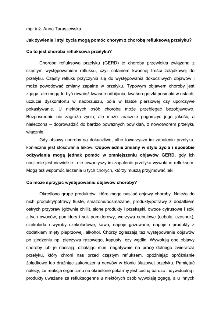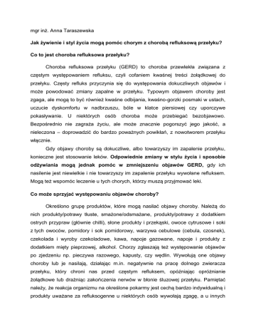 mgr inż. Anna Taraszewska Jak żywienie i styl życia mogą pomóc chorym z chorobą refluksową przełyku? Co to jest choroba refluksowa przełyku? Choroba refluksowa przełyku (GERD) to choroba przewlekła związana z częstym występowaniem refluksu, czyli cofaniem kwaśnej treści żołądkowej do przełyku. Częsty refluks przyczynia się do występowania dokuczliwych objawów i może powodować zmiany zapalne w przełyku. Typowym objawem choroby jest zgaga, ale mogą to być również kwaśne odbijania, kwaśno-gorzki posmaki w ustach, uczucie dyskomfortu w nadbrzuszu, bóle w klatce piersiowej czy uporczywe pokasływanie. U niektórych osób choroba może przebiegać bezobjawowo. Bezpośrednio nie zagraża życiu, ale może znacznie pogorszyć jego jakość, a nieleczona – doprowadzić do bardzo poważnych powikłań, z nowotworem przełyku włącznie. Gdy objawy choroby są dokuczliwe, albo towarzyszy im zapalenie przełyku, konieczne jest stosowanie leków. Odpowiednie zmiany w stylu życia i sposobie odżywiania mogą jednak pomóc w zmniejszeniu objawów GERD, gdy ich nasilenie jest niewielkie i nie towarzyszy im zapalenie przełyku wywołane refluksem. Mogą też wspomóc leczenie u tych chorych, którzy muszą przyjmować leki. Co może sprzyjać występowaniu objawów choroby? Określono grupę produktów, które mogą nasilać objawy choroby. Należą do nich produkty/potrawy tłuste, smażone/odsmażane, produkty/potrawy z dodatkiem ostrych przypraw (głównie chilli), słone produkty i przekąski, owoce cytrusowe i soki z tych owoców, pomidory i sok pomidorowy, warzywa cebulowe (cebula, czosnek), czekolada i wyroby czekoladowe, kawa, napoje gazowane, napoje i produkty z dodatkiem mięty pieprzowej, alkohol. Chorzy zgłaszają też występowanie objawów po zjedzeniu np. pieczywa razowego, kapusty, czy wędlin. Wywołują one objawy choroby lub je nasilają, działając m.in. negatywnie na pracę dolnego zwieracza przełyku, który chroni nas przed częstym refluksem, opóźniając opróżnianie żołądkowe lub drażniąc zakończenia nerwów w błonie śluzowej przełyku. Pamiętać należy, że reakcja organizmu na określone pokarmy jest cechą bardzo indywidualną i produkty uważane za refluksogenne u niektórych osób wywołają zgagę, a u innych nie. Warto więc obserwować reakcje swojego organizmu na różne produkty i eliminować z diety te, które powodują lub nasilają dolegliwości. Występowaniu objawów choroby sprzyjają też: spożywanie obfitych posiłków, przyjmowanie pozycji leżącej zaraz po posiłku oraz nadwaga/otyłość, palenie papierosów, duży wysiłek fizyczny (zwłaszcza wykonywany tuż po posiłkach). Co robić, by zmniejszyć ryzyko wystąpienia objawów choroby refluksowej przełyku? Należy unikać jedzenia produktów, po których występują objawy – chorym polecana jest dieta lekkostrawna z ograniczeniem produktów tłustych. Warto też założyć dzienniczek i notować, w jakich okolicznościach, po jakich produktach/potrawach objawy się pojawiają lub nasilają i wykluczyć te produkty ze swego jadłospisu. Można popijać niegazowaną wodę mineralną lub chude mleko – popijanie tych płynów u niektórych chorych może przynieść chwilową ulgę, ponieważ neutralizują one kwaśną treść przedostającą się do przełyku oraz ułatwiają jej spłukiwanie ze ścianek przełyku. Warto unikać obfitych posiłków – posiłki o dużej objętości sprzyjają występowaniu zgagi, gdyż prowadzą do rozciągania ścian żołądka, co skutkuje zmniejszeniem napięcia w dolnym zwieraczu przełyku. Zaleca się spożywanie 4–5 posiłków dziennie o mniejszej objętości. Należy zachować 2–3-godzinny odstęp między ostatnim posiłkiem a snem – odpowiednio długa przerwa między posiłkiem a nocnym odpoczynkiem zmniejsza ryzyko wystąpienia refluksu. Pozycja leżąca przyjmowana bezpośrednio lub w krótkim czasie po posiłku utrudnia oczyszczanie przełyku z zarzucanej treści pokarmowej, co może powodować silny dyskomfort. Nocne pojadanie też nie jest wskazane. Wskazane jest regularne spożywanie posiłków – zachowanie 3–4-godzinnej przerwy między posiłkami zmniejsza chęć na jedzenie posiłków obfitych. Sprawniejszemu trawieniu sprzyja też jadanie posiłków bez pośpiechu, najlepiej w miłej atmosferze. Należy unikać pozycji leżącej po posiłkach – pozycja leżąca, zwłaszcza po posiłkach obfitujących w tłuszcz, może sprowokować wystąpienie zgagi. W czasie odpoczynku lub snu wskazane jest uniesienie wezgłowia łóżka o 15–20 cm – odpoczynek w pozycji półleżącej sprzyja sprawniejszemu oczyszczaniu przełyku. Takie postępowanie przynosi ulgę, zwłaszcza chorym z problemem zgagi nocnej. Warto mieć na uwadze, że nasza anatomiczna bariera antyrefluksowa lepiej działa podczas snu/odpoczynku na lewym boku. Warto unikać wysiłku fizycznego bezpośrednio po posiłkach – poposiłkowy wysiłek fizyczny może wywołać lub nasilić zgagę. Osoby chore powinny także unikać dużego wysiłku fizycznego związanego zwłaszcza z częstym lub długotrwałym schylaniem się, bądź z podnoszeniem ciężkich rzeczy, gdyż taka aktywność może nasilić objawy chorobowe. Warto zrezygnować z noszenia odzieży uciskającej okolice jamy brzusznej – noszenie ubrań uciskających okolice jamy brzusznej, mocno zaciśniętych pasków, bielizny wyszczuplającej, zwłaszcza u osób z nadmierną masą ciała, może nasilać przykre dolegliwości. Warto rzucić palenie – palenie tytoniu może nasilać dolegliwości chorobowe, ponieważ negatywnie wpływa na działanie dolnego zwieracza przełyku. Dodatkowo powoduje zmniejszone wydzielanie śliny, co utrudnia oczyszczanie przełyku z kwaśnej treści żołądkowej. Występujący często u palaczy kaszel napadowy też może sprzyjać zarzucaniu kwaśnej treści żołądka do przełyku. Osobom z nadmierną masą ciała zaleca się schudnięcie 