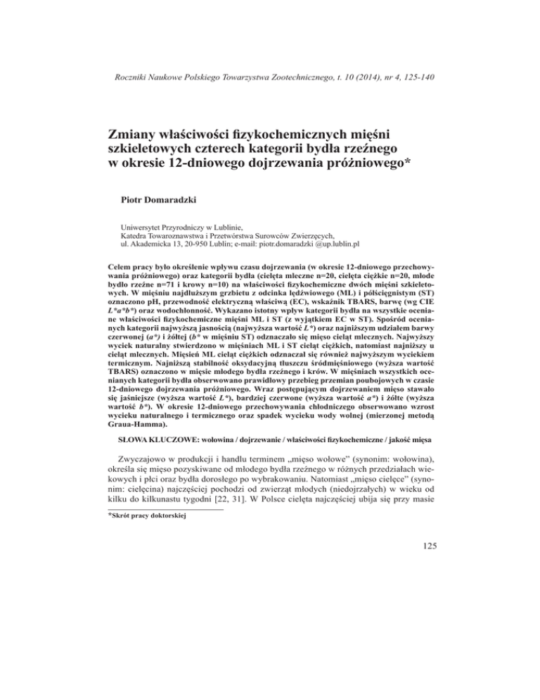 Roczniki Naukowe Polskiego Towarzystwa Zootechnicznego, t. 10 (2014), nr 4, 125-140 Zmiany właściwości fizykochemicznych mięśni szkieletowych czterech kategorii bydła rzeźnego w okresie 12-dniowego dojrzewania próżniowego* Piotr Domaradzki Uniwersytet Przyrodniczy w Lublinie, Katedra Towaroznawstwa i Przetwórstwa Surowców Zwierzęcych, ul. Akademicka 13, 20-950 Lublin; e-mail: piotr.domaradzki @up.lublin.pl Celem pracy było określenie wpływu czasu dojrzewania (w okresie 12-dniowego przechowywania próżniowego) oraz kategorii bydła (cielęta mleczne n=20, cielęta ciężkie n=20, młode bydło rzeźne n=71 i krowy n=10) na właściwości fizykochemiczne dwóch mięśni szkieletowych. W mięśniu najdłuższym grzbietu z odcinka lędźwiowego (ML) i półścięgnistym (ST) oznaczono pH, przewodność elektryczną właściwą (EC), wskaźnik TBARS, barwę (wg CIE L*a*b*) oraz wodochłonność. Wykazano istotny wpływ kategorii bydła na wszystkie oceniane właściwości fizykochemiczne mięśni ML i ST (z wyjątkiem EC w ST). Spośród ocenianych kategorii najwyższą jasnością (najwyższa wartość L*) oraz najniższym udziałem barwy czerwonej (a*) i żółtej (b* w mięśniu ST) odznaczało się mięso cieląt mlecznych. Najwyższy wyciek naturalny stwierdzono w mięśniach ML i ST cieląt ciężkich, natomiast najniższy u cieląt mlecznych. Mięsień ML cieląt ciężkich odznaczał się również najwyższym wyciekiem termicznym. Najniższą stabilność oksydacyjną tłuszczu śródmięśniowego (wyższa wartość TBARS) oznaczono w mięsie młodego bydła rzeźnego i krów. W mięśniach wszystkich ocenianych kategorii bydła obserwowano prawidłowy przebieg przemian poubojowych w czasie 12-dniowego dojrzewania próżniowego. Wraz postępującym dojrzewaniem mięso stawało się jaśniejsze (wyższa wartość L*), bardziej czerwone (wyższa wartość a*) i żółte (wyższa wartość b*). W okresie 12-dniowego przechowywania chłodniczego obserwowano wzrost wycieku naturalnego i termicznego oraz spadek wycieku wody wolnej (mierzonej metodą Graua-Hamma). SŁOWA KLUCZOWE: wołowina / dojrzewanie / właściwości fizykochemiczne / jakość mięsa Zwyczajowo w produkcji i handlu terminem „mięso wołowe” (synonim: wołowina), określa się mięso pozyskiwane od młodego bydła rzeźnego w różnych przedziałach wiekowych i płci oraz bydła dorosłego po wybrakowaniu. Natomiast „mięso cielęce” (synonim: cielęcina) najczęściej pochodzi od zwierząt młodych (niedojrzałych) w wieku od kilku do kilkunastu tygodni [22, 31]. W Polsce cielęta najczęściej ubija się przy masie *Skrót pracy doktorskiej 125 P. Domaradzki ciała około 80 kg, którą osiągają w wieku 50-60 dni. Jednakże zgodnie z obowiązującymi regulacjami [29], terminem „cielęcina” może być określane mięso pochodzące z uboju zwierząt do 8. miesiąca życia. Jeżeli ubój nastąpił między 8. a 12. miesiącem życia, pozyskane mięso występuje pod nazwą „młoda wołowina”, natomiast mięso ze zwierząt starszych niż 12-miesięczne należy określać mianem „wołowina”. W niektórych krajach, utrzymujących dużą populację bydła ras mięsnych, ubojowi poddaje się cielęta odchowywane przy matkach na pastwisku do wieku 7-8 miesięcy. W zależności od rasy, uzyskują one masę ciała w granicach 200-300 kg. W Polsce ta kategoria bydła, chociaż jeszcze mało znana, w opinii badaczy [8, 12, 21] powinna być przedmiotem zainteresowania przemysłu mięsnego. Bezpośrednio po uboju mięso zwierząt rzeźnych nie stanowi pełnowartościowego produktu spożywczego, ze względu na szereg cech wyraźnie obniżających jego wartość. Mięso takie jest twarde, gumowate, niesoczyste, trudno w nim przeprowadzić właściwą obróbkę termiczną, jest ciężko strawne, a jego składniki są w niedostatecznym stopniu przyswajalne [18]. Istotnym elementem, o którym należy pamiętać przy pozyskiwaniu wołowiny kulinarnej jest zastosowanie odpowiednio długiego okresu dojrzewania mięsa. Proces ten zachodzi podczas przechowywania mięsa po stężeniu pośmiertnym w niskiej temperaturze, ale wyższej od punktu zamarzania [25]. Spośród wszystkich dostępnych metod, dojrzewanie wydaje się być jednym z najmniej skomplikowanych zabiegów prowadzących do wzrostu przydatności konsumpcyjnej i technologicznej mięsa. Najczęściej ocenianymi parametrami jakościowymi mięsa są: pH, wyciek naturalny i termiczny, wodochłonność, barwa (jasność, barwa czerwona i żółta), siła cięcia (WB-SF), długość sarkomerów, jak również podstawowy skład chemiczny [4]. Wśród właściwości fizykochemicznych decydującą rolę ma kwasowość, określana na podstawie pomiaru pH. Wskaźnik ten jest prosty do oznaczenia i dobrze charakteryzuje przydatność technologiczną oraz kulinarną mięsa [2, 34]. Z kolei barwa wołowiny podczas zakupu jest najważniejszym kryterium oceny wizualnej. Oceniana przez konsumentów przed kruchością i smakowitością, stanowi widoczną wskazówkę jakości i świeżości mięsa [3]. Celem pracy było określenie wpływu czasu dojrzewania (w okresie 12-dniowego przechowywania próżniowego) oraz kategorii bydła na pH, przewodność elektryczną właściwą, barwę, wodochłonność oraz stabilność oksydacyjną dwóch mięśni szkieletowych: najdłuższego grzbietu z odcinka lędźwiowego (m. longissimus lumborum) i półścięgnistego (m. semitendinosus). Materiał i metody Badania przeprowadzono na próbach z dwóch mięśni szkieletowych: najdłuższego grzbietu z odcinka lędźwiowego (m. longissimus lumborum – ML) i półścięgnistego (m. semitendinosus – ST), pobranych ze 121 tusz bydła z chowu masowego, zróżnicowanego rasowo. Wśród ocenianej populacji wyróżniono następujące kategorie: – cielęta mleczne (w wieku 8-12 tygodni, o średniej masie przedubojowej 92,3 ±10,6 kg, żywione mlekiem lub preparatami mlekozastępczym